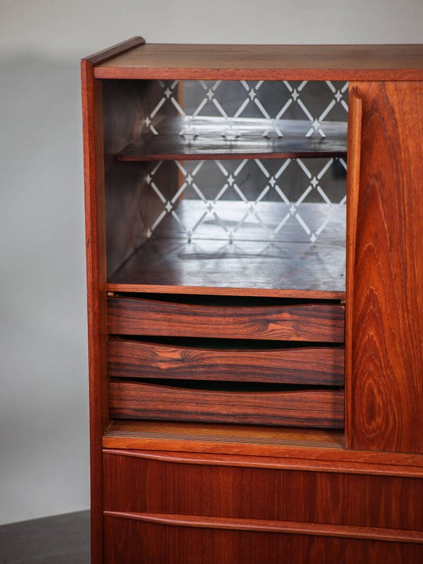 Prachtig teakhouten sideboard/highboard uit Denemarken, jaren '60. Een mooi ontwerp met stijlvolle handgrepen en een palissander houten bargedeelte met spiegel, schuine plank voor glaswerk en stijlvolle lades met groene bekleding. De kast biedt veel opbergruimte met de vele planken achter de schuifdeuren en de grote lades.