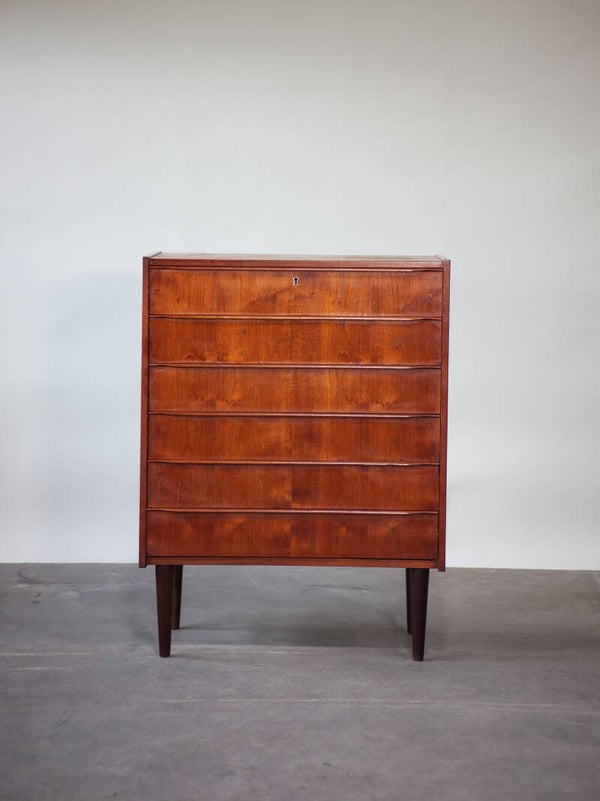 Prachtige ladekast met stijlvolle greepjes uit Denemarken, jaren '60. Met zes lades biedt de kast veel opbergruimte. Deze teakhouten kast verkeert in goede staat met lichte sporen van gebruik.