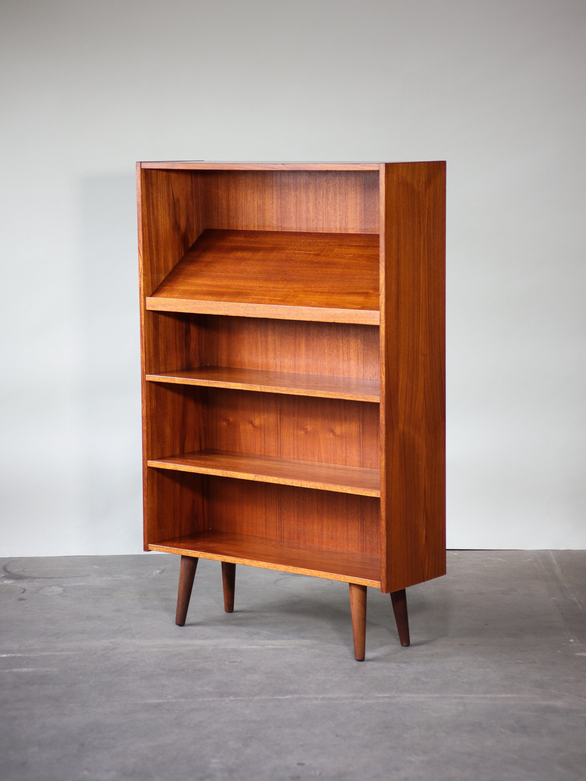 Unieke hoge teakhouten boekenkast met bovenaan een schuine plank om tijdschriften, boeken of LP's op ten toon te stellen. Daardoor is de kast erg geschikt voor in een winkel of wachtruimte, maar natuurlijk ook een toffe eyecatcher voor in huis! De planken zijn in hoogte verstelbaar.