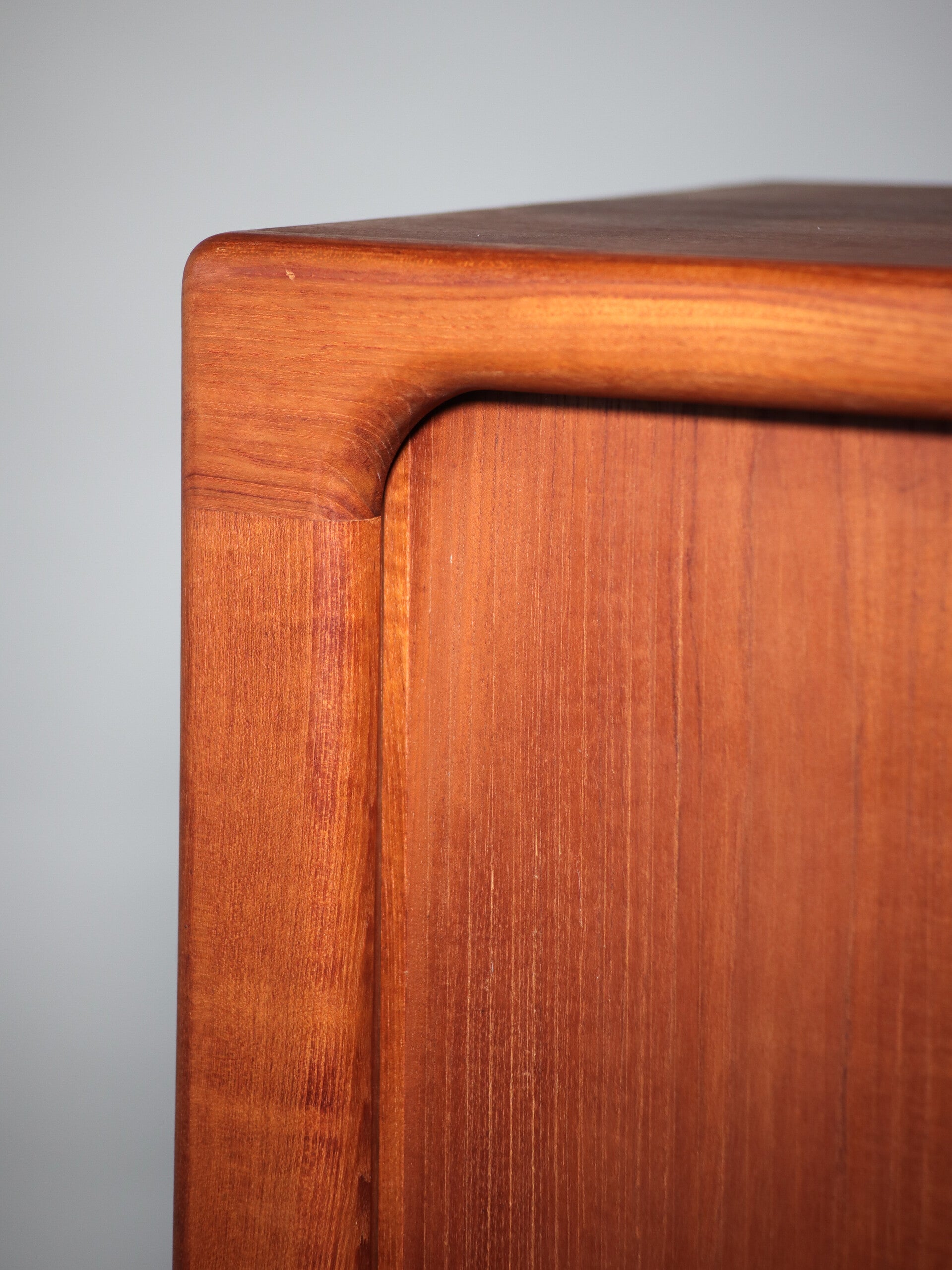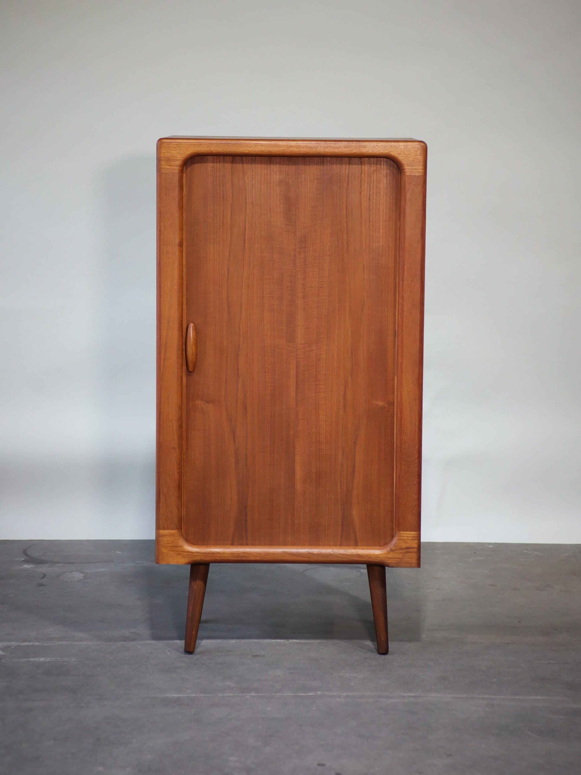Prachtige smalle hoge kast, geproduceerd in Denemarken in de jaren '60 door fabrikant Dyrlund. Deze kast is van hoge kwaliteit teakhout en heeft een zeer stijlvol en uniek design met een roldeur en bijzondere afgeronde hoeken. De schuifdeur/roldeur rolt prachtig weg in de kast. Deze kast is bijvoorbeeld goed te gebruiken als halkast, schoenenkast of boekenkast.
