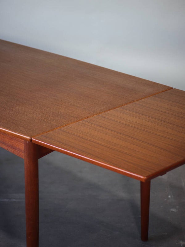 Uitschuifbare teakhouten eettafel uit Denemarken, jaren '60. Deze zeer ruime rechthoekige tafel heeft prachtige afgronde vormen en loopt licht ovaal (Deens ovaal).