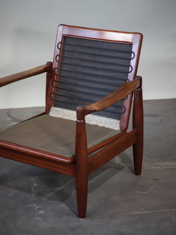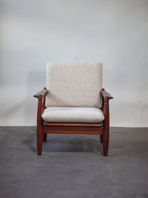 Prachtige vintage jaren '60 fauteuil van het Nederlandse merk De Ster Gelderland. Deze midcentury stoel heeft een prachtig vormgegeven kwalitatief teakhouten frame, met bol lopende rug en armleunigen. De lichte wit-grijze stof is gewassen en verkeert in goede staat.