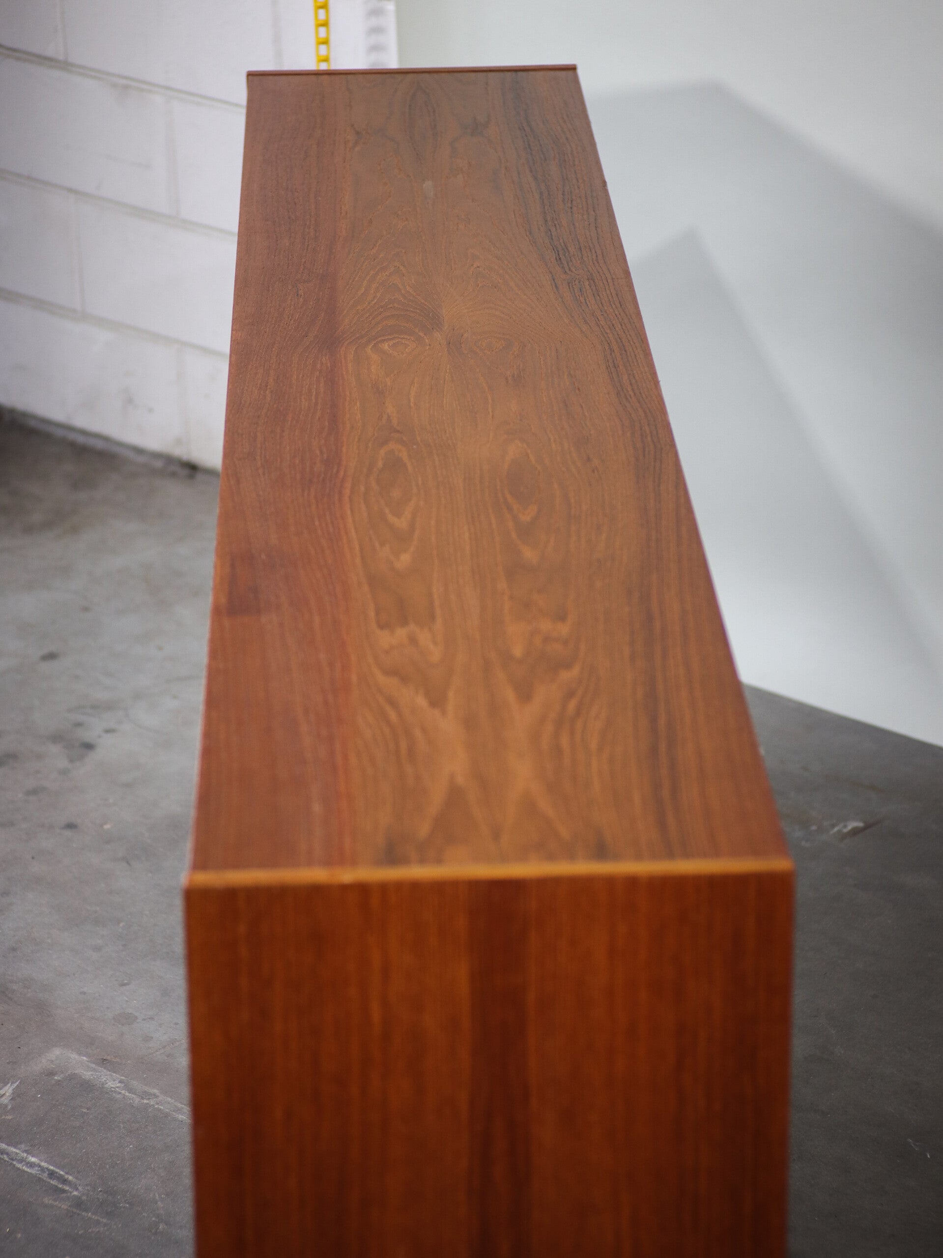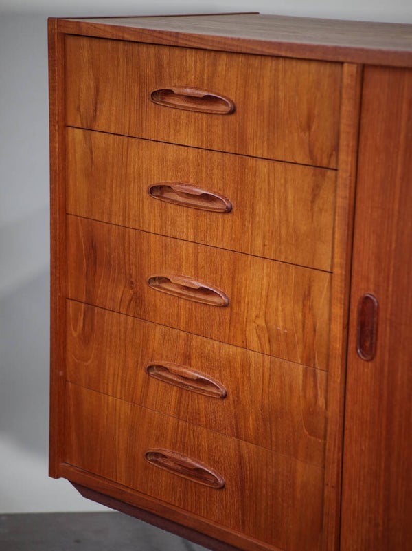 Prachtig lang sideboard uit Denemarken, jaren '60. Deze teakhouten kast heeft een unieke indeling, met vier schuifdeurtjes met daarachter planken en vijf ruime lades. Een prachtig Deens design dressoir met mooi vormgegeven greepjes. Ook goed te gebruiken als TV-meubel!