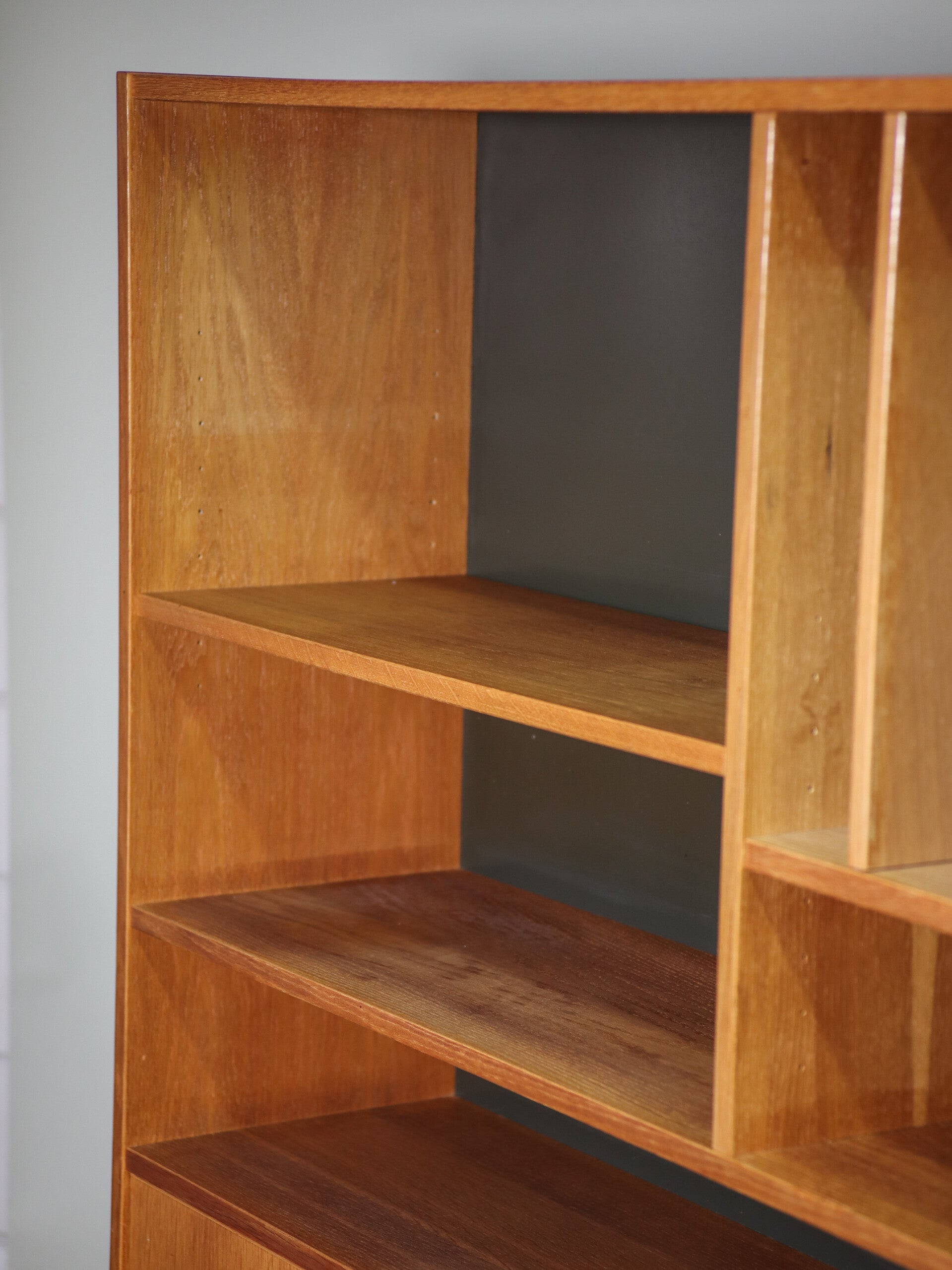 Mooie brede boekenkast/vakkenkast met vakken voor LP's. Deze eikenhouten kast is in de jaren '60 gemaakt door Domino Møbler in Denemarken. Achter de brede klep zitten ook vakken, wat dit een erg praktische kast maakt. De planken zijn in hoogte verstelbaar.