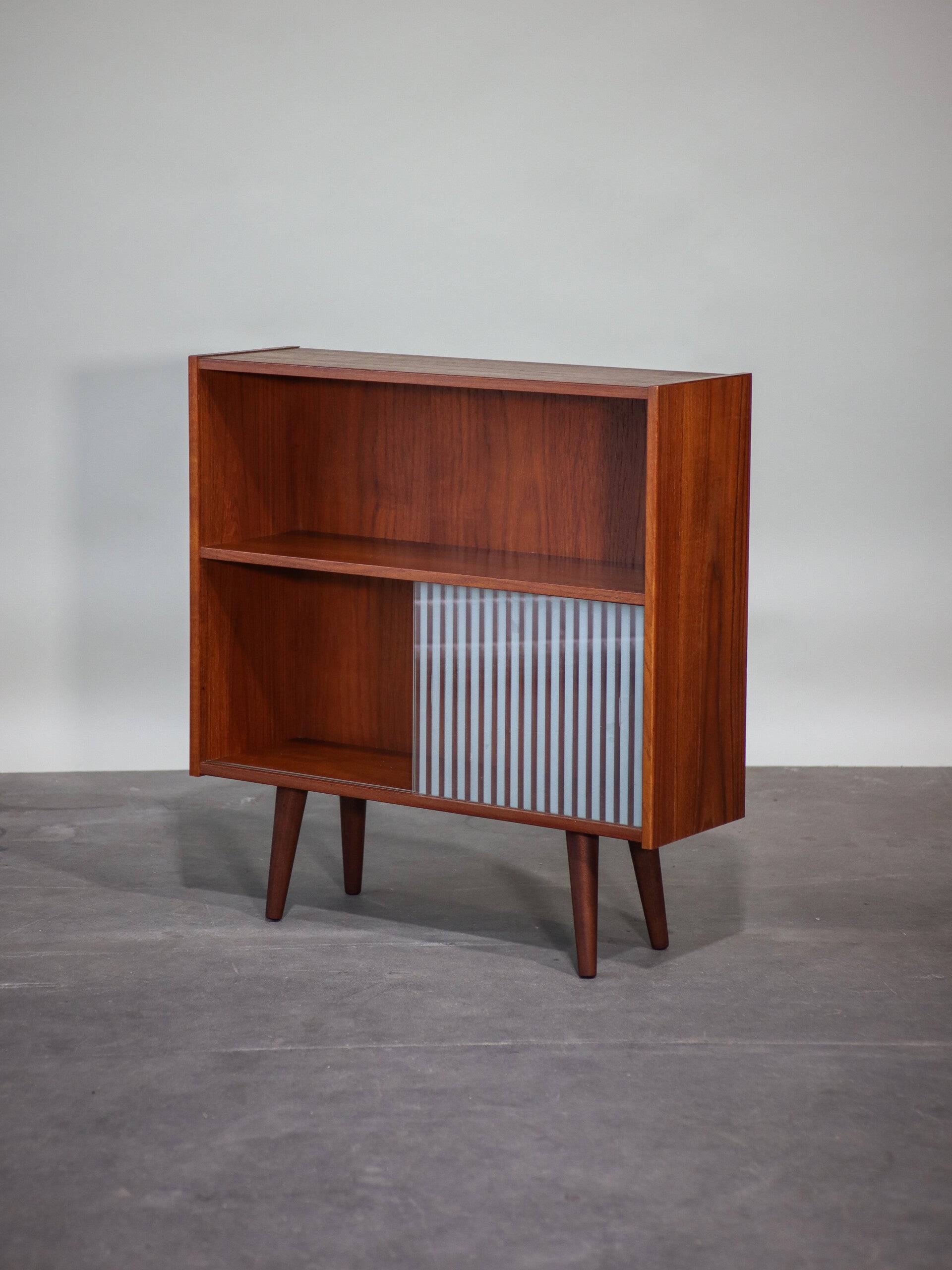 Mooi teakhouten boekenkastje met glazen schuifdeurtjes. Deze kast komt uit Denemarken, jaren '60. Doordat het glas gestreept is, kun je spullen netjes opbergen zonder dat het compleet uit het zicht is. Leuk om bijvoorbeeld als drankkastje, halkastje of boekenkast te gebruiken. De deurtjes hebben inkepingen voor je vingers, zodat ze gemakkelijk open en dicht te doen zijn.