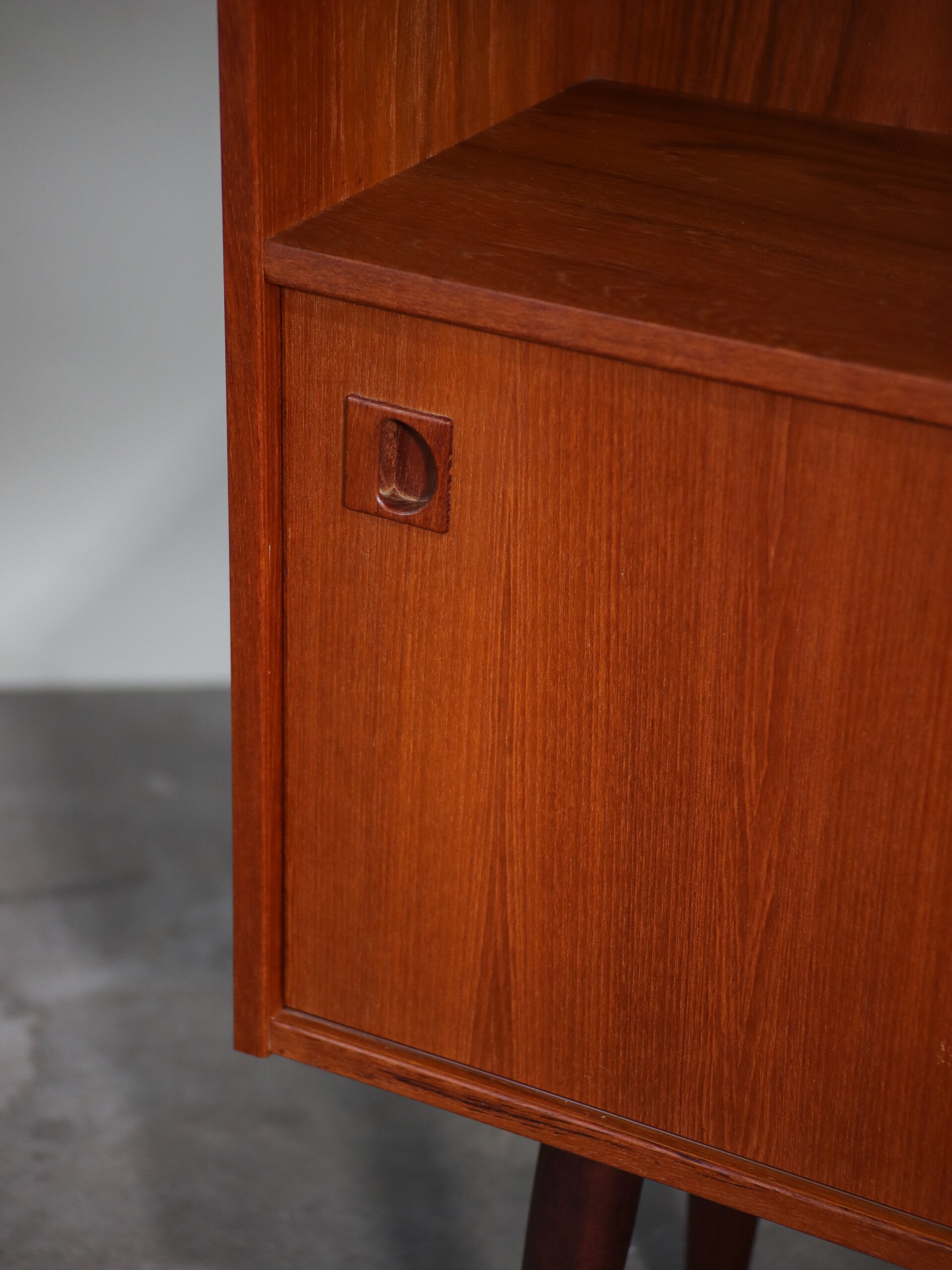 Leuke teakhouten kast met een open vak en twee houten schuifdeuren met mooie greepjes. Dit kastje komt uit Denemarken, jaren '60. De plank achter de deurtjes is in hoogte verstelbaar. Zeer geschikt als bijvoorbeeld boekenkastje, halkastje of drankkast.