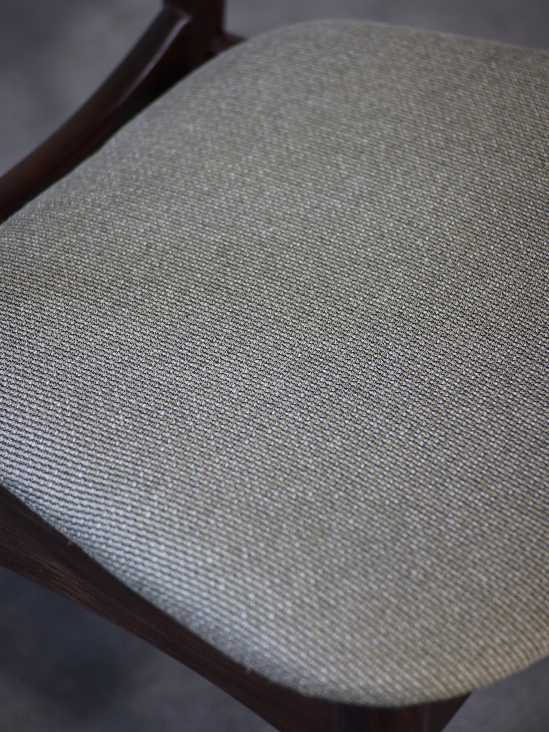 Een set van 6 prachtige Deense eetkamerstoelen uit de jaren '60. Deze mooi vormgegeven stoelen, ookwel cowhorn of oxhorn chairs genoemd, zijn gemaakt van palissanderhout. Verder zijn ze bekleed met de gemêleerde wollen kwaliteitsstof Kvadrat Hallingdal. Deze duurzame stof is ontworpen door de bekende Deense ontwerper Nanna Ditzel. De groenige kleur is een combinatie van grijs, groen en zwart, wat zorgt voor een chique en tegelijkertijd natuurlijke uitstraling.