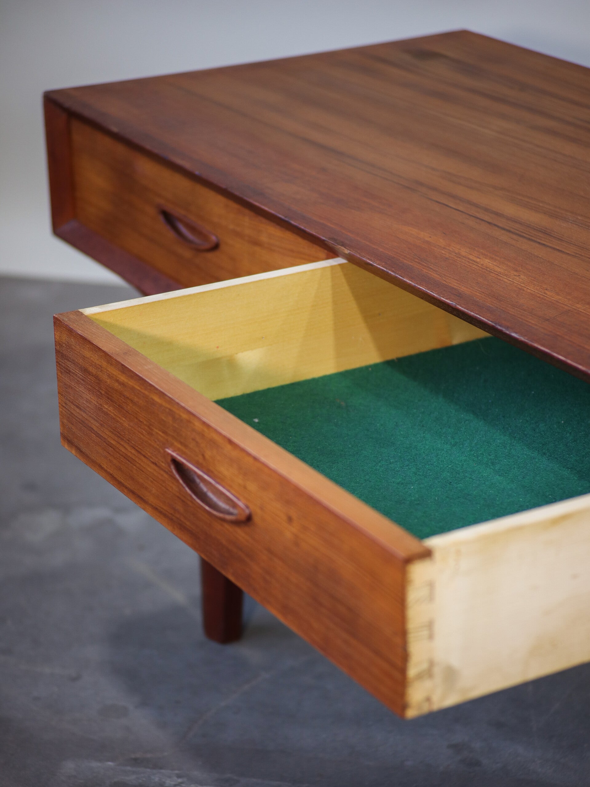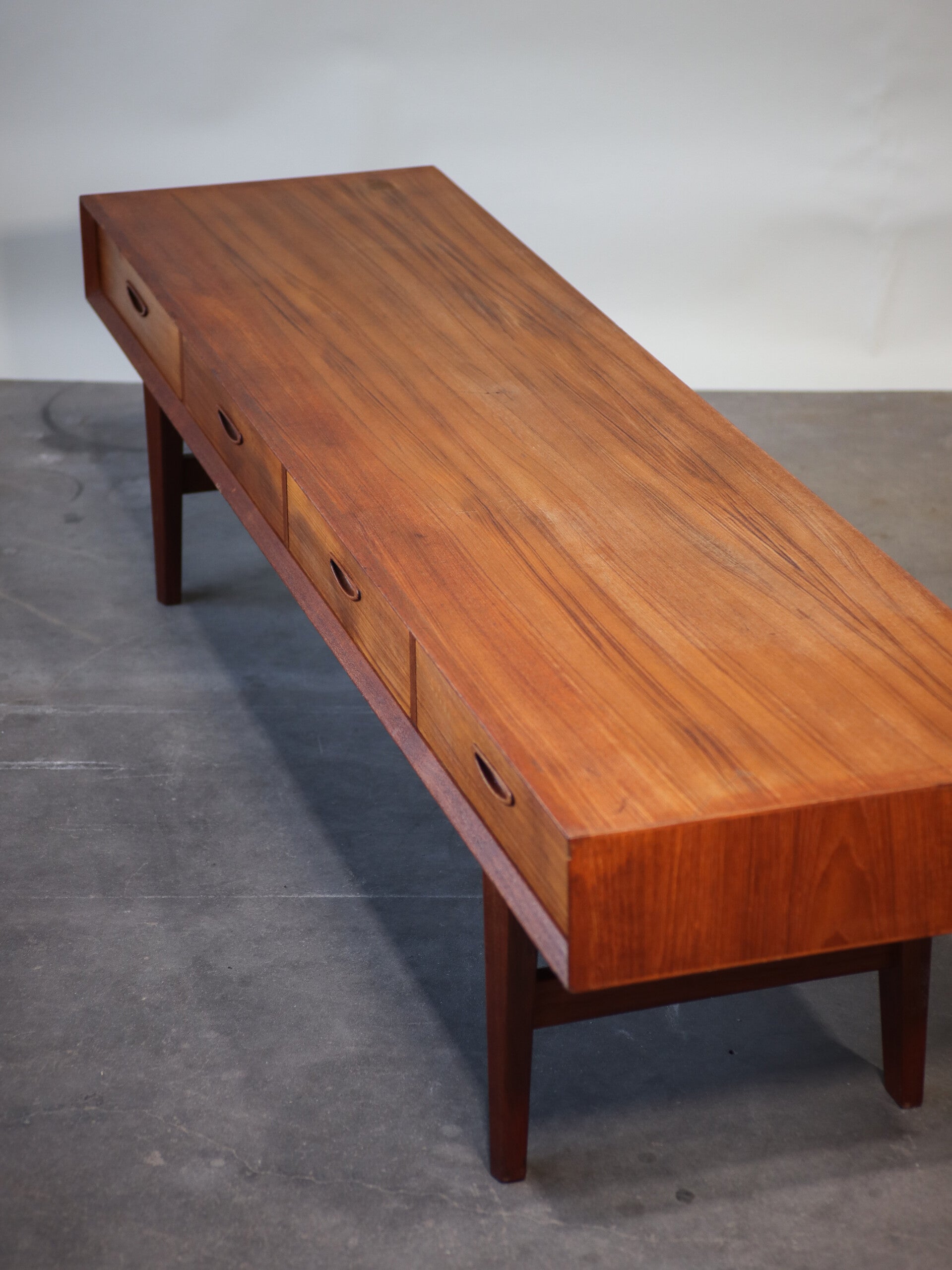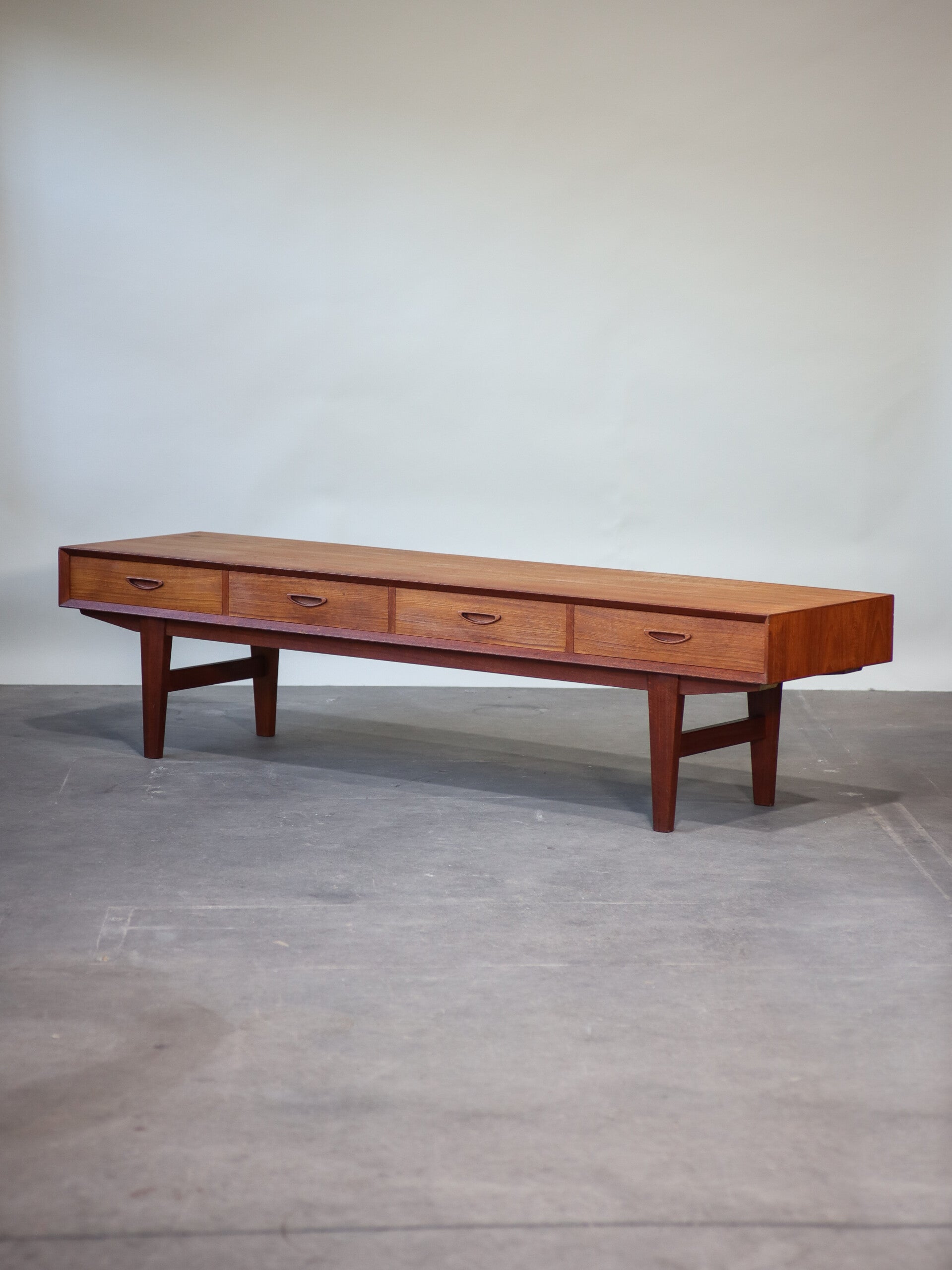 Wat een eyecatcher! Deze lage kast met vier lades is door zijn afmeting zeer uniek. De kast is gemaakt van teakhout en is geproduceerd in Denemarken in de jaren '60. Doordat dit lowboard erg stevig is en door zijn hoogte is het niet alleen geschikt als tv-meubel maar bijvoorbeeld ook als eetbank met opbergruimte. De mogelijkheden voor deze ladekast dus eindeloos!