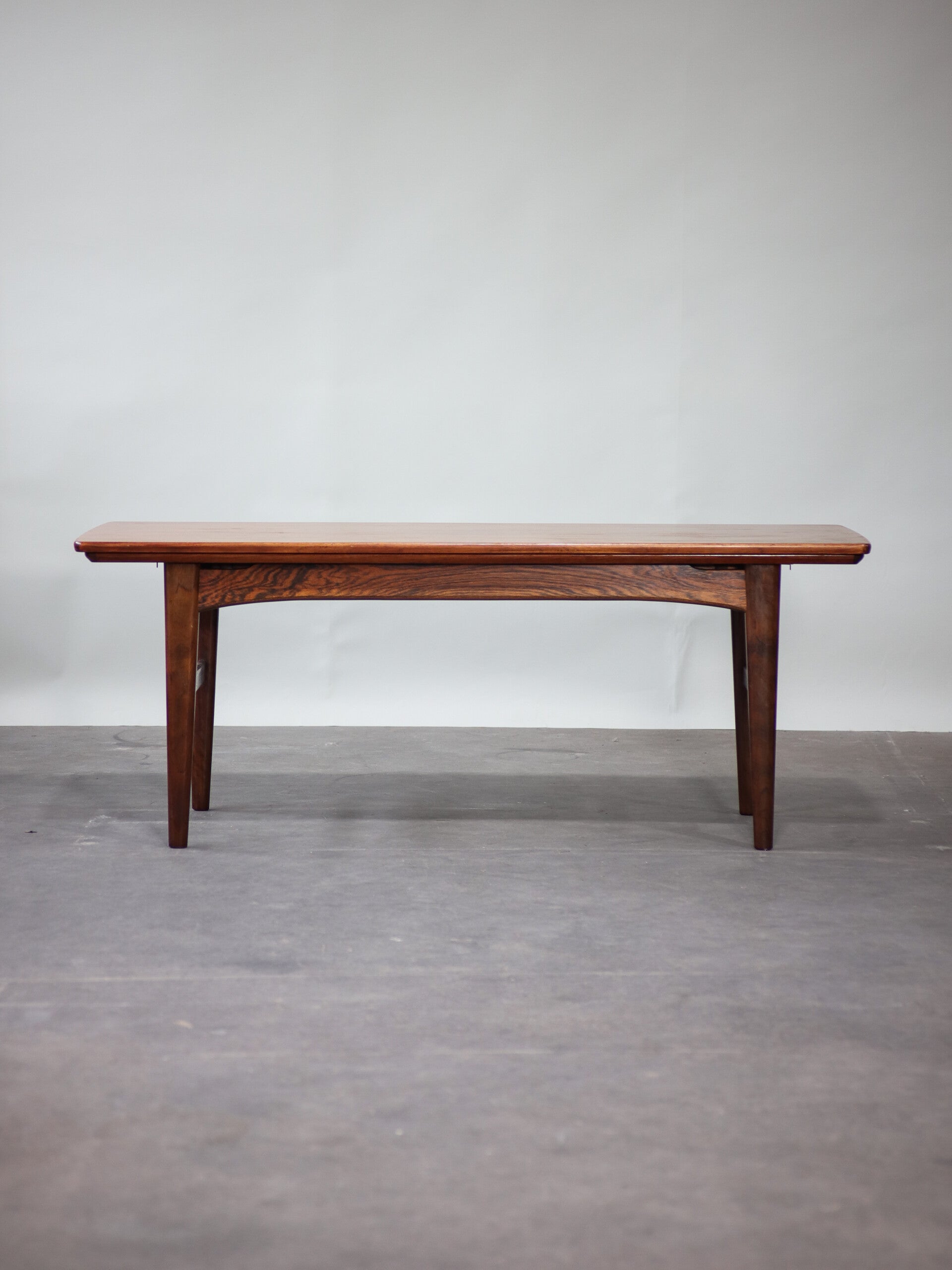 Wat een prachtig, handig en uniek meubelstuk is dit! Deze salontafel is eevoudig uit te schuiven tot een brede salontafel en daarnaast te verhogen tot eettafel. Ook wel een 'elevator' tafel of 'Copenhagen table' genoemd. Deze twee-in-een tafel is gemaakt van prachtig palissanderhout en ontworpen door de Deense ontwerper Niels Bach in de jaren '60.