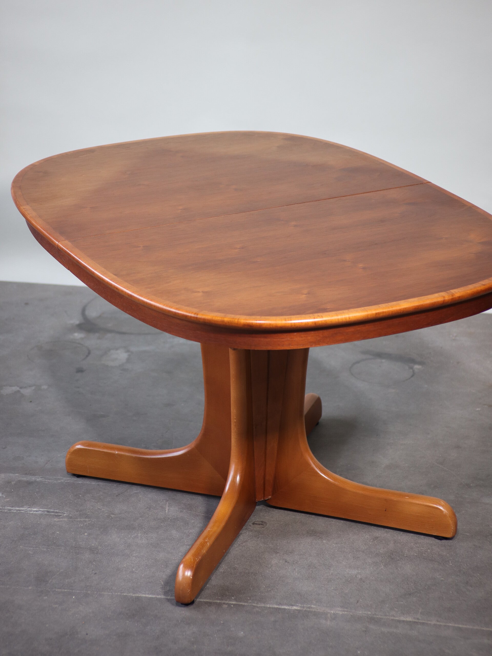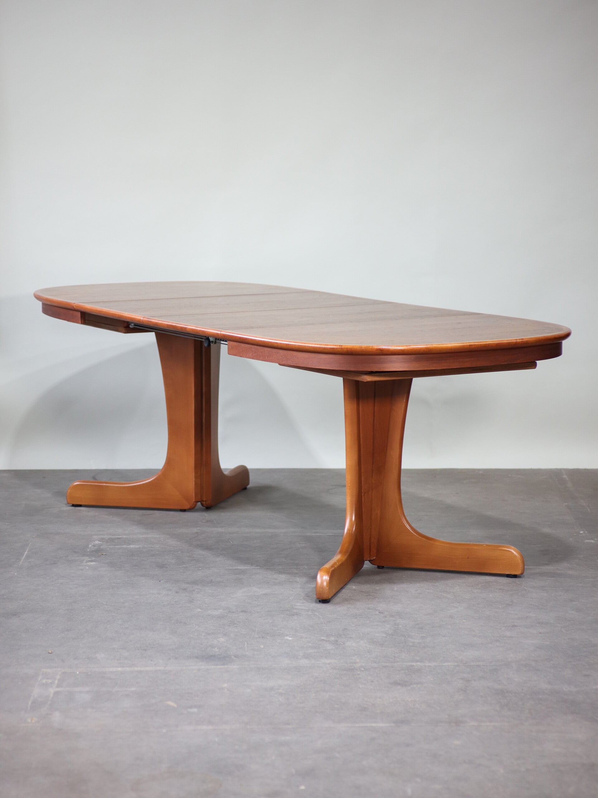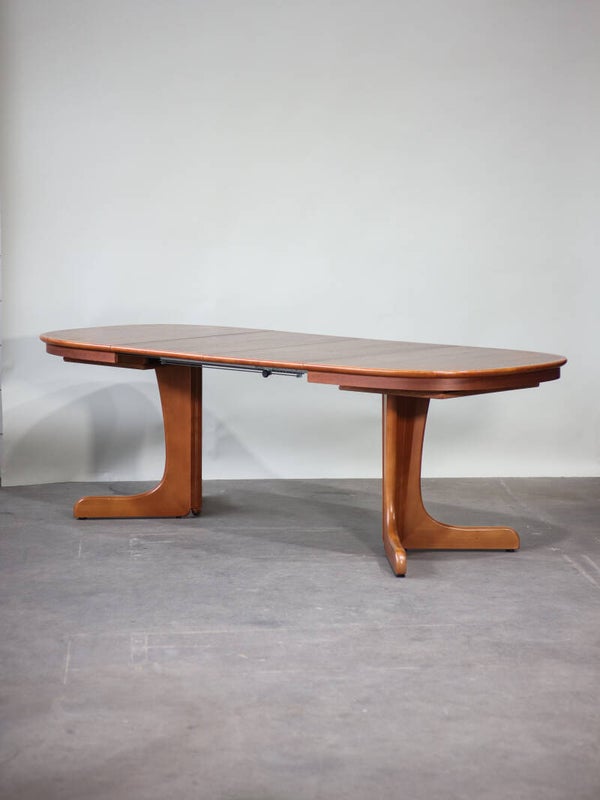 Prachtige teakhouten Deense eettafel uit de jaren '60. Deze ovale tafel is eenvoudig uit te schuiven met twee extra bladen. Deze bladen zijn onderin de tafel op te bergen, zeer praktisch!