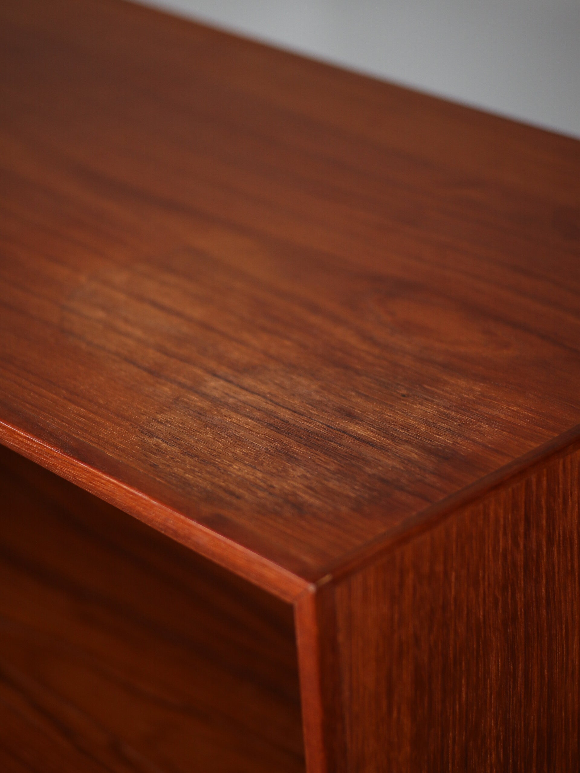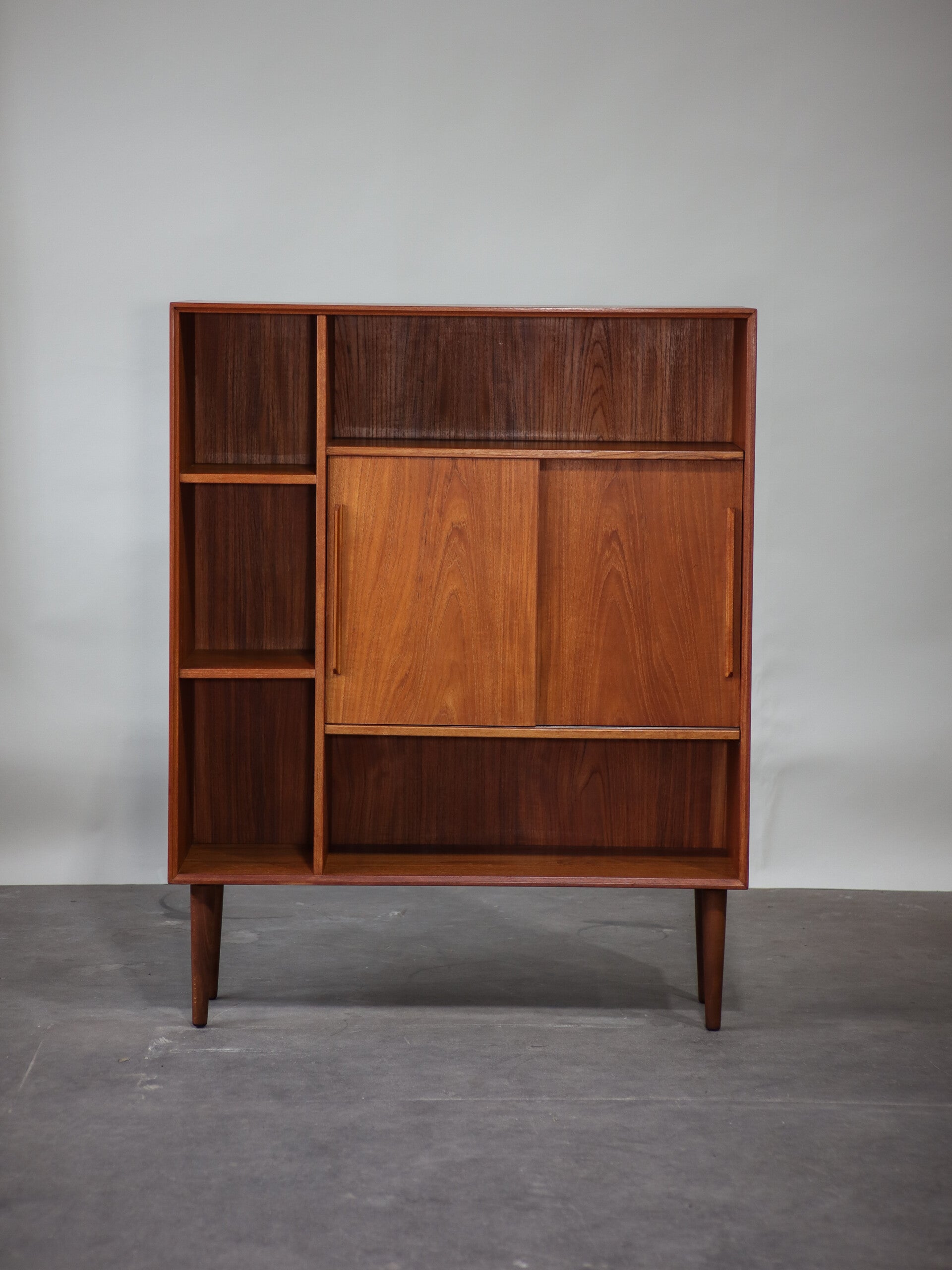Vakkenkast met een unieke indeling! Deze teakhouten boekenkast is geproduceerd in Denemarken, jaren '60. De kast heeft een prachtig vormgegeven omlijsting en mooie lange houten greepjes op de schuifdeuren. De kast heeft een minimalistische uitstraling en tegelijkertijd geven de vele vakken in verschillende groottes een speels effect. Echt een eyecatcher dus! De planken zijn in hoogte verstelbaar.