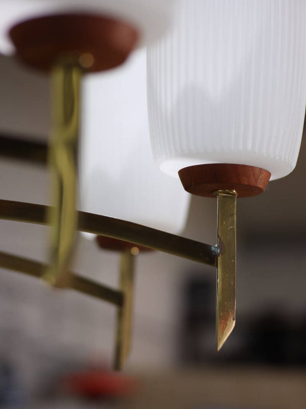 Wat een eyecatcher! Deze vintage kroonluchter heeft een zeldzaam groot formaat en maar liefst 9 lichtbronnen. De hanglamp is gemaakt van messing, teakhout en glazen kapjes van wit gesteept melkglas. De lamp dateert uit de jaren '60 en is vermoedelijk geproduceerd in Denemarken/Scandinavië.