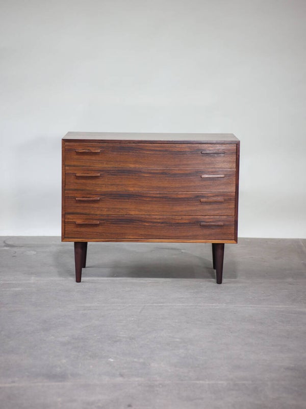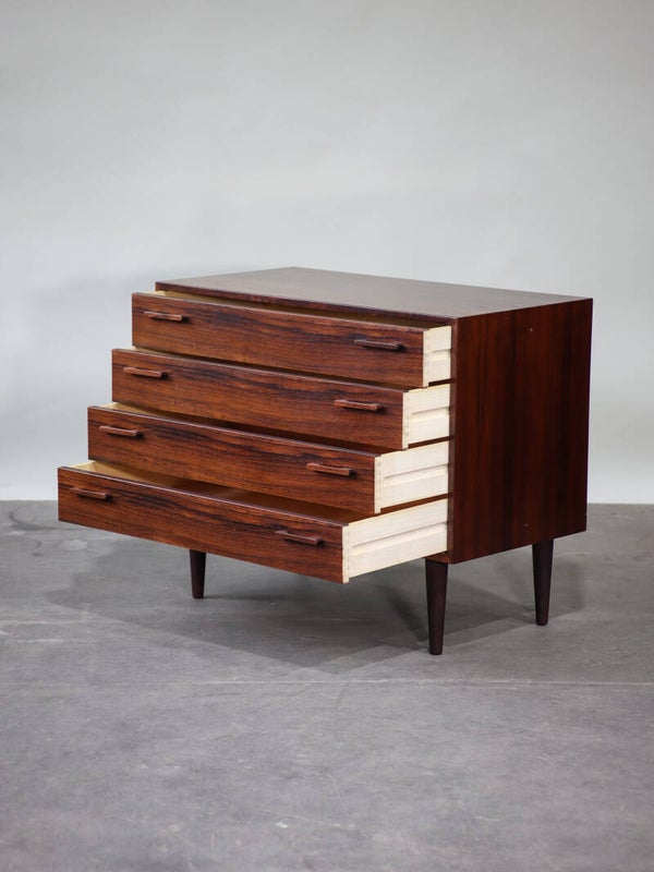 Een prachtige ladekast uit Denemarken, jaren '60. Deze stijlvolle Deense design kast is ontworpen door de bekende ontwerper Kai Kristiansen. De kast is gemaakt van palissanderhout en heeft vier lades met unieke, mooi vormgegeven greepjes.