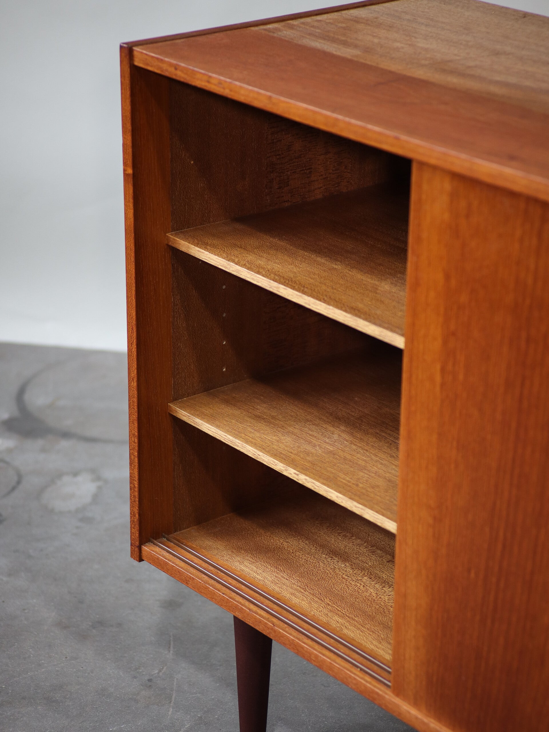 Mooi teakhouten dressoir uit Denemarken, jaren '60. Dit schuifdeurkastje heeft twee in hoogte verstelbare planken. De rechthoekige houten greepjes zijn prachtig vormgegeven. Erg leuk om bijvoorbeeld te gebruiken als platenkastje (de planken kunnen eruit), sideboard of om om te bouwen tot badkamermeubel!