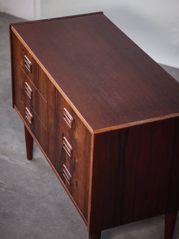 Prachtige lage ladekast uit Denemarken, jaren '60. De kast is ontworpen door de Deense Niels J. Thorsø en heeft maarliefst 6 lades met mooi vormgegeven greepjes. De dubbele rij lades maakt deze vintage kast erg uniek! Deze ladekast is gemaakt van palissanderhout met een prachtige houttekening.