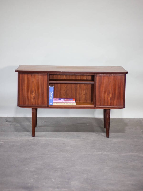 Prachtig vintage dubbelzijdig bureau uit Denemarken, jaren '60. Dit Deense bureau is gemaakt van teakhout en heeft een bijzondere vormgeving met een bolling/curve in de randen van het blad. Aan de achterkant zit een boekenkast, waardoor dit bureau erg mooi vrijstaand staat. Verder heeft het bureau vier diepe lades en een deurtje met daarachter een diep vak met plank.
