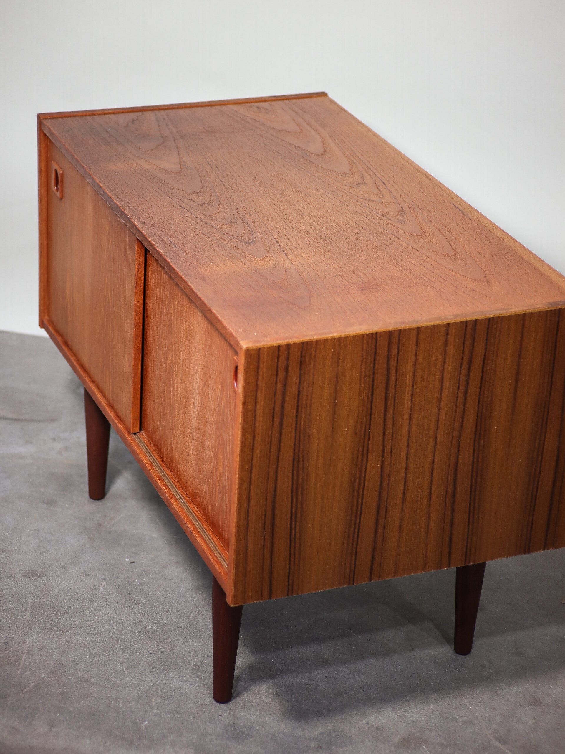 Mooi lowboard/schuifdeurkastje in een uniek laag model. Dit vintage dressoir is gemaakt van teakhout en komt uit Denemarken, jaren '60. Achter de deurtjes met mooie grepen zit een smalle, in hoogte verstelbare plank. Deze plank is er ook uit te halen, zodat de kast bijvoorbeeld te gebruiken is als platenkastje.
