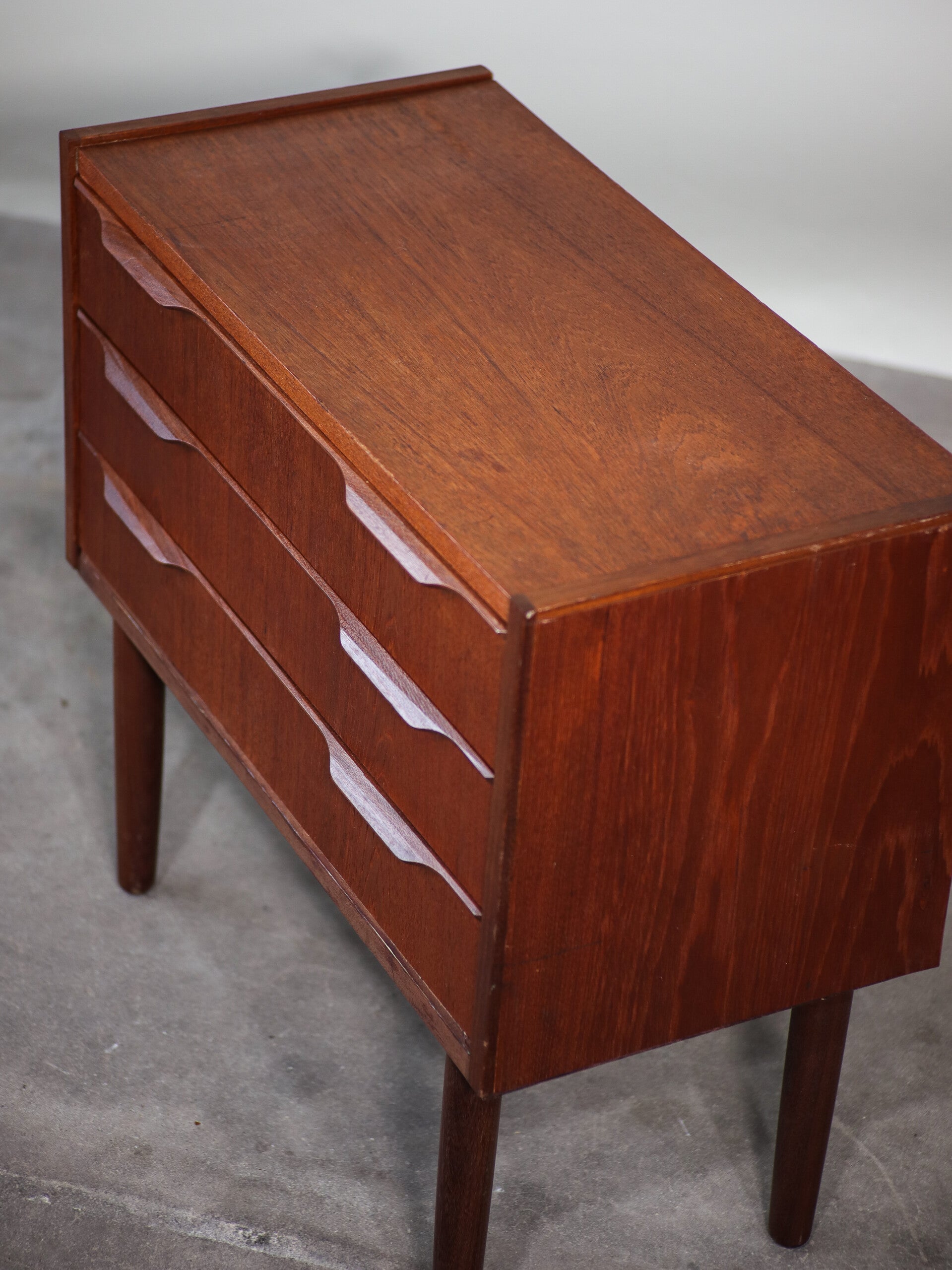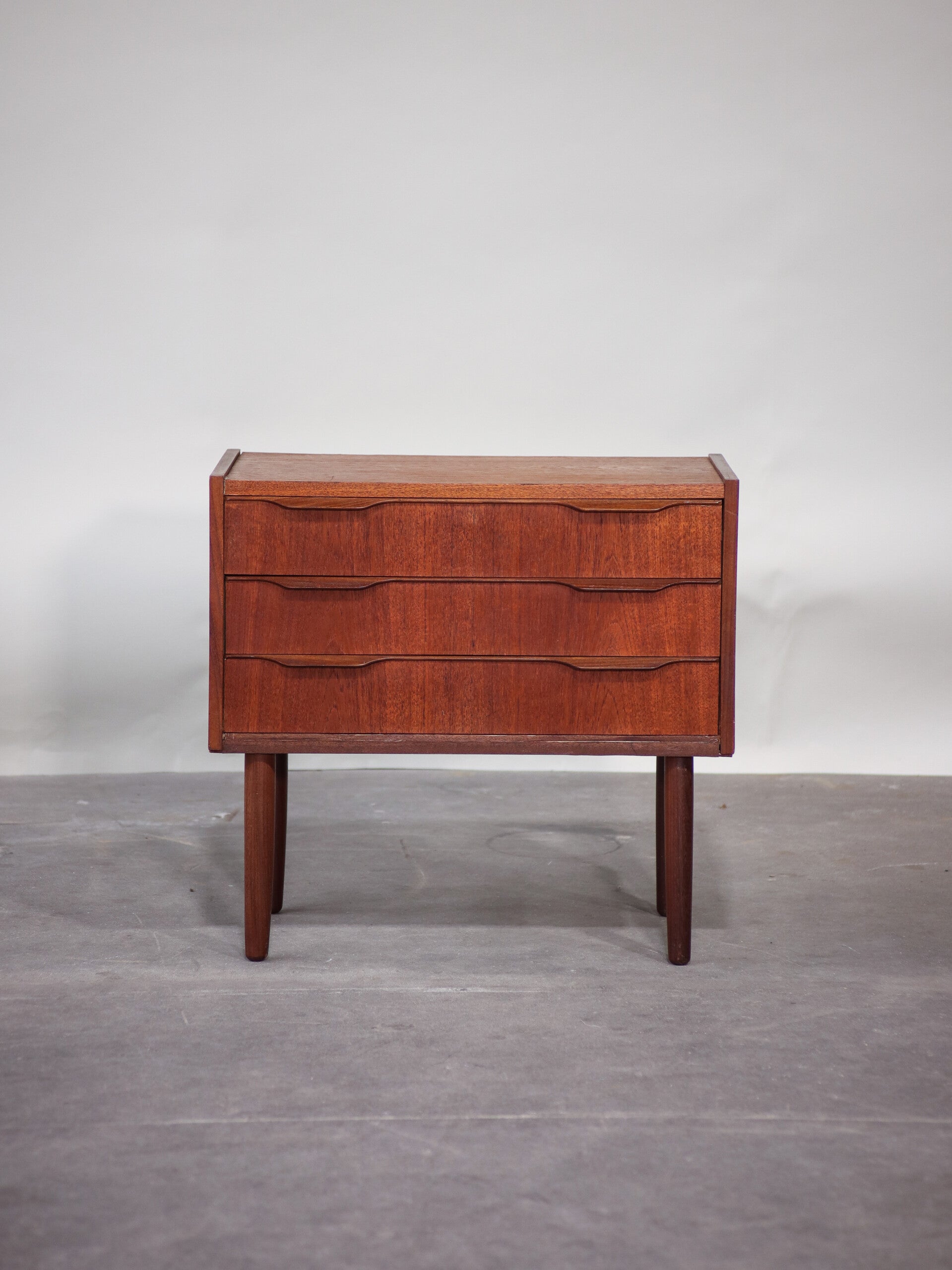 Mooie vintage ladekast uit Denemarken, jaren '60. Dit kastje met een uniek formaat is gemaakt van teakhout en heeft drie lades met prachtige greepjes.