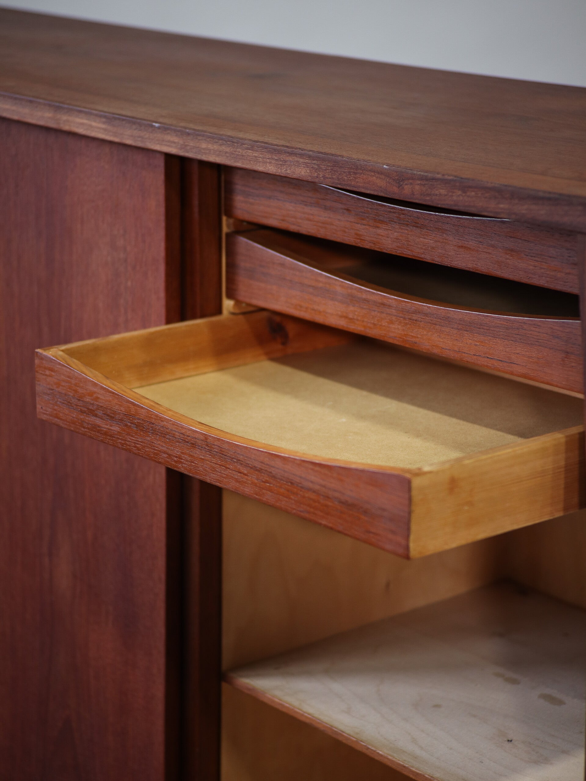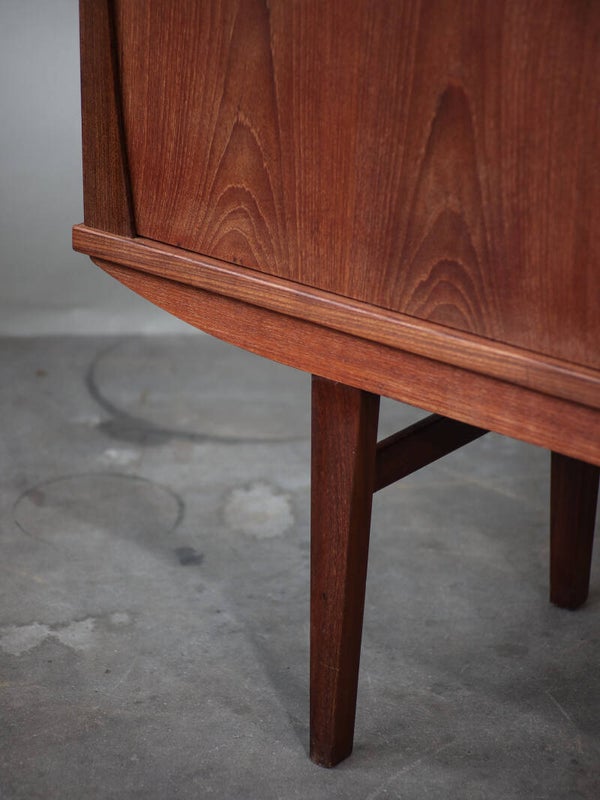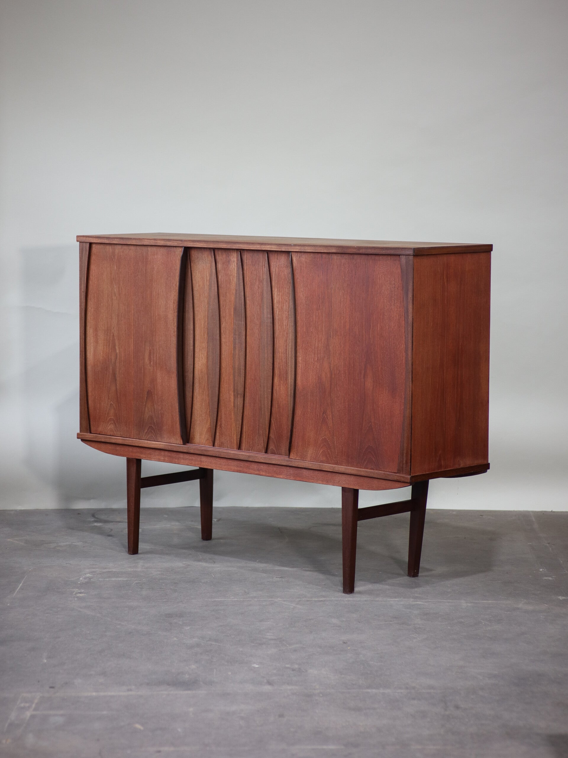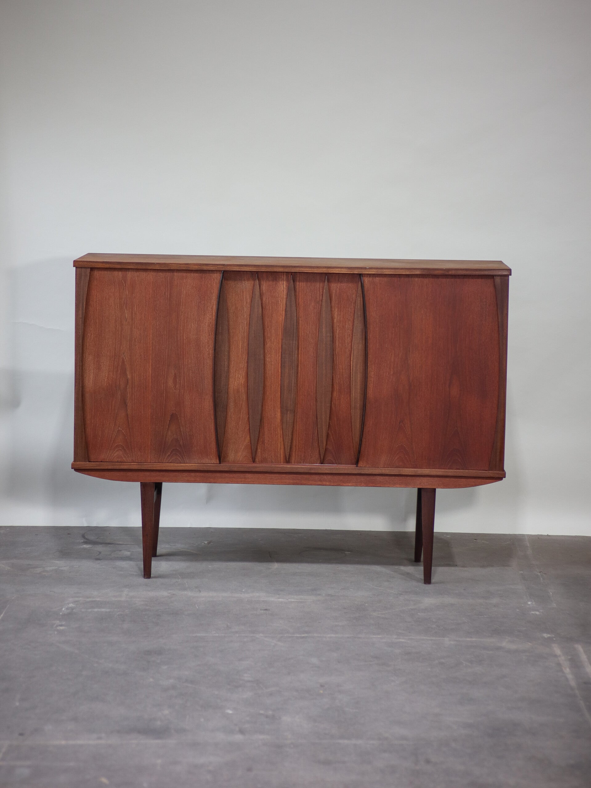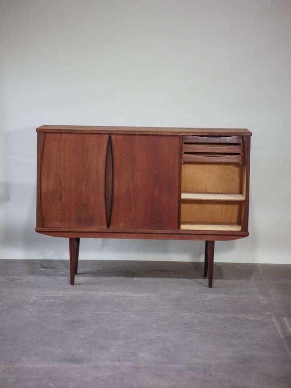 Een prachtig teakhouten dressoir met lades en planken uit Denemarken, jaren '60. Deze kast/highboard heeft een zeer unieke vormgeving, met ovale vormen op de middelste deur. Wanneer je de linker of rechter deur opzij schuift ontstaat precies dezelfde vorm. Een prachtig design met mooie details waar overna is gedacht! Staat onder andere prachtig in een minimalistisch Scandinavisch of juist een Hotel Chique interieur.