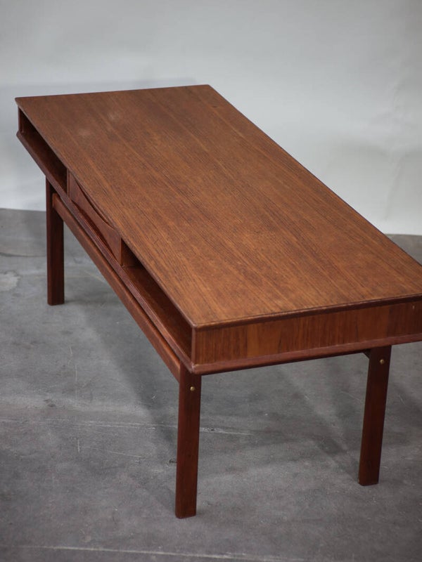 Een prachtige vintage salontafel uit Denemarken, jaren '60. Deze tafel is gemaakt van teakhout en is stijlvol vormgegeven met een mooie lade die aan beide kanten open kan. We hebben de ontwerper nog niet kunnen vinden, maar het heeft veel weg van de designs van Arne Vodder en Johannes Andersen.