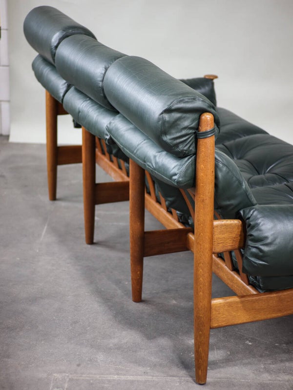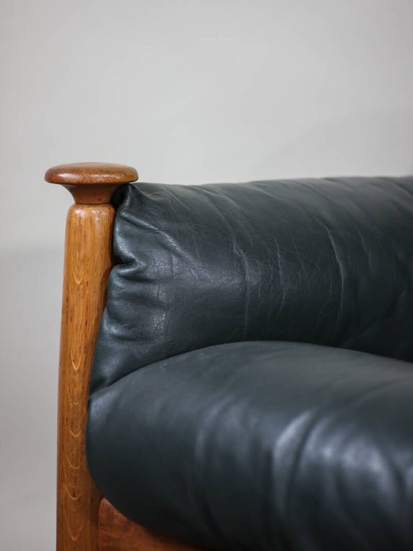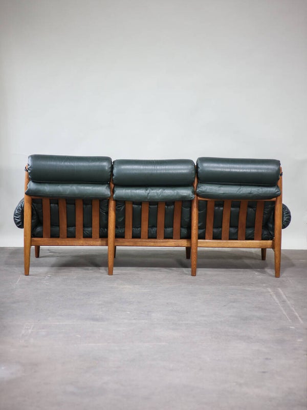 Prachtige en comfortabele vintage leren 3-zits bank, in de jaren '60 ontworpen door de Zweedse Eric Merthen voor Ire Møbler. Het frame is gemaakt van eikenhout en de bekleding van prachtig donkergroen leer. Het design doet denken aan de iconische ontwerpen van Sergio Rodrigues. Een echte midcentury eyecatcher waar je heerlijk in kunt relaxen!