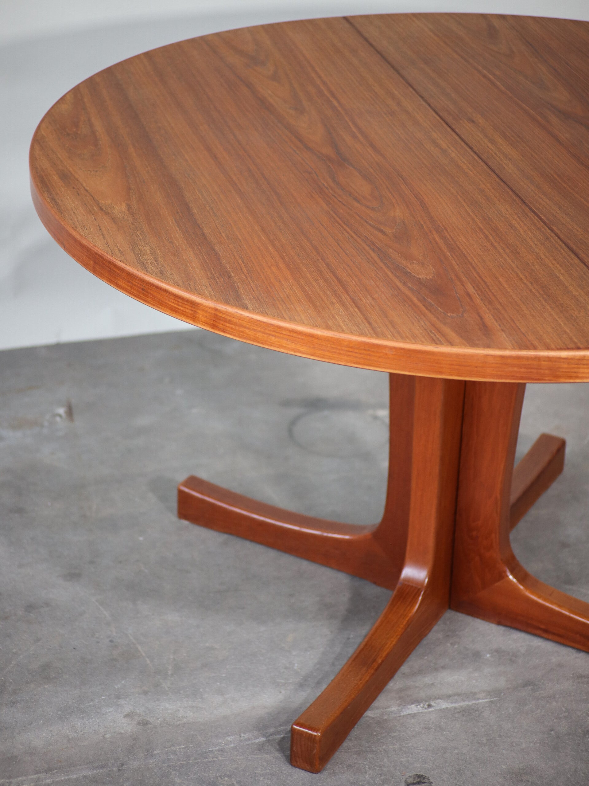 Mooie teakhouten eettafel uit Denemarken, jaren '60. Deze brede ronde tafel is met twee extra bladen uit te schuiven tot wel 220cm! De tafel heeft een prachtige stevige kruispoot en een dik blad.