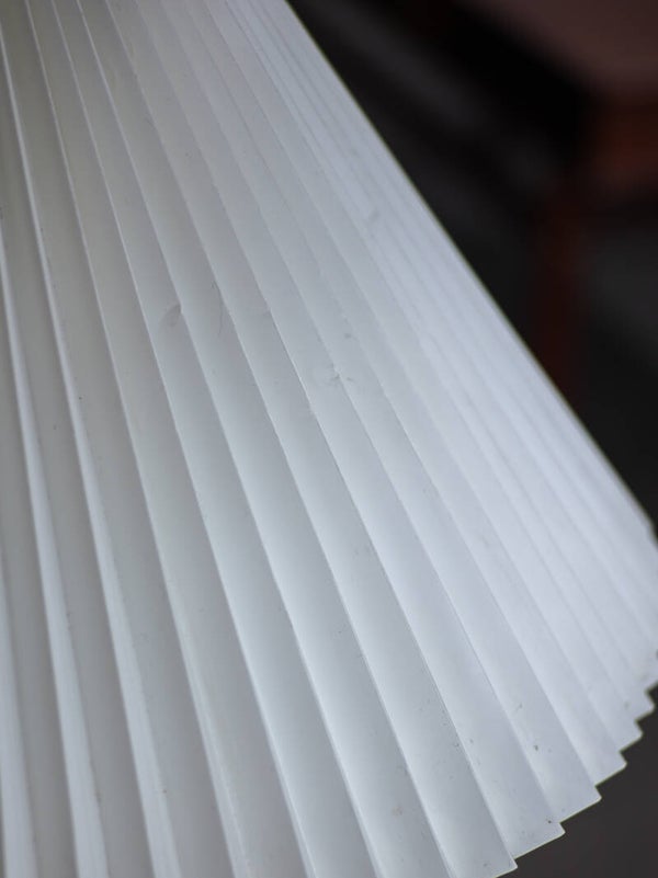 Vintage vloerlamp met witte plissé kap en messing voet, geproduceerd in Denemarken door Le Klint. Een prachtig stukje vakmanschap, want de Le Klint lampenkappen worden, tot op de dag van vandaag nog, met de hand gevouwen in Denemarken. Deze kap betreft het allereerste model van Le Klint, model 1, dat is 1901 is ontworpen. De plissé kap heeft een papieren uitstraling, maar door de speciale folie is het brand, UV en vloeistof bestendig en kan het dus schoon worden gemaakt met water.