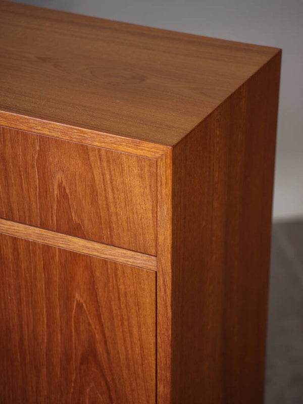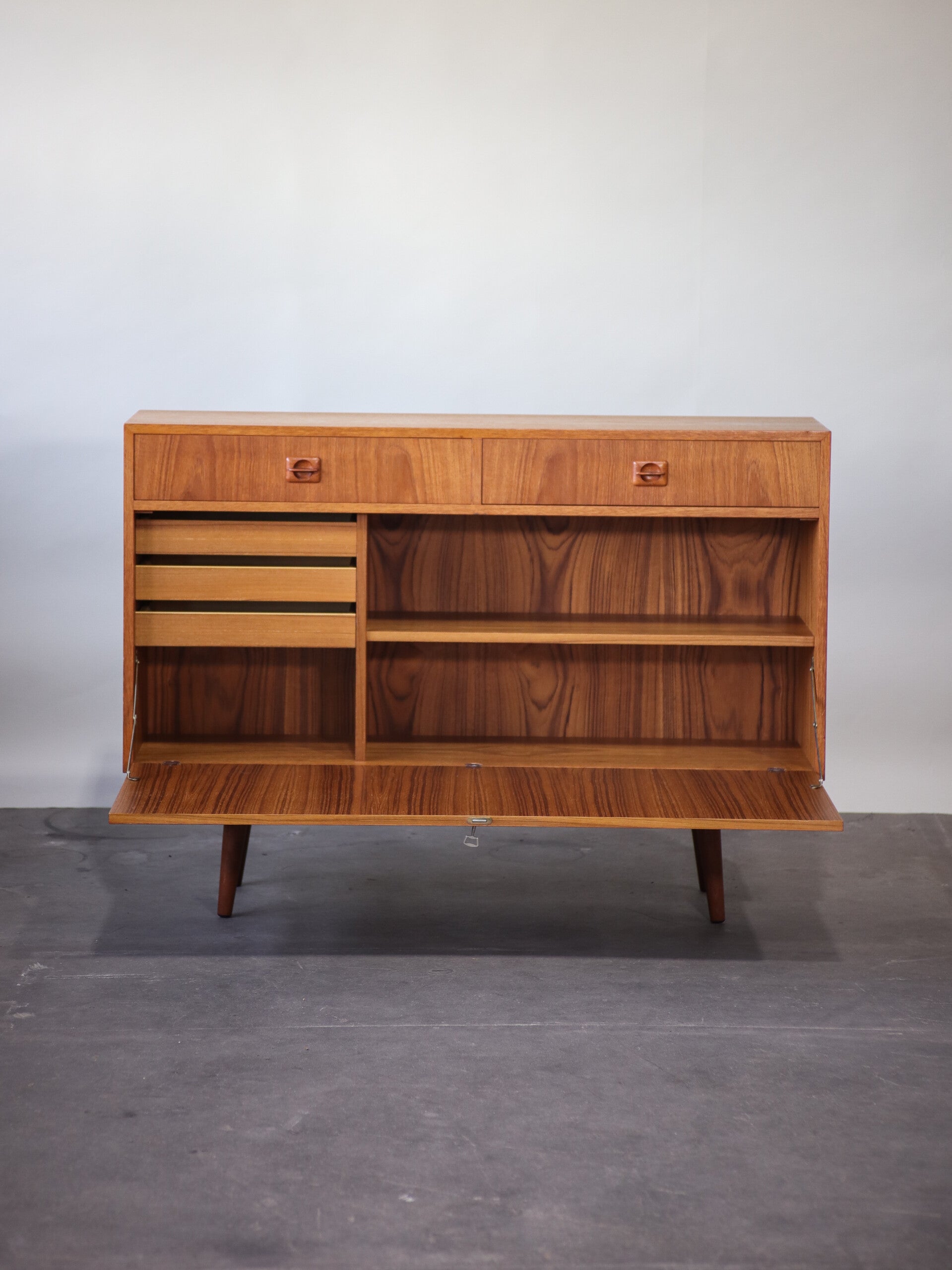 Prachtig vintage dressoir uit Denemarken, jaren '60. Deze Deense klepkast is gemaakt van teakhout met een mooie houtnerf. Achter de klep zit een in hoogte verstelbare plank en drie kleine lades. Verder heeft de kast twee ruime lades met prachtig vormgegeven houten greepjes.