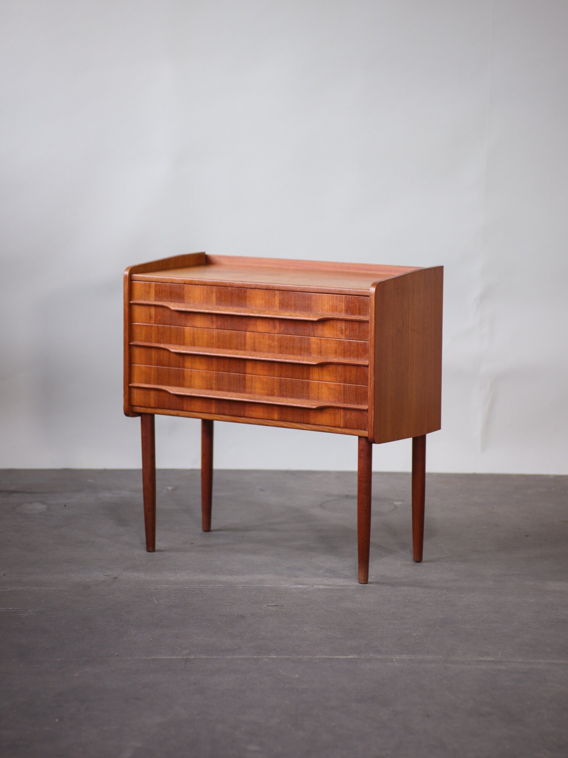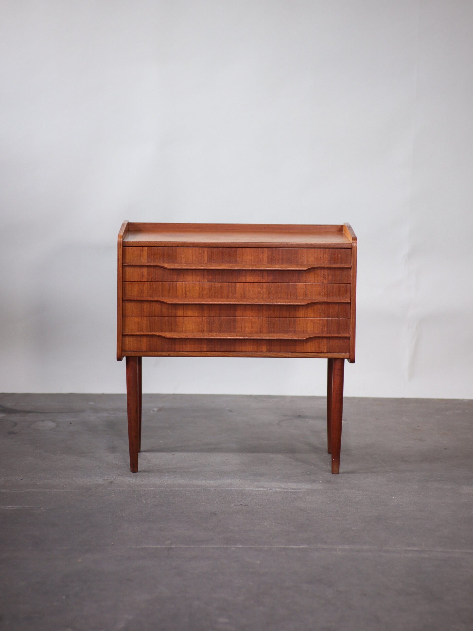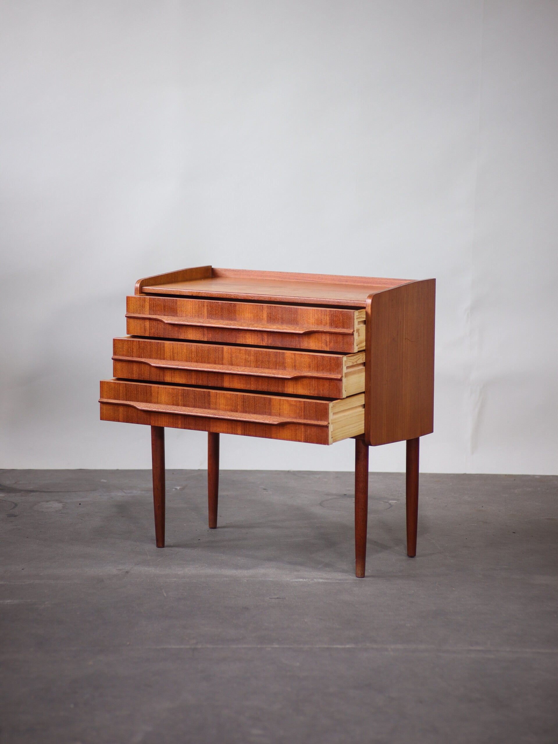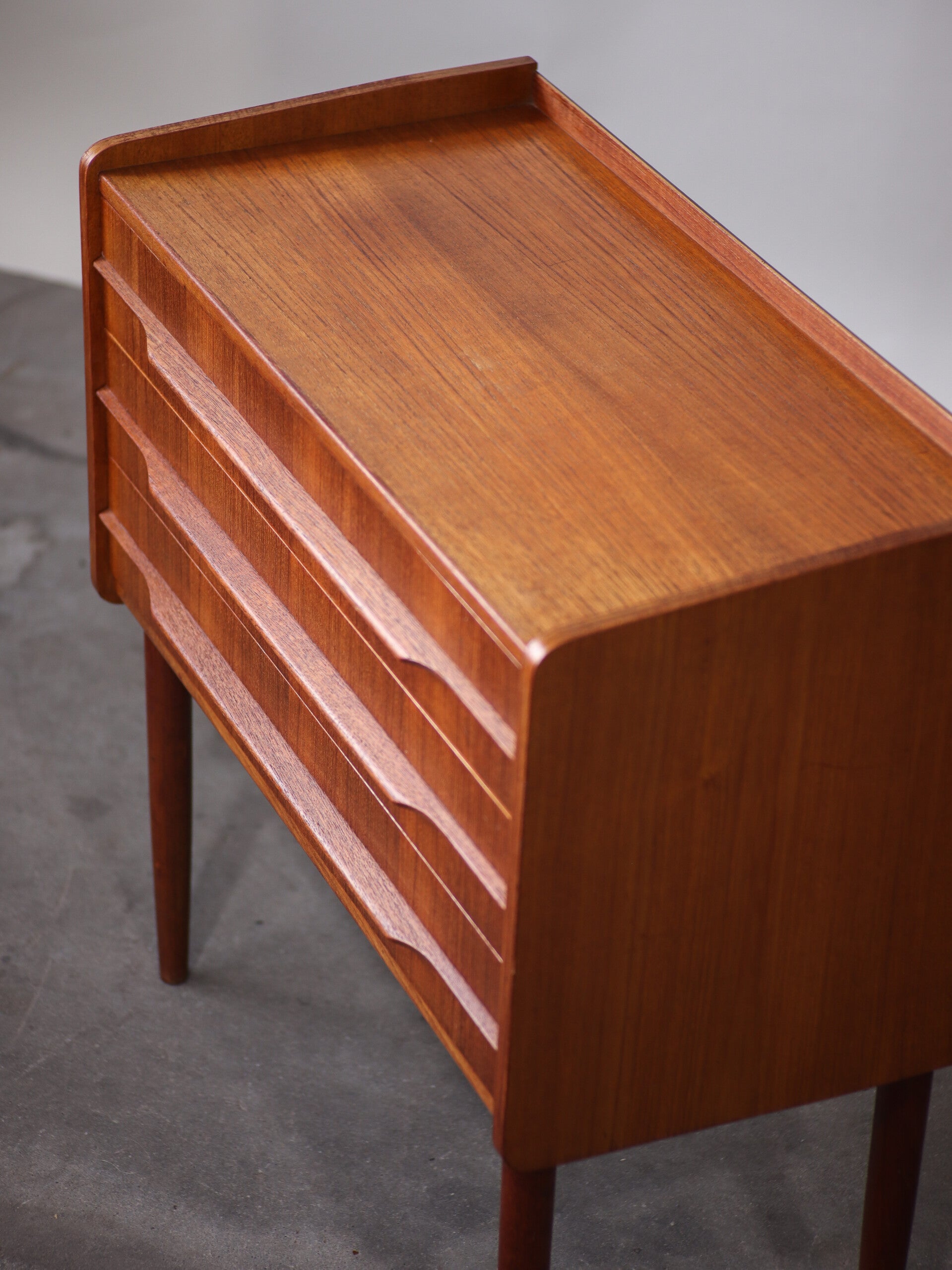 Prachtige kleine ladekast uit Denemarken, jaren '60. Dit vintage kastje is gemaakt van teakhout en heeft drie lades met bijzondere houten greepjes. Het kastje heeft een mooie opstaande rand met afgeronde hoeken en staat op hoge slanke poten. Onder andere leuk te gebruiken als halkastje, nachtkastje of aan de bank als bijzettafel met opbergruimte.