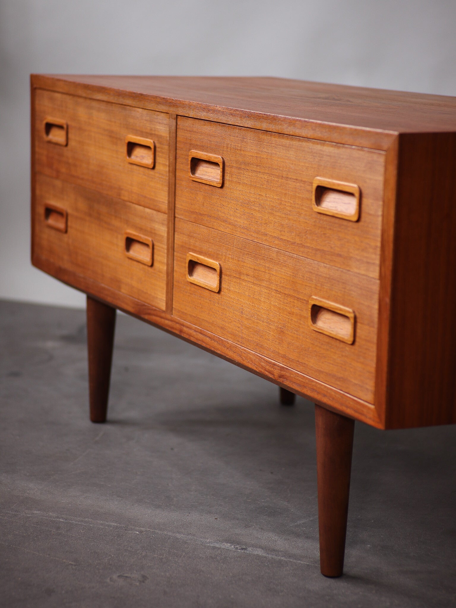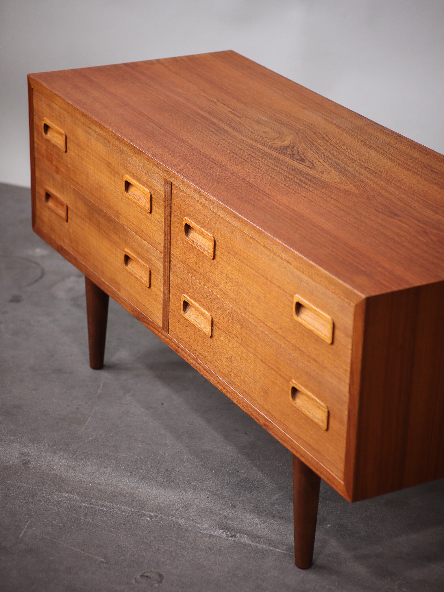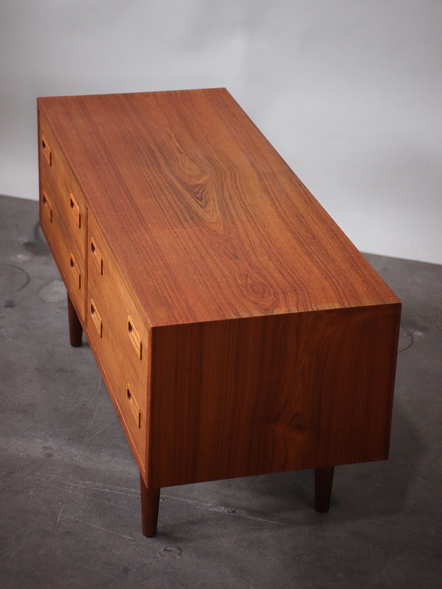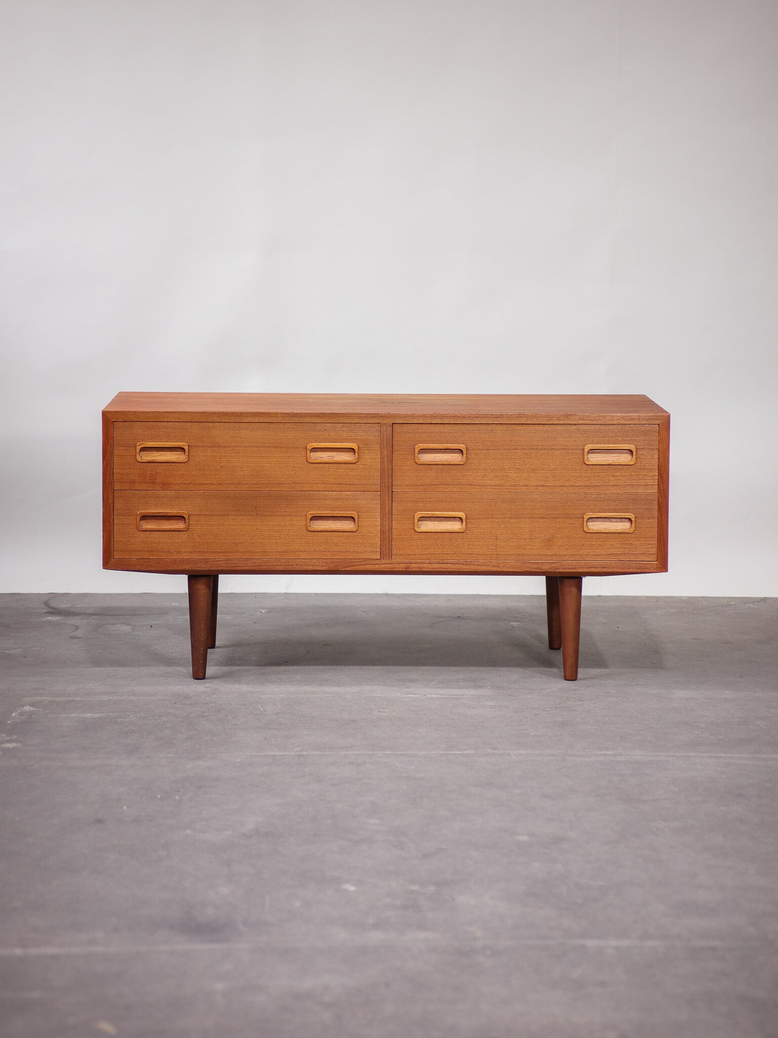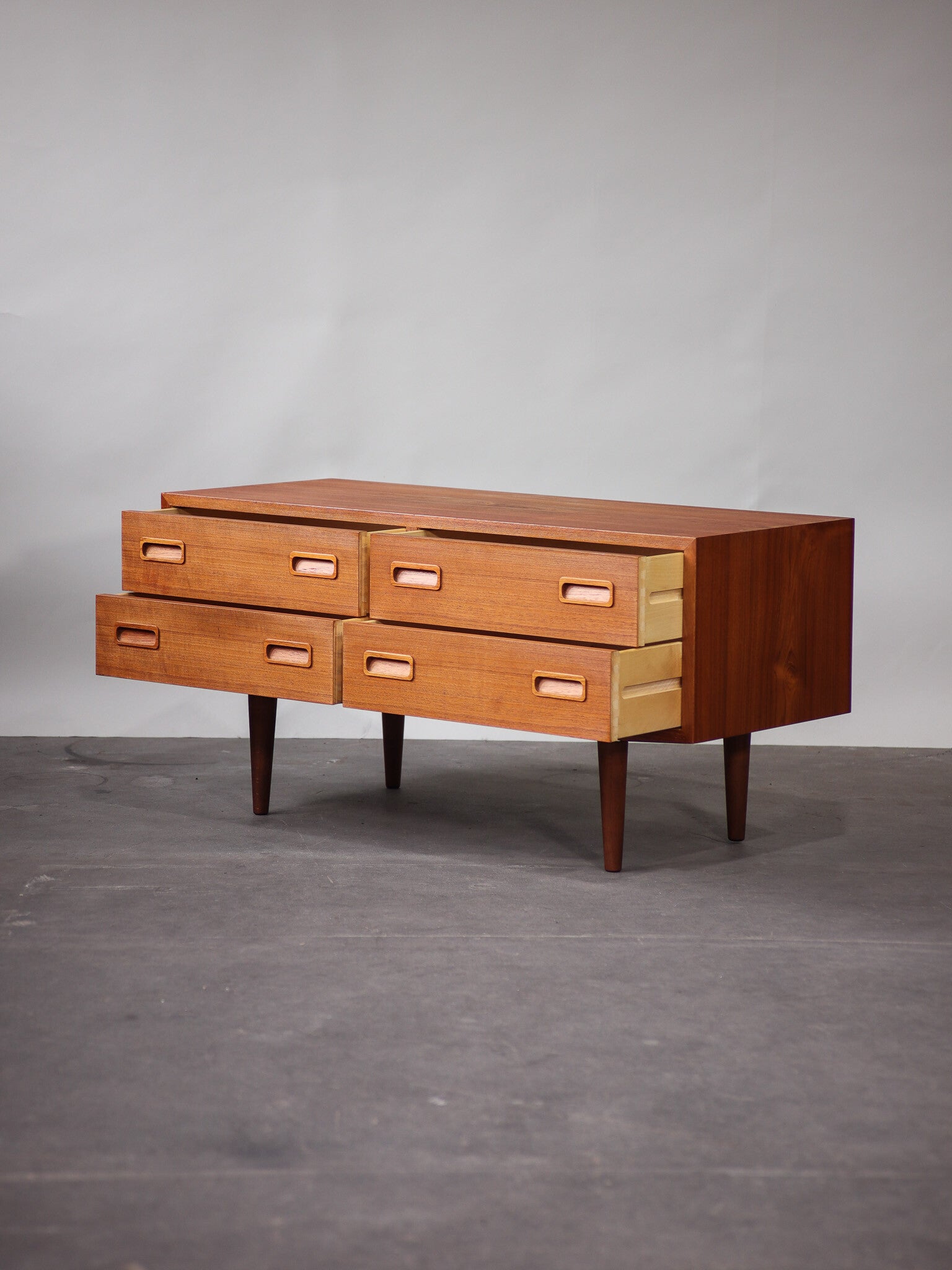 Prachtige dubbele ladekast uit Denemarken, jaren '60. Dit dressoir/lowboard is ontworpen door bekende Deense ontwerper Poul Hundevad. Het kastje is gemaakt van teakhout en heeft vier lades met mooie greepjes. Goed te gebruiken als bijvoorbeeld TV-meubel.