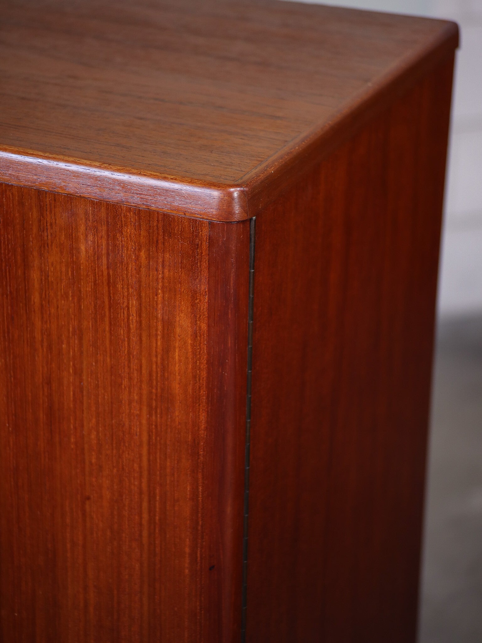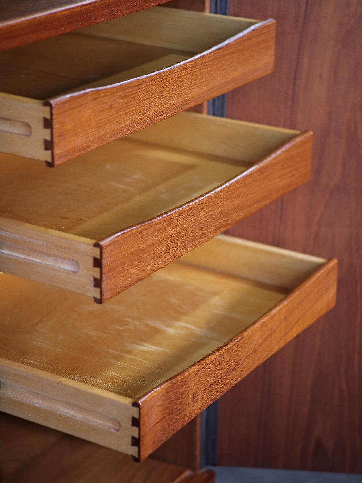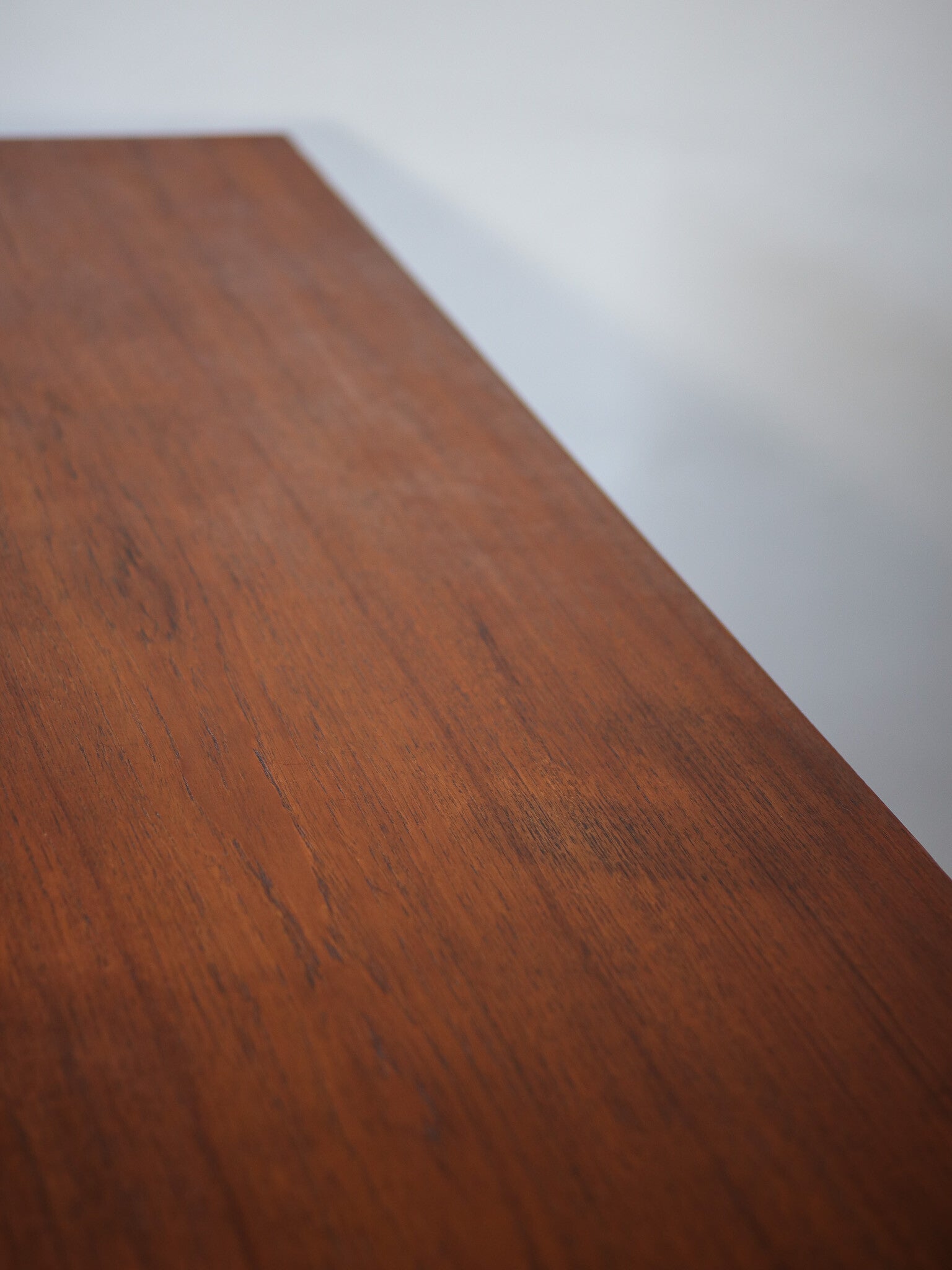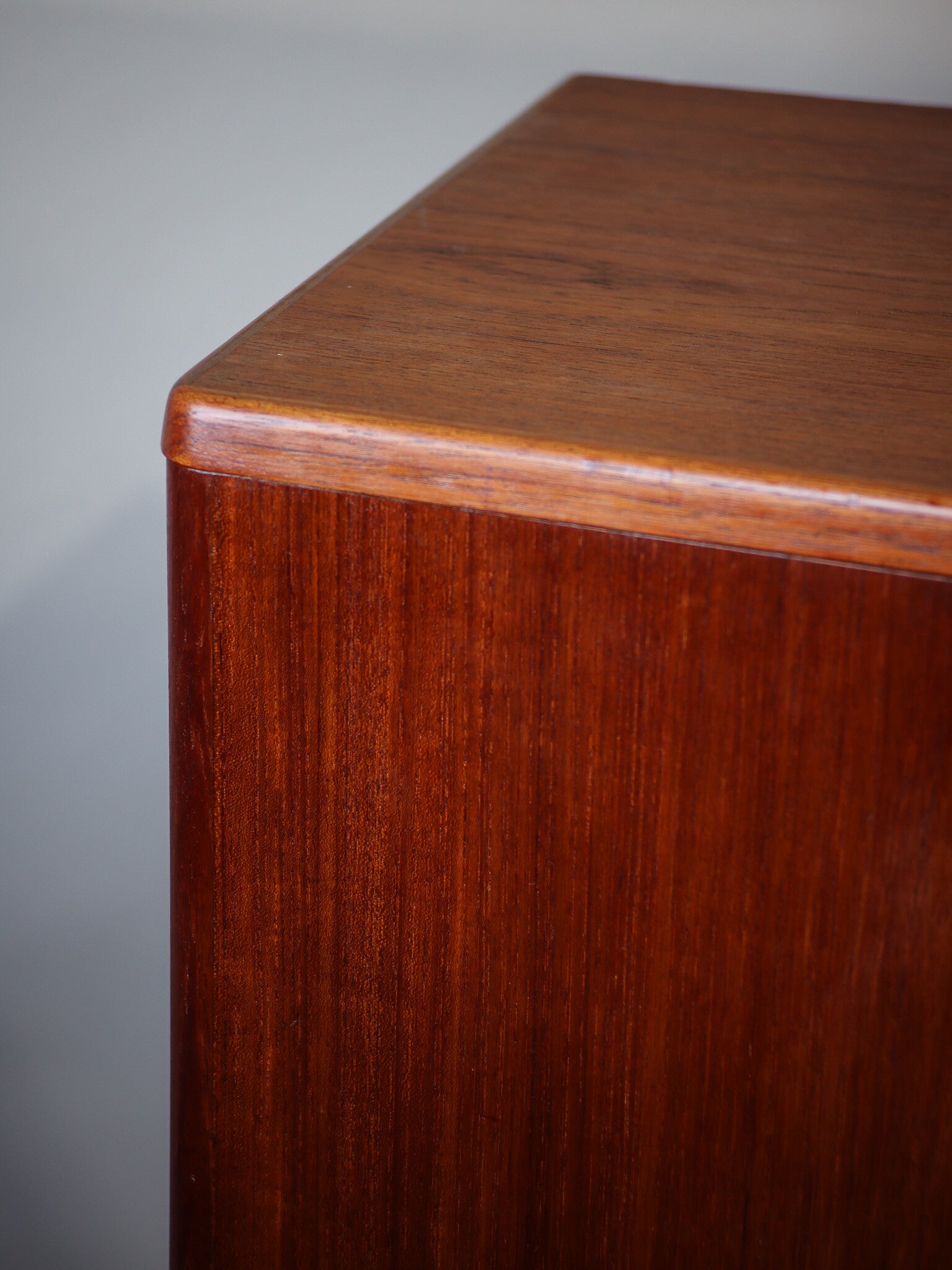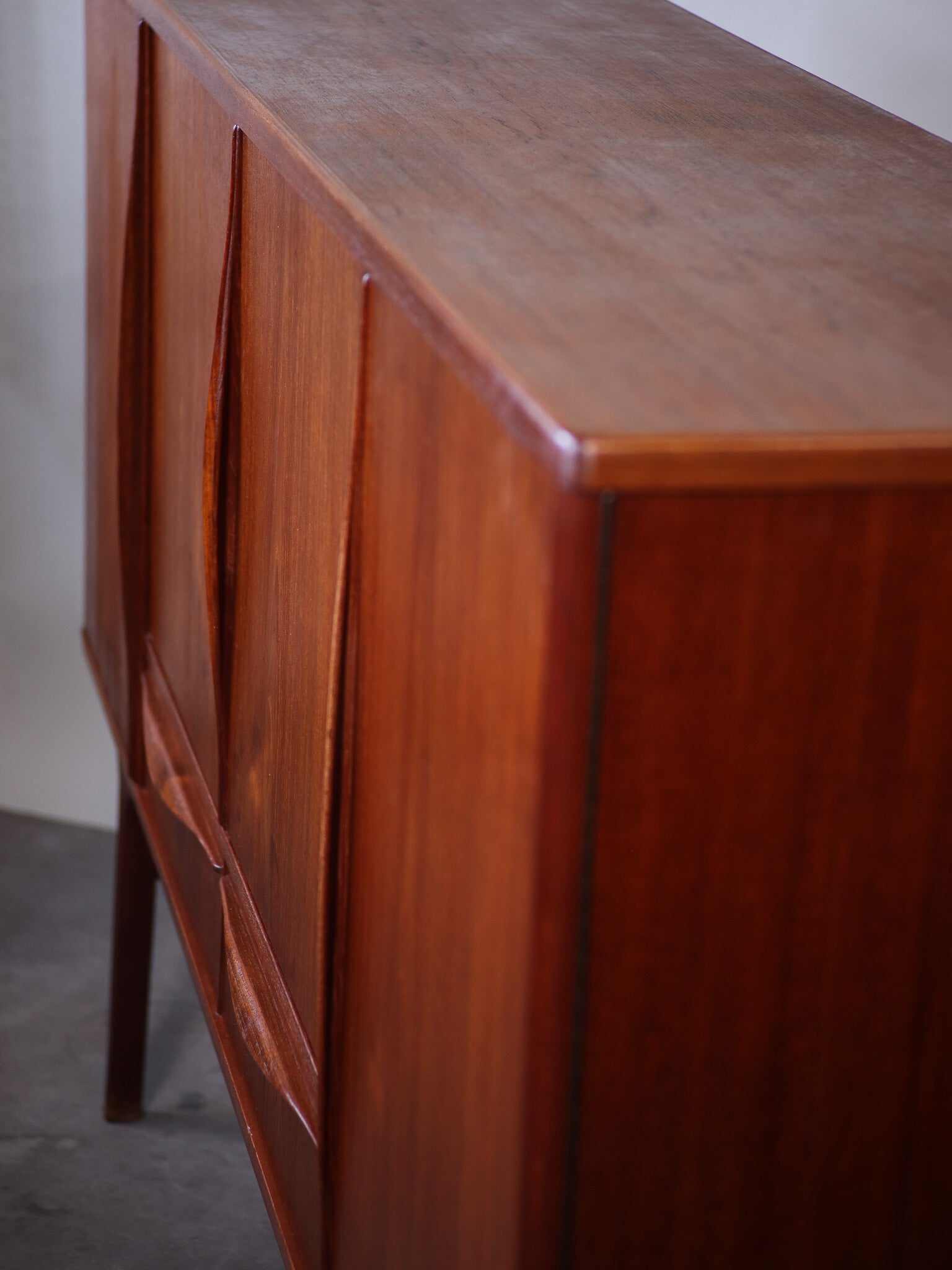 Prachtig dressoir/sideboard geproduceerd door Lyby Møbler uit Denemarken, jaren '60. Een stijlvol design met ronde vormen en een mooie poot. Deze grote kast is gemaakt van teakhout en heeft vier deuren en twee lades met prachtige organisch gevormde greepjes. In de kast zitten nog drie kleinere lades en drie in hoogte verstelbare planken en in één grote lade zit een verschuifbaar bakje.