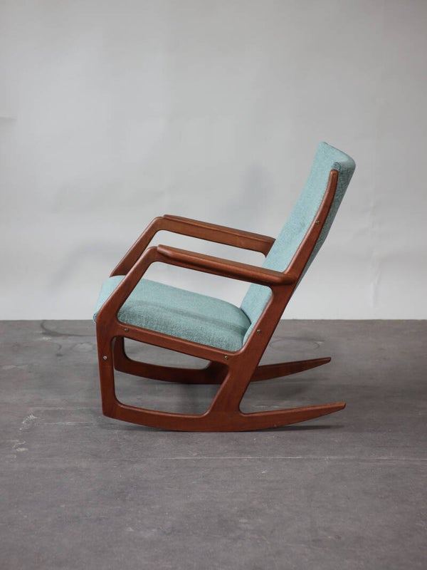 Prachtige zeldzame schommelstoel, ontworpen door Deense ontwerper Georg Jensen in de jaren '60, Denemarken. Het frame van deze fauteuil is gemaakt van teakhout en heeft een unieke vormgeving. De stoel is voorzien van nieuw schuim, waardoor het heerlijk zit. Daarnaast is de stoel geheel opnieuw bekleed met een fijne zachte kwaliteitsstof in een prachtige licht blauwgroene kleur.