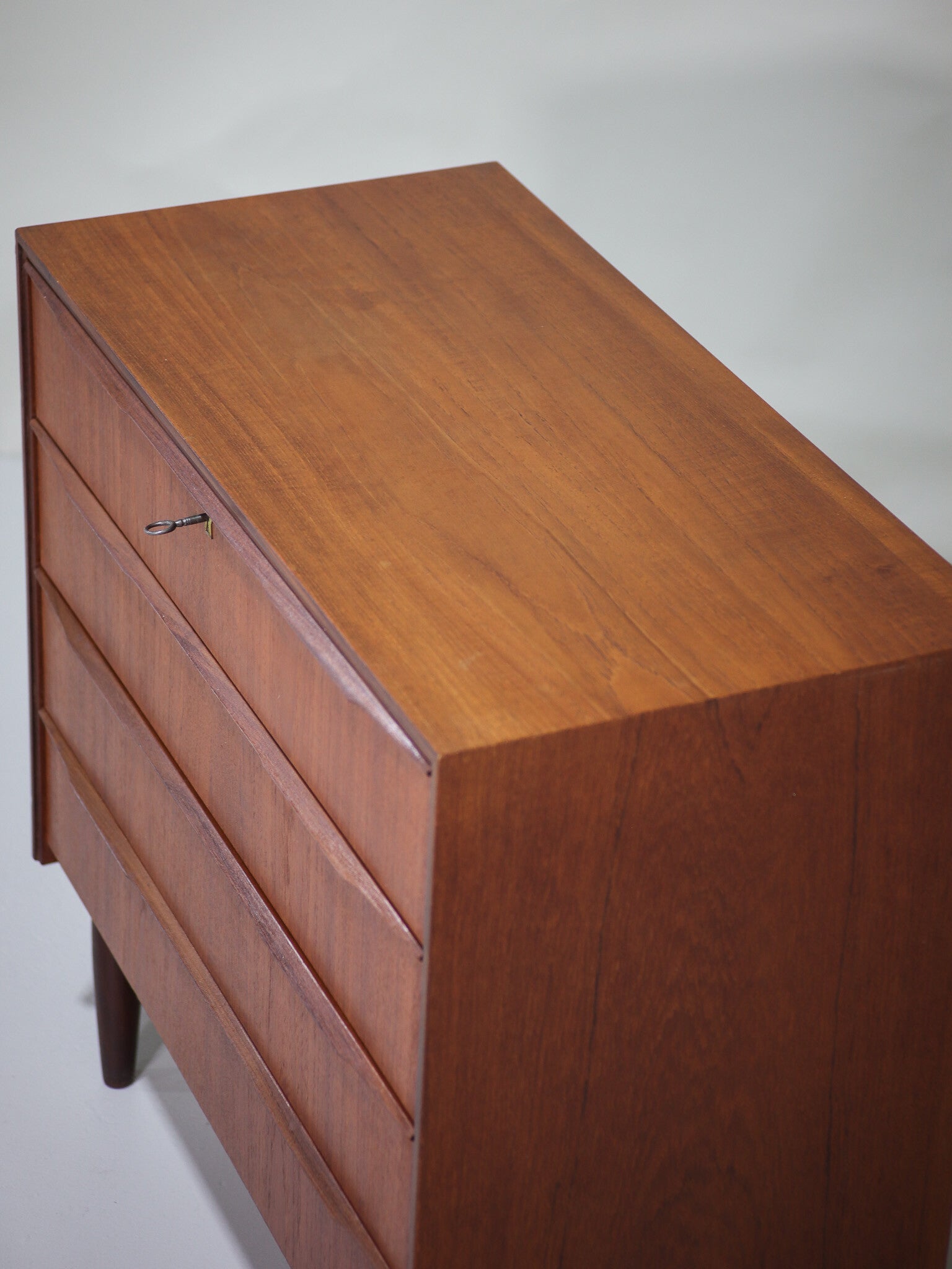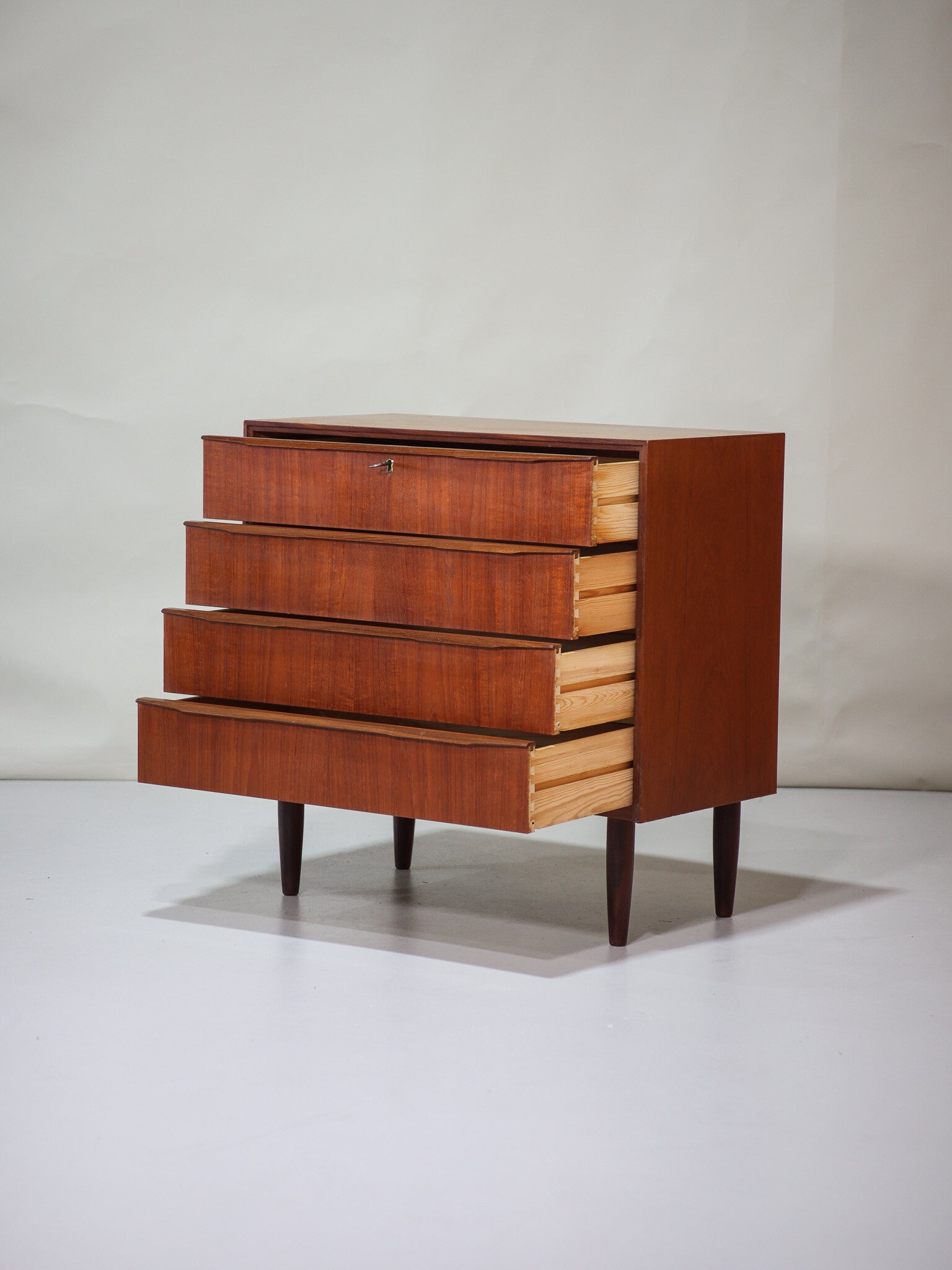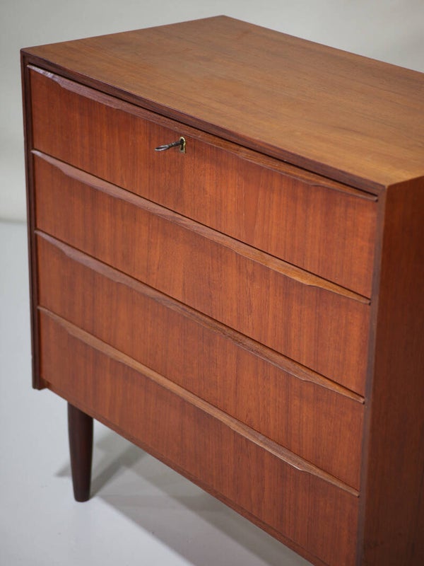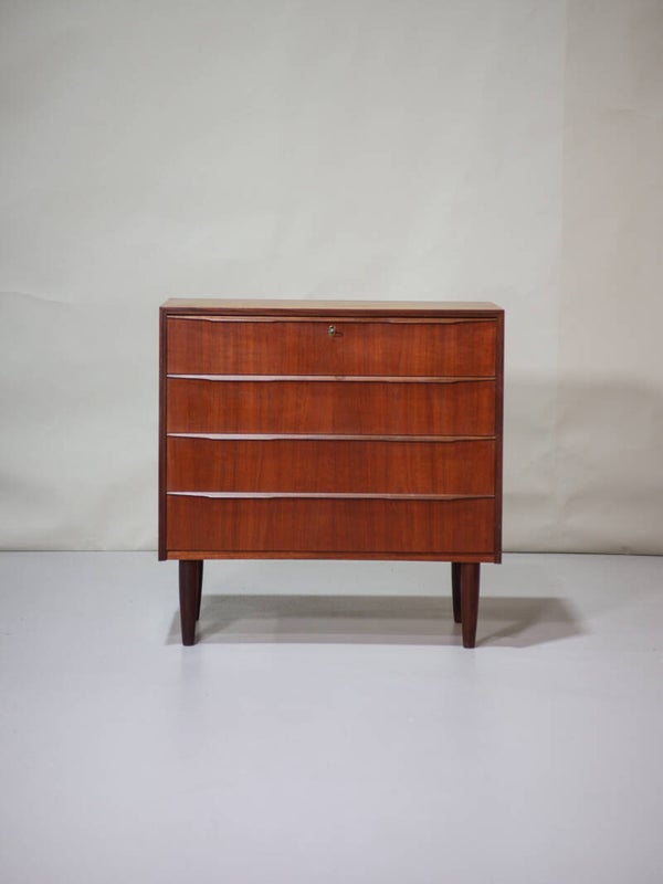 Prachtige teakhouten ladekast uit de jaren '60, Denemarken. Deze vintage kast heeft een mooie omlijsting en vier lades met stijlvol vormgegeven lange grepen.