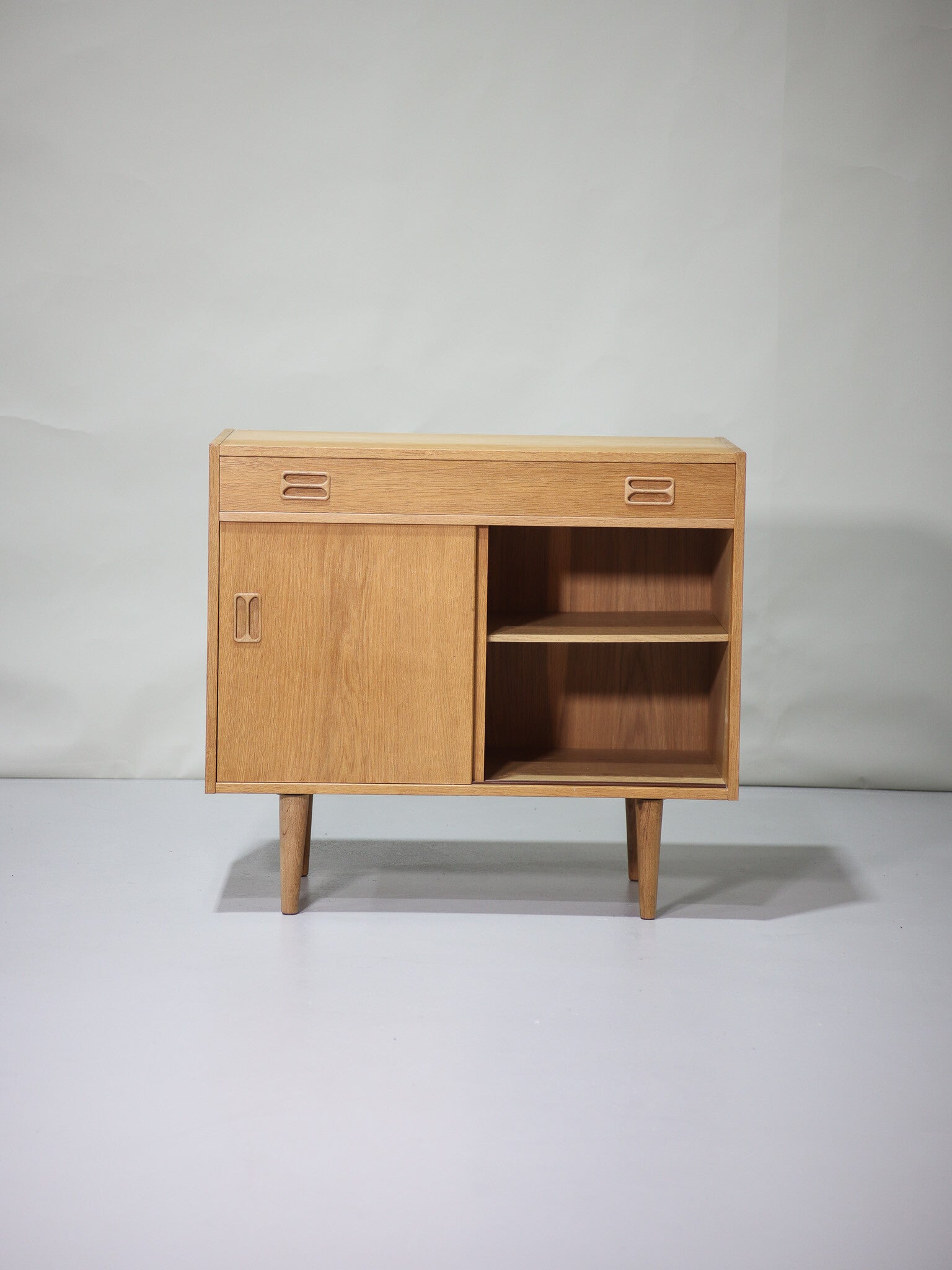 Mooi eikenhouten dressoir uit Denemarken, jaren '60. Deze kast heeft twee schuifdeuren en een brede lade. In de kast zit een in hoogte verstelbare plank. Ook goed te gebruiken als platenkastje als je de plank eruit haalt. Daarnaast geschikt om om te bouwen tot badkamermeubel.