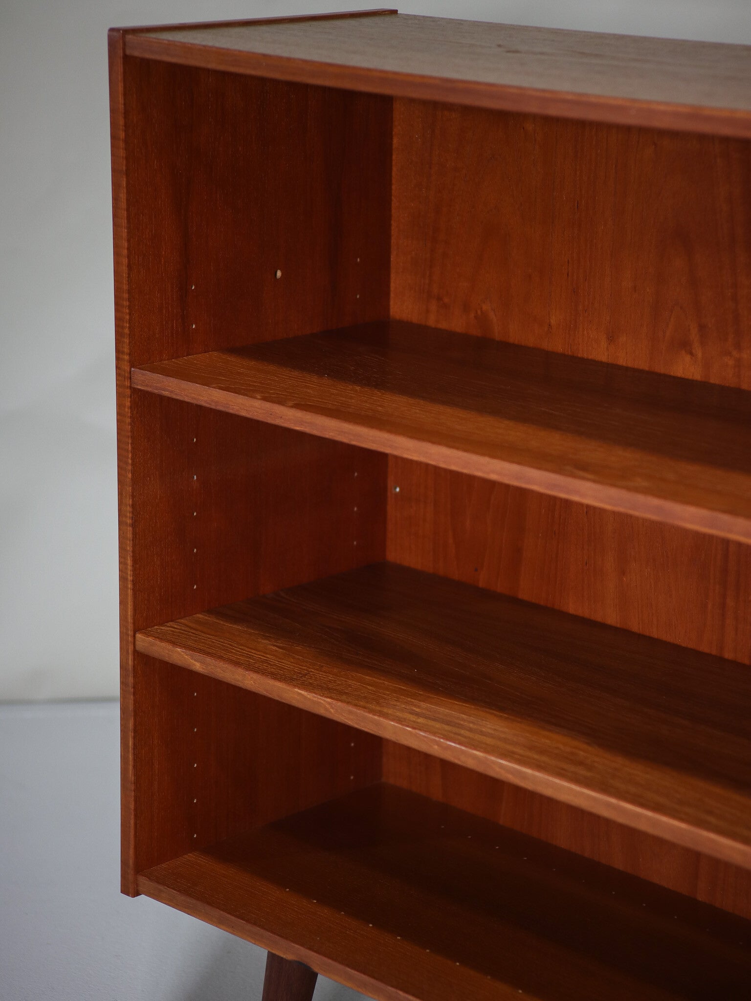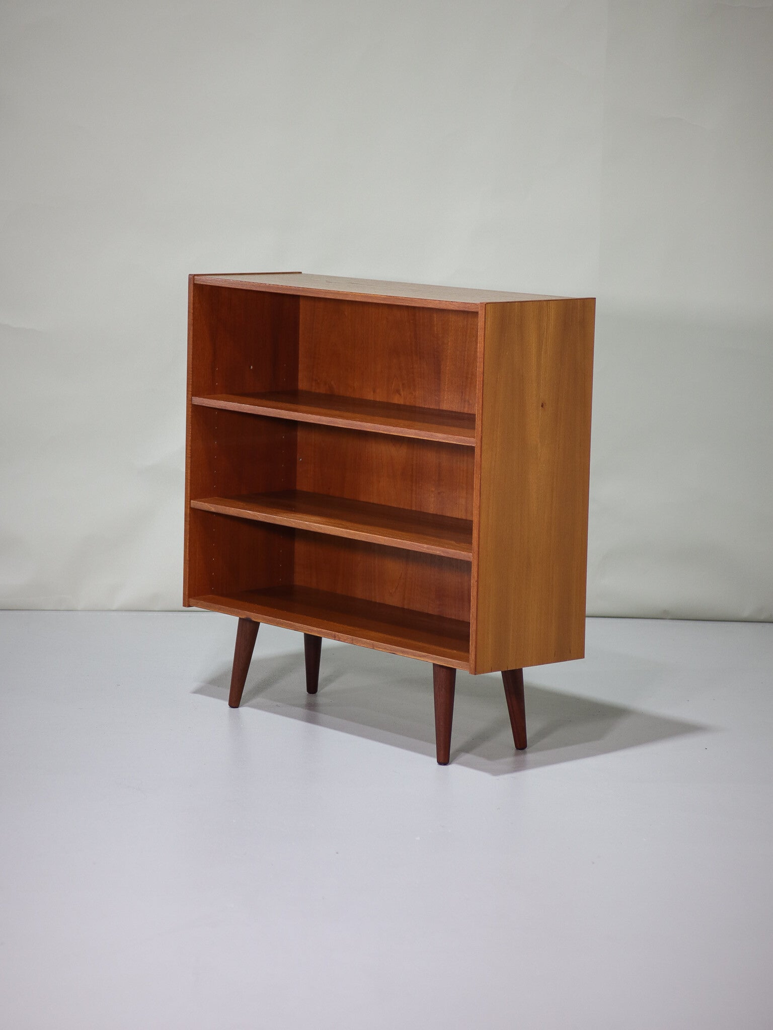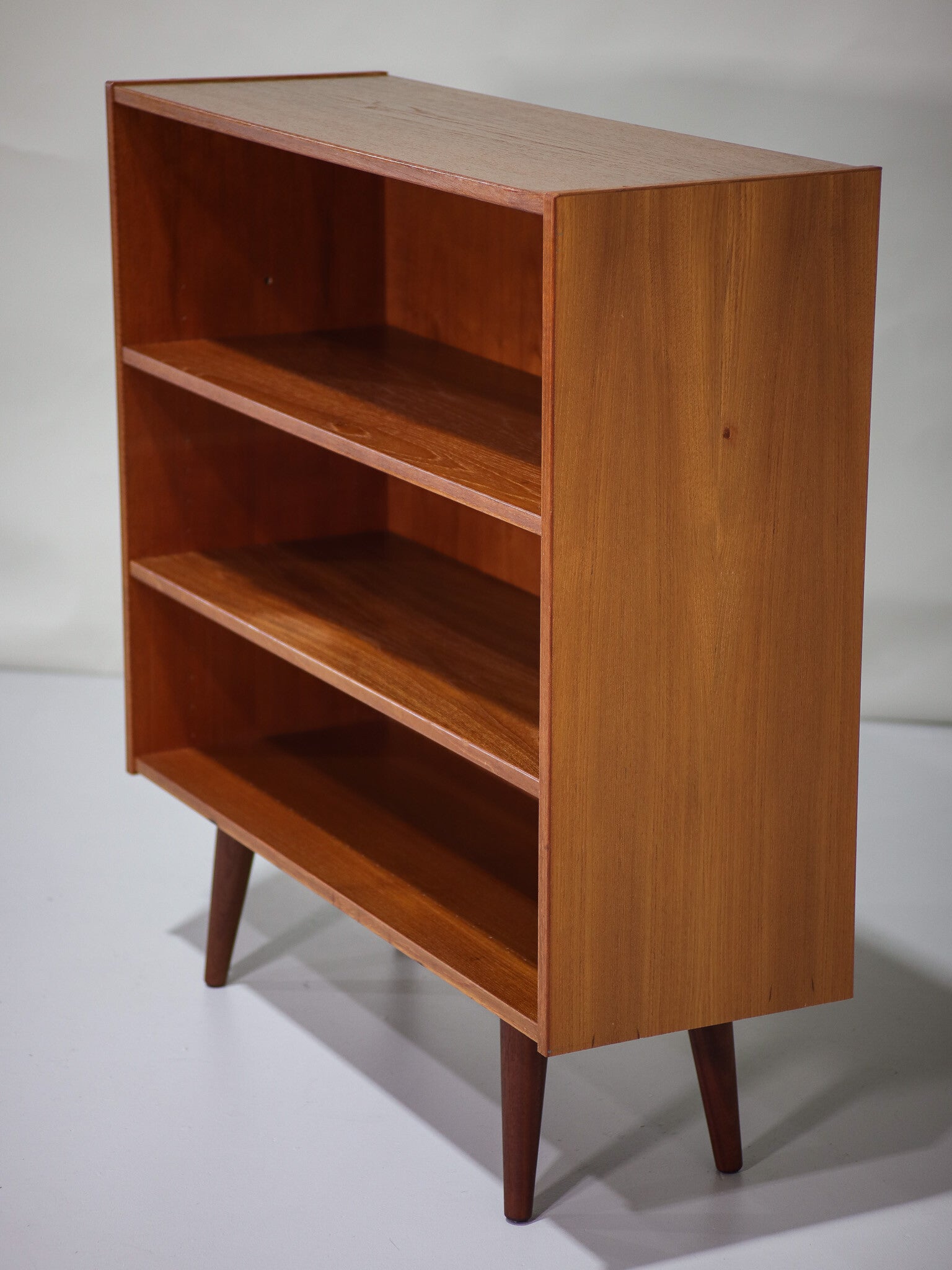 Mooie teakhouten boekenkast uit Denemarken, jaren '60. Deze open kast heeft schuine pootjes en twee in hoogte verstelbare planken.