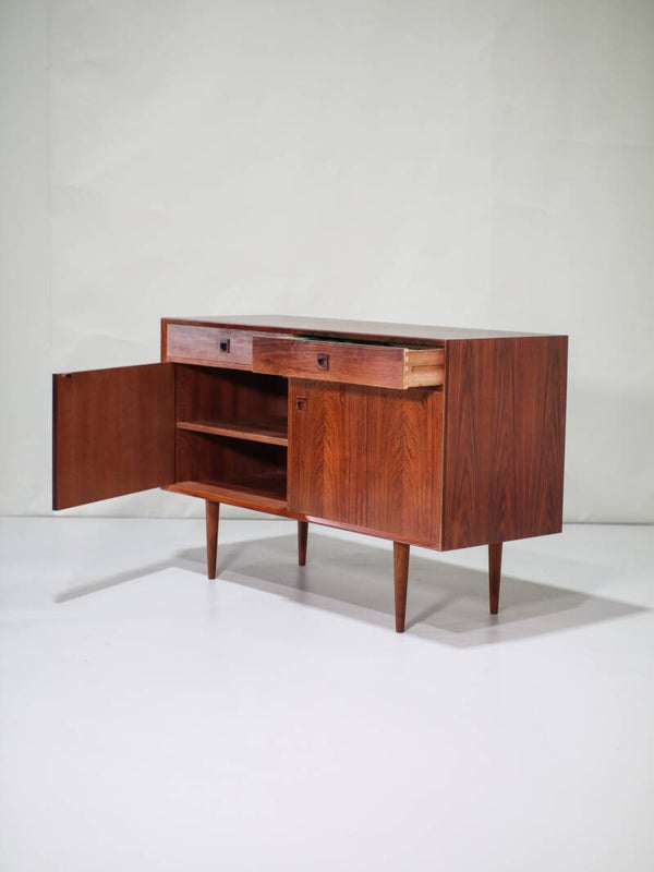Prachtig dressoir, geproduceerd door Brouer Møbelfabrik in Denemarken in de jaren '60. Dit sideboard is gemaakt van palissanderhout met prachtige nerven. De kast heeft twee deuren die mooi open en dicht klikken. Daarachter zit aan beide kanten een in hoogte verstelbare plank. Bovenin de kast zitten twee lades. In de rechterlade zit een extra verschuifbare lade met verplaatsbare houders voor bijvoorbeeld bestek.