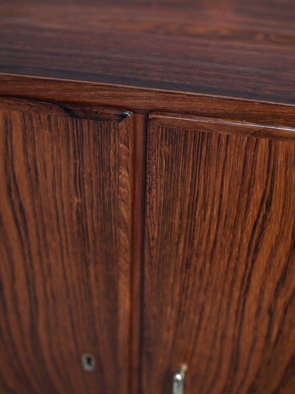 Mooie kast ontworpen door de Deense Poul Hundevad in de jaren '60. Dit kwaliteitsvolle dressoir is gemaakt van prachtig palissanderhout. Achter de twee deuren zitten links vier lades en rechts twee in hoogte verstelbare planken. Een praktisch en stijlvol meubelstuk!