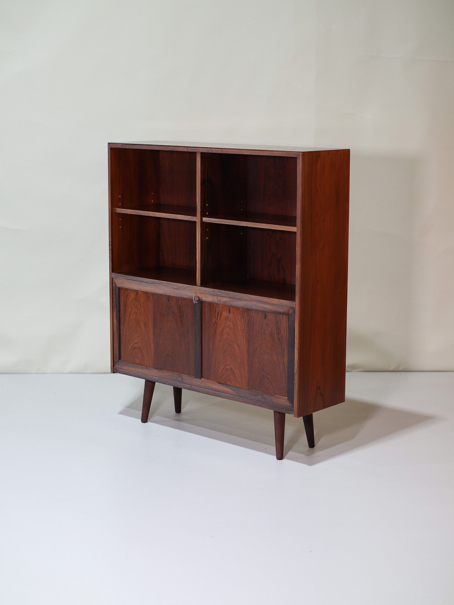 Prachtige palissanderhouten klepkast uit Denemarken, jaren '60. Deze vintage kast heeft een open gedeelte met in hoogte verstelbare planken en een klep met daarachter verschillende vakken.