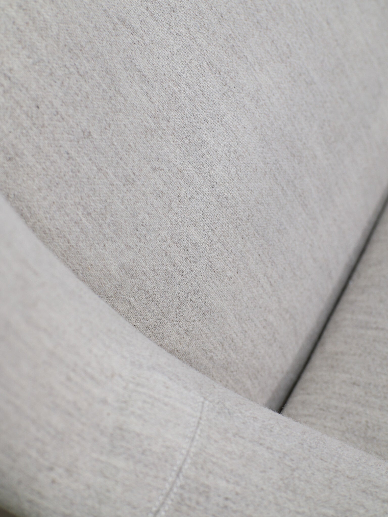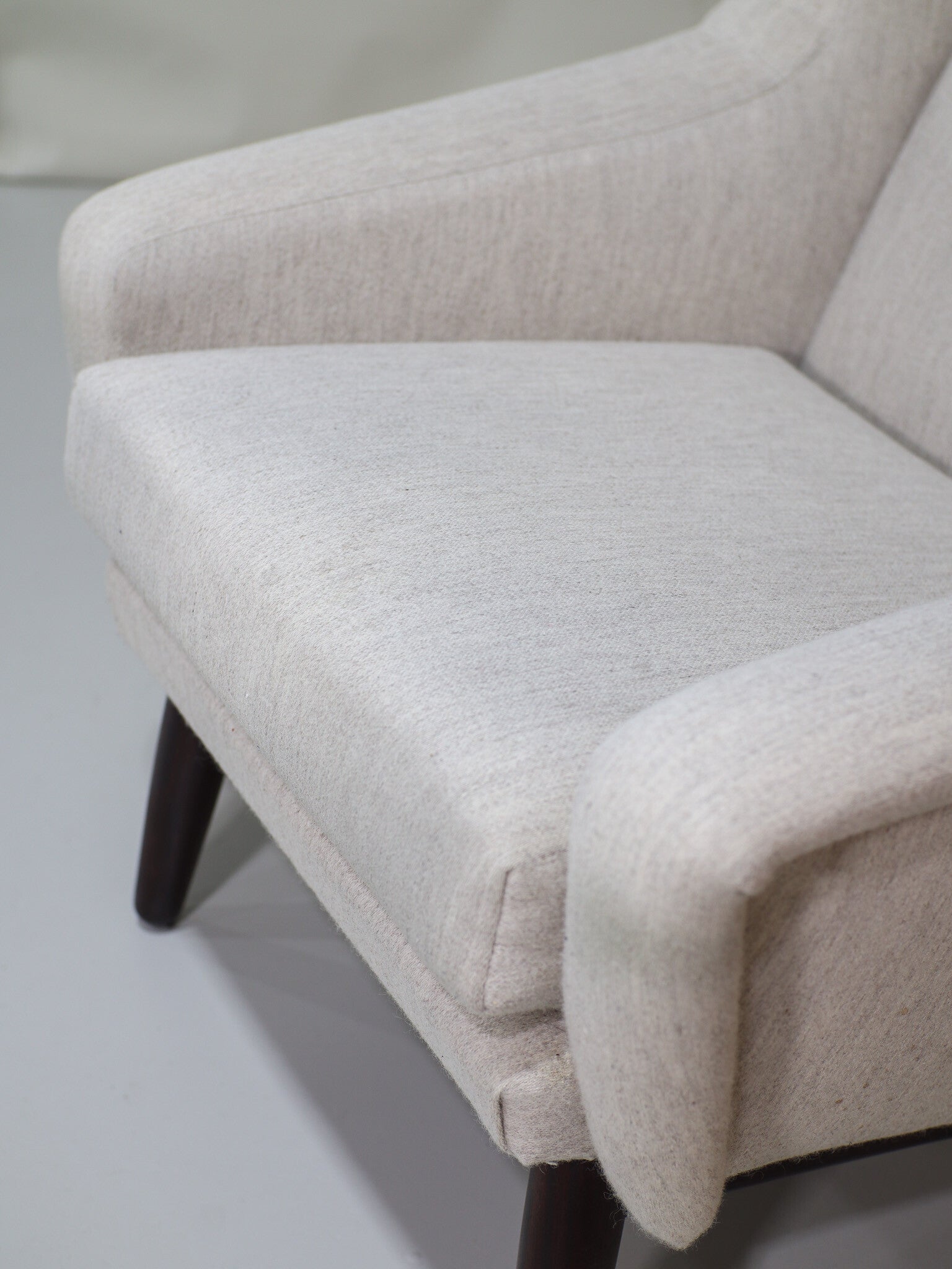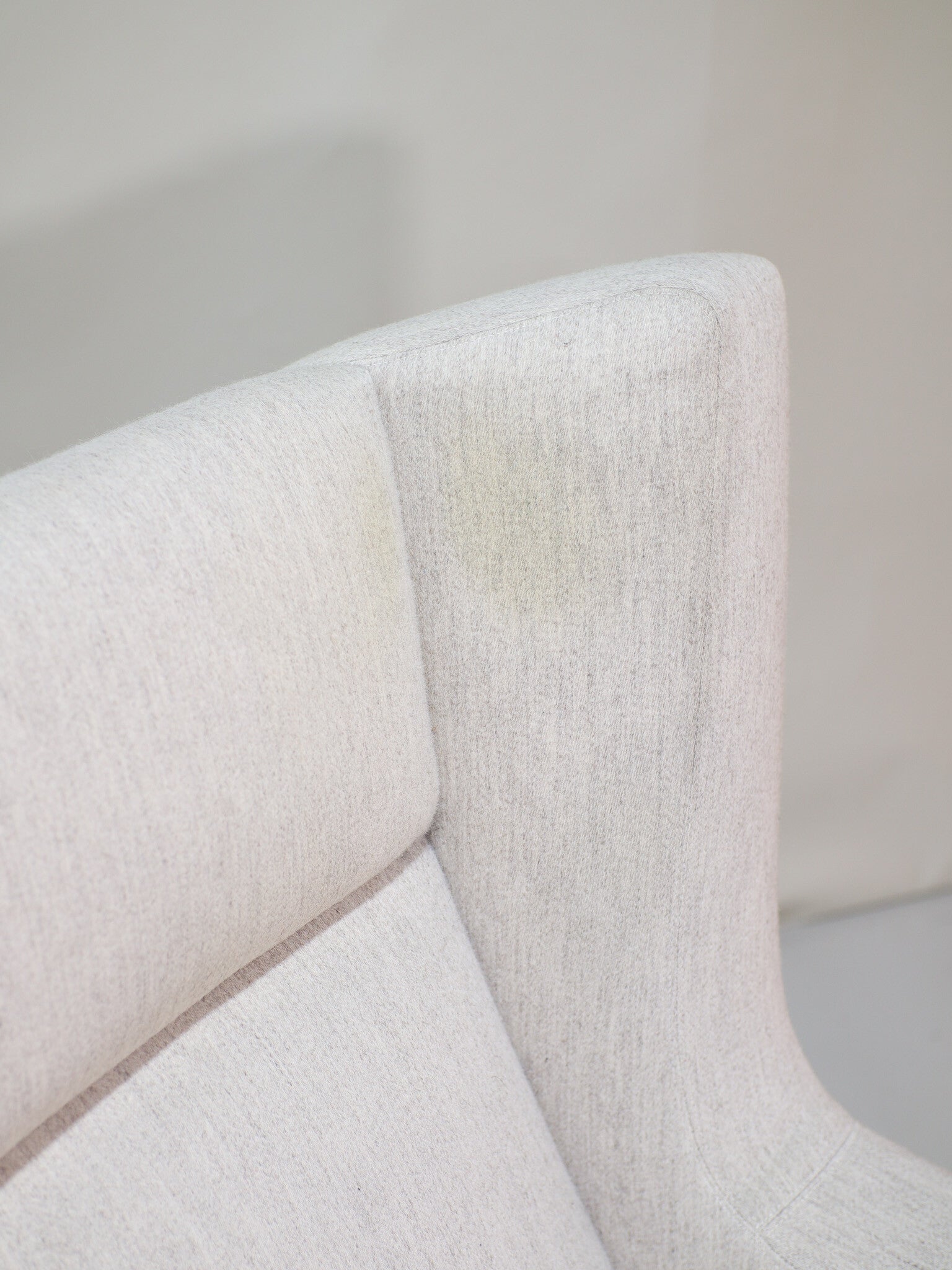Zeldzame oorfauteuil / wing back chair ontworpen door de Zweedse Folke Ohlsson voor Fritz Hansen, Denemarken jaren '50. Het betreft model 4410. Het ontwerp is niet alleen zeer stijlvol en tijdloos, de stoel is ook nog zeer comfortabel. Dit is te danken aan zijn grote formaat, zijsteunen voor het hoofd en zachte stof. De stoel is bekleed met de originele lichte wit grijze wollen stof.