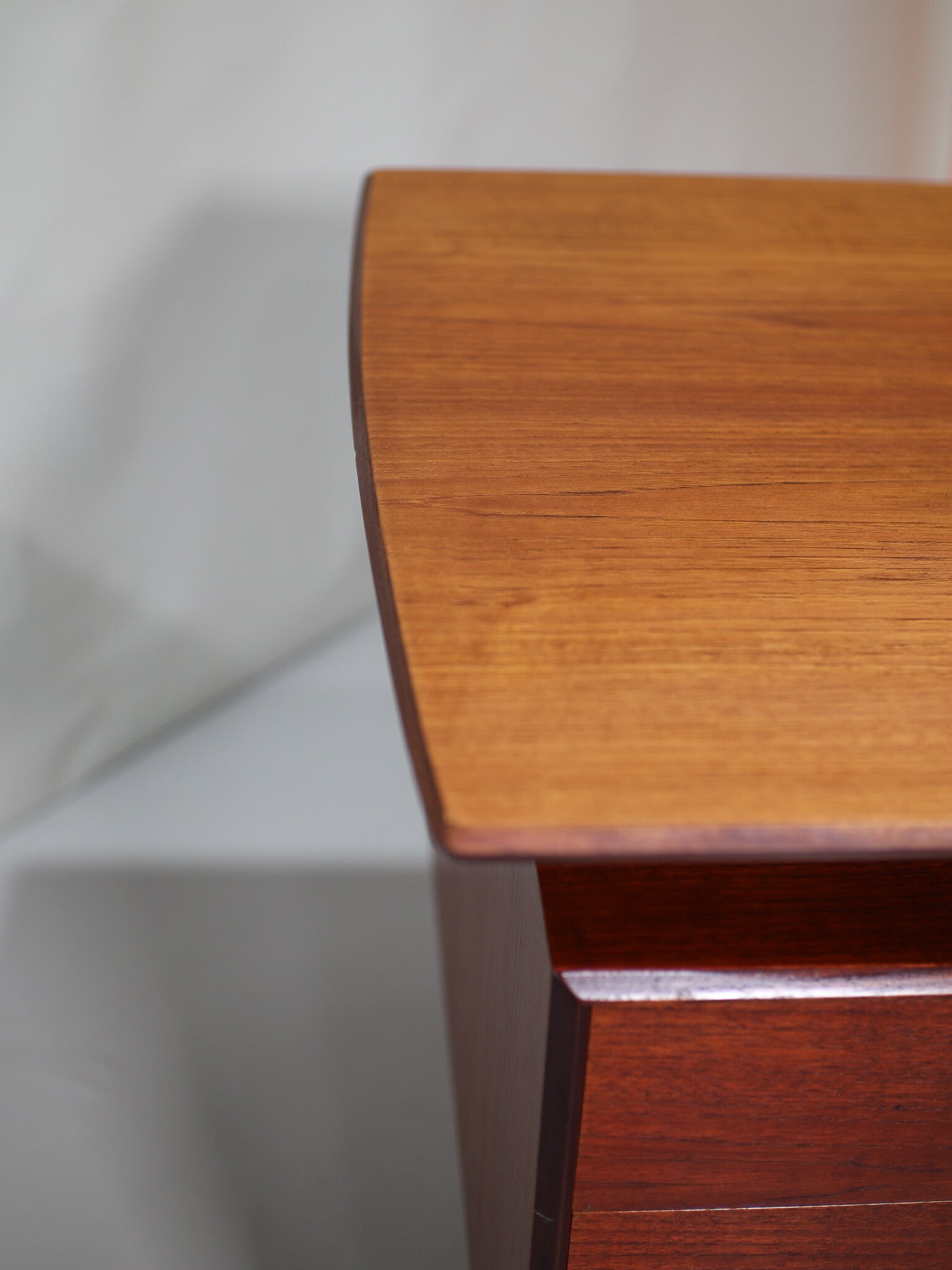 Mooi dubbelzijdig bureau uit Denemarken, jaren '60. Dit vintage bureau is gemaakt van teakhout. De zijkanten van het blad lopen licht bol en de randen zijn prachtig afgewerkt. Een stijlvol en praktisch meubelstuk van hoge kwaliteit. Prachtig om los in een ruimte te zetten.