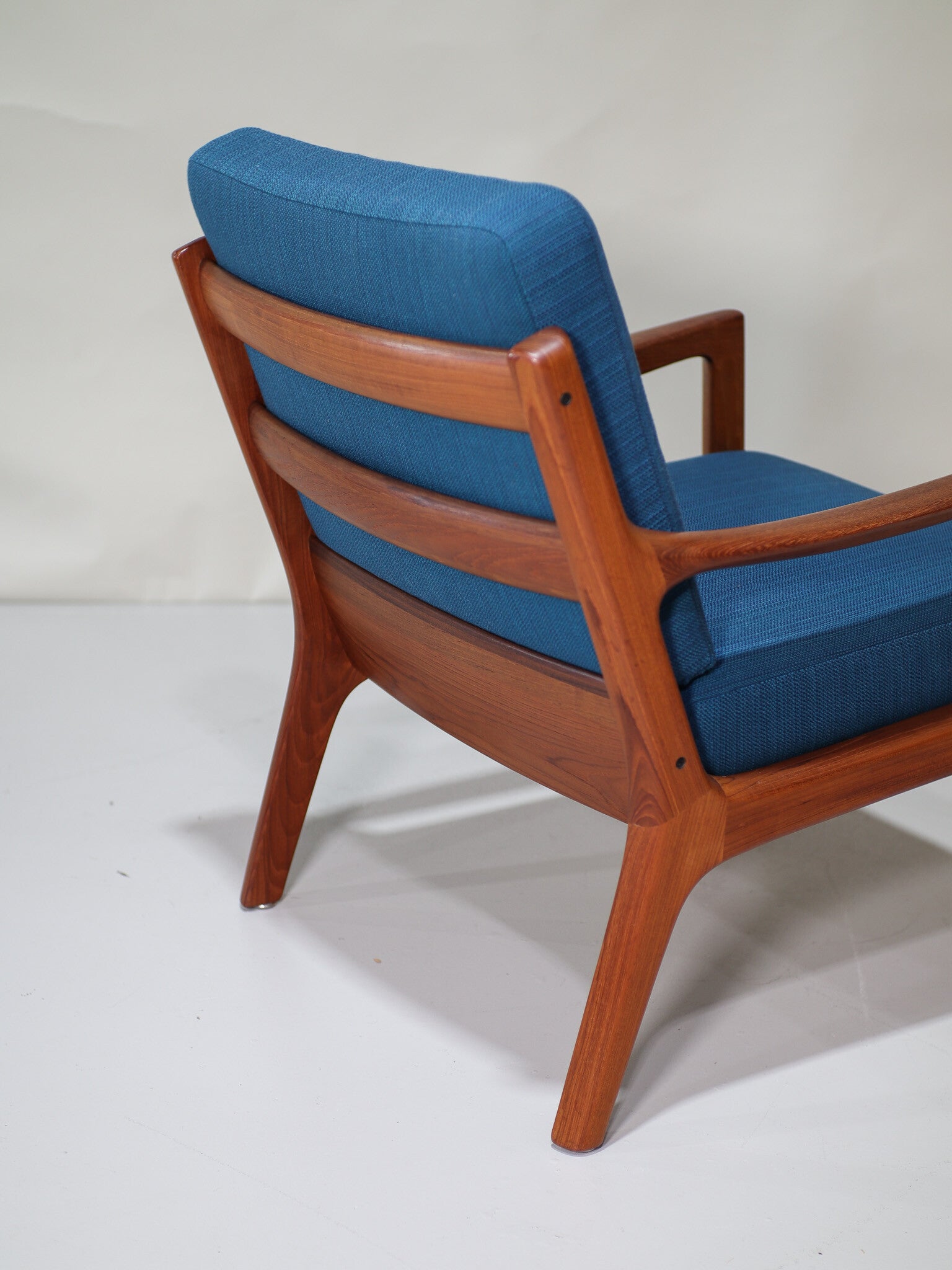 'Senator' fauteuil, ontworpen door Ole Wanscher en in de jaren '60 geproduceerd door CADO, Denemarken. Het stijlvolle en stevige frame met armleunigen is gemaakt van kwalitatief teakhout. De twee losse, afritsbare kussens hebben een prachtige blauwe kleur. Een comfortabel en tijdloos design!