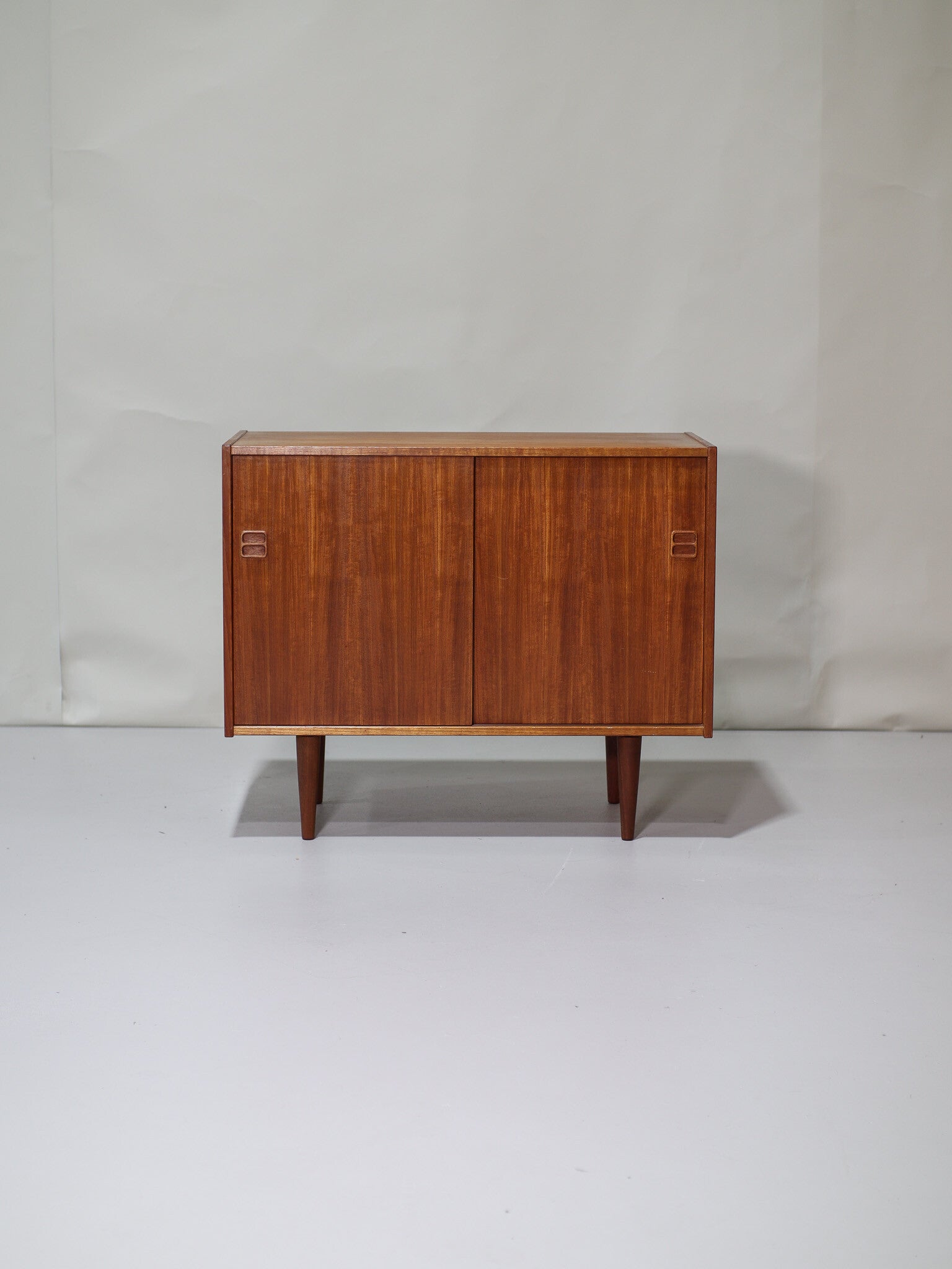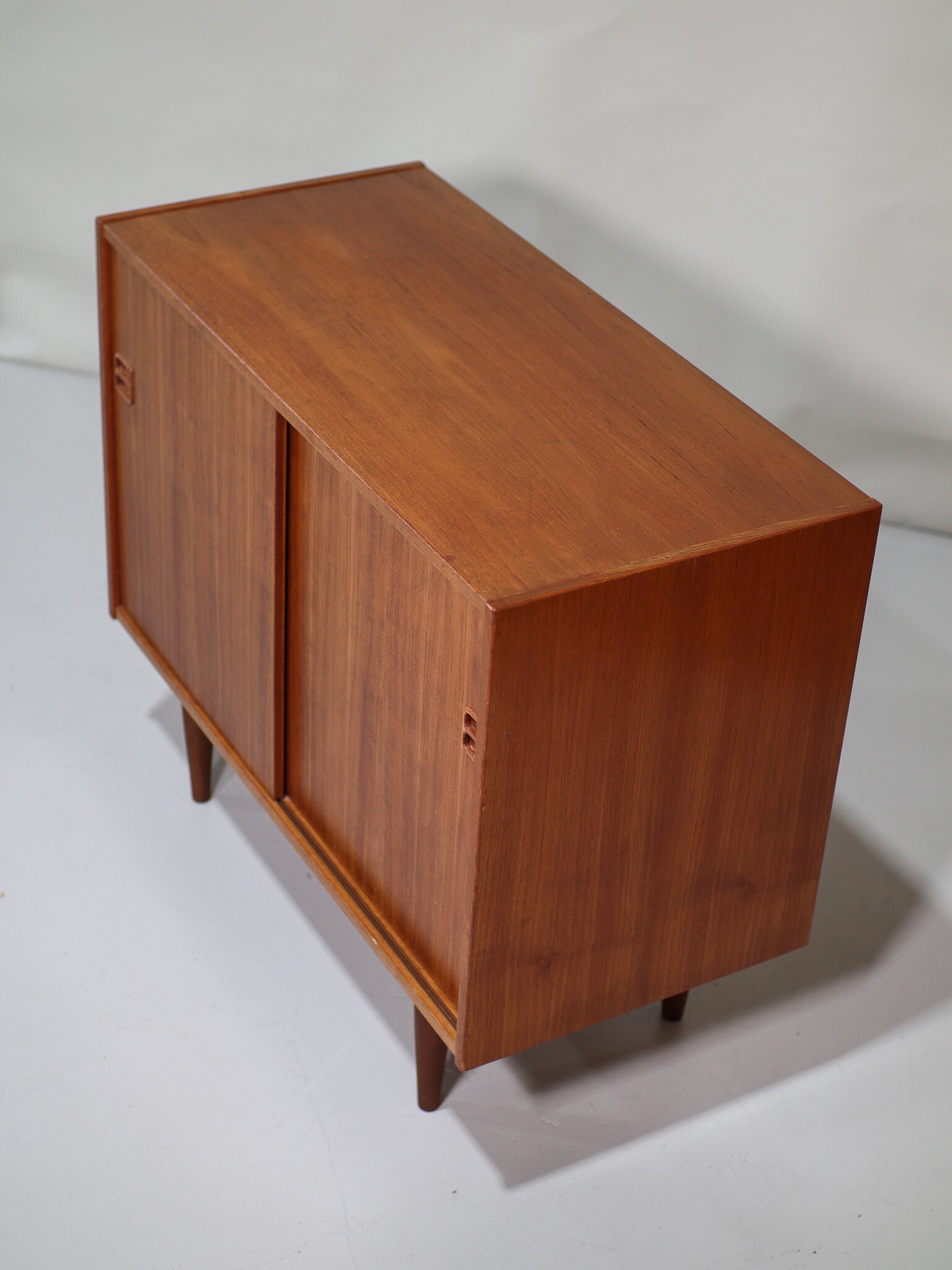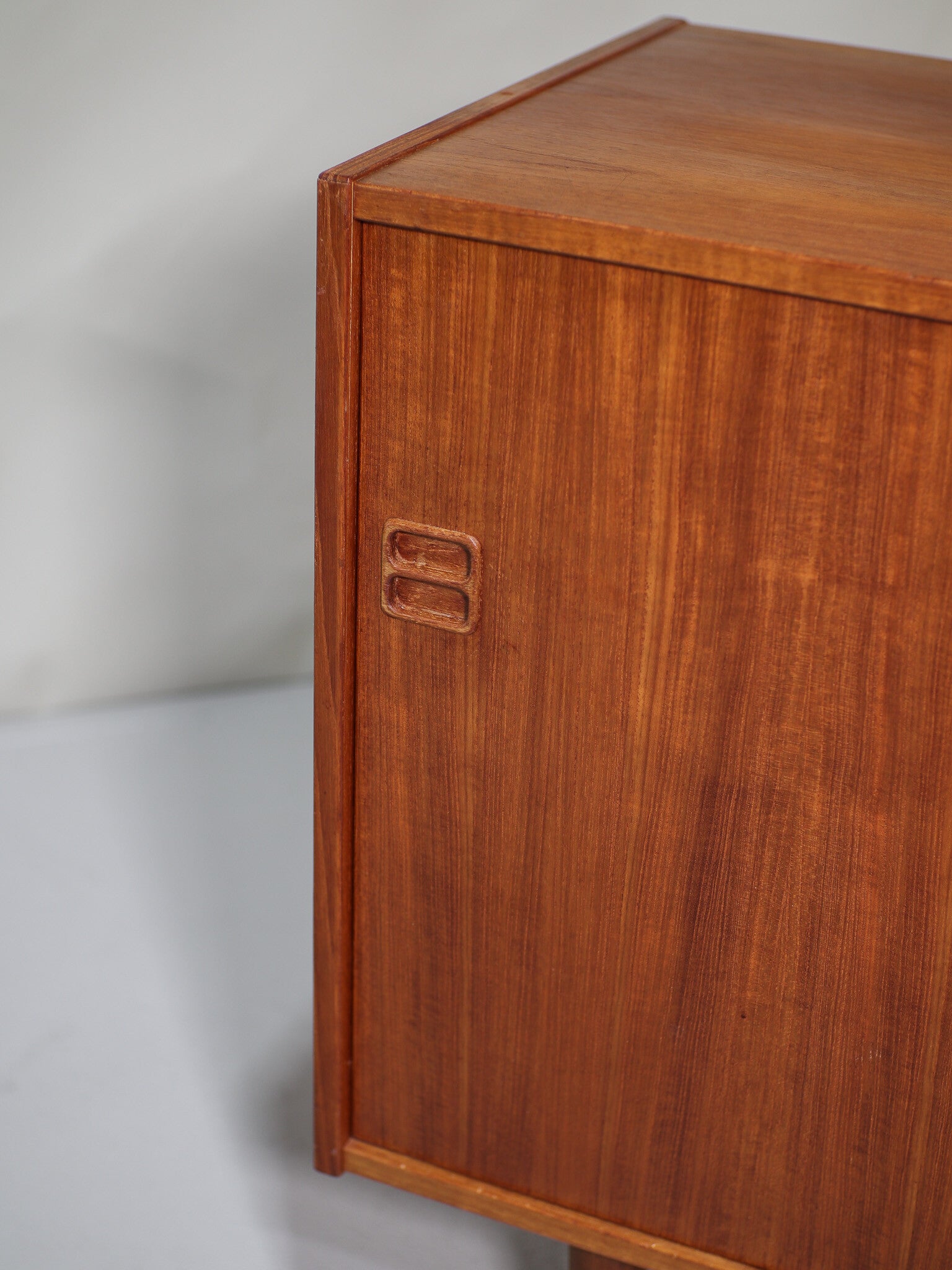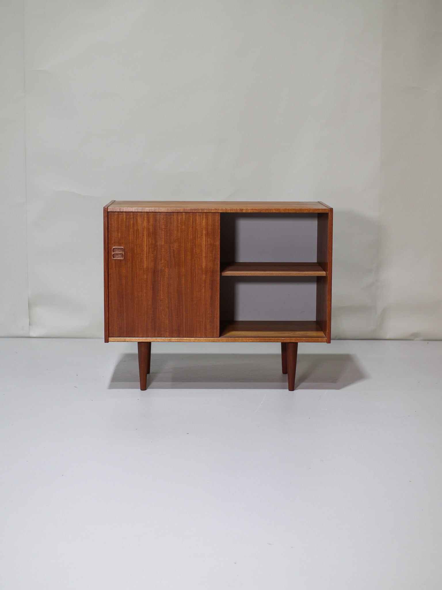Mooi teakhouten dressoir uit Denemarken, jaren '60. Dit schuifdeurkastje heeft een in hoogte verstelbare plank en mooie houten greepjes. Erg leuk om bijvoorbeeld te gebruiken als platenkastje (de plank kan eruit) of om om te bouwen tot badkamermeubel!