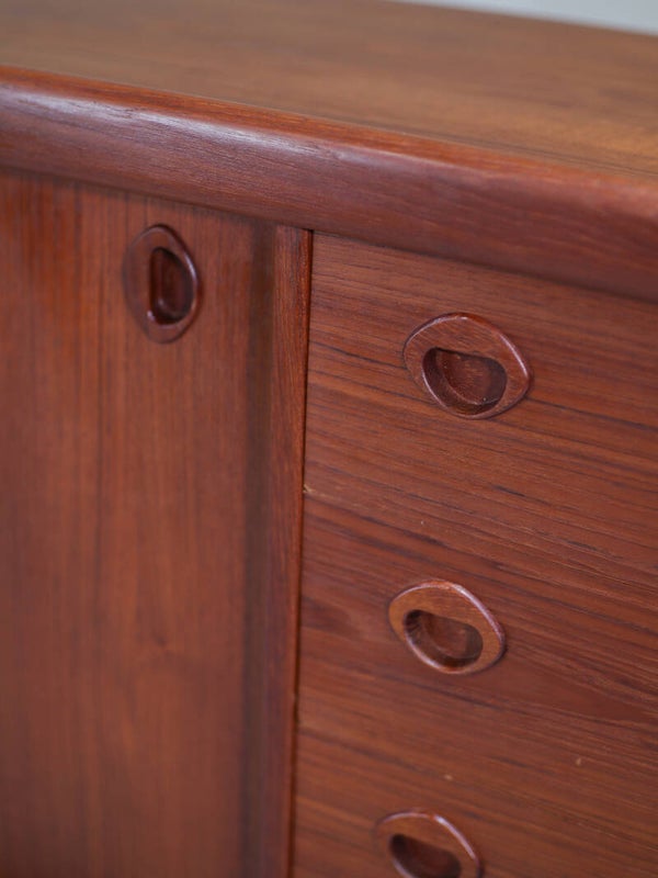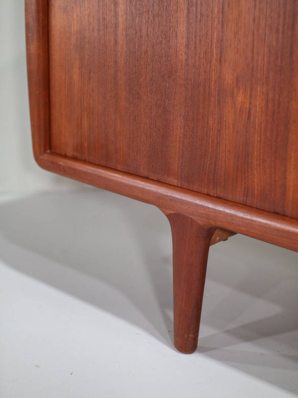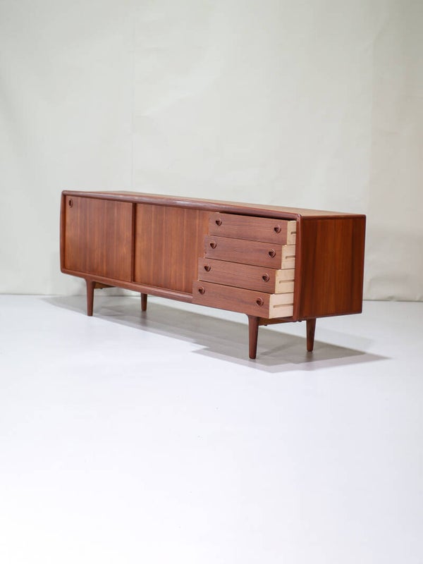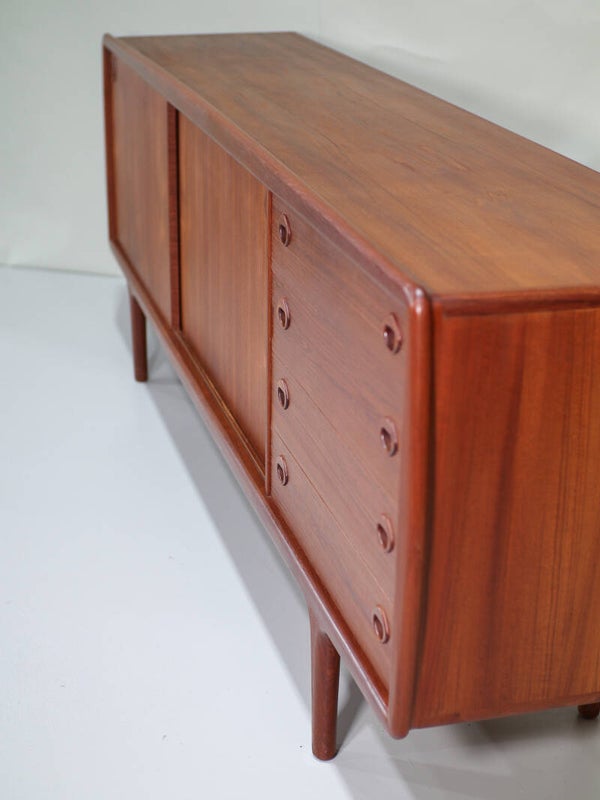 Prachtig lang dressoir ontworpen door H.P. Hansen, Møbelindustri ApS Randers in de jaren '60, Denemarken. Dit Deense vintage lowboard heeft een mooie vormgeving met afgeronde hoeken, unieke greepjes en een opstaande rand aan de zijkanten en bovenkant. De kast is gemaakt van teakhout. Achter de schuifdeuren zitten drie in hoogte verstelbare planken. Verder heeft de kast vier ruime lades. Onder andere goed te gebruiken als tv-meubel of platenkast. Echt een pronkstuk van topkwaliteit!