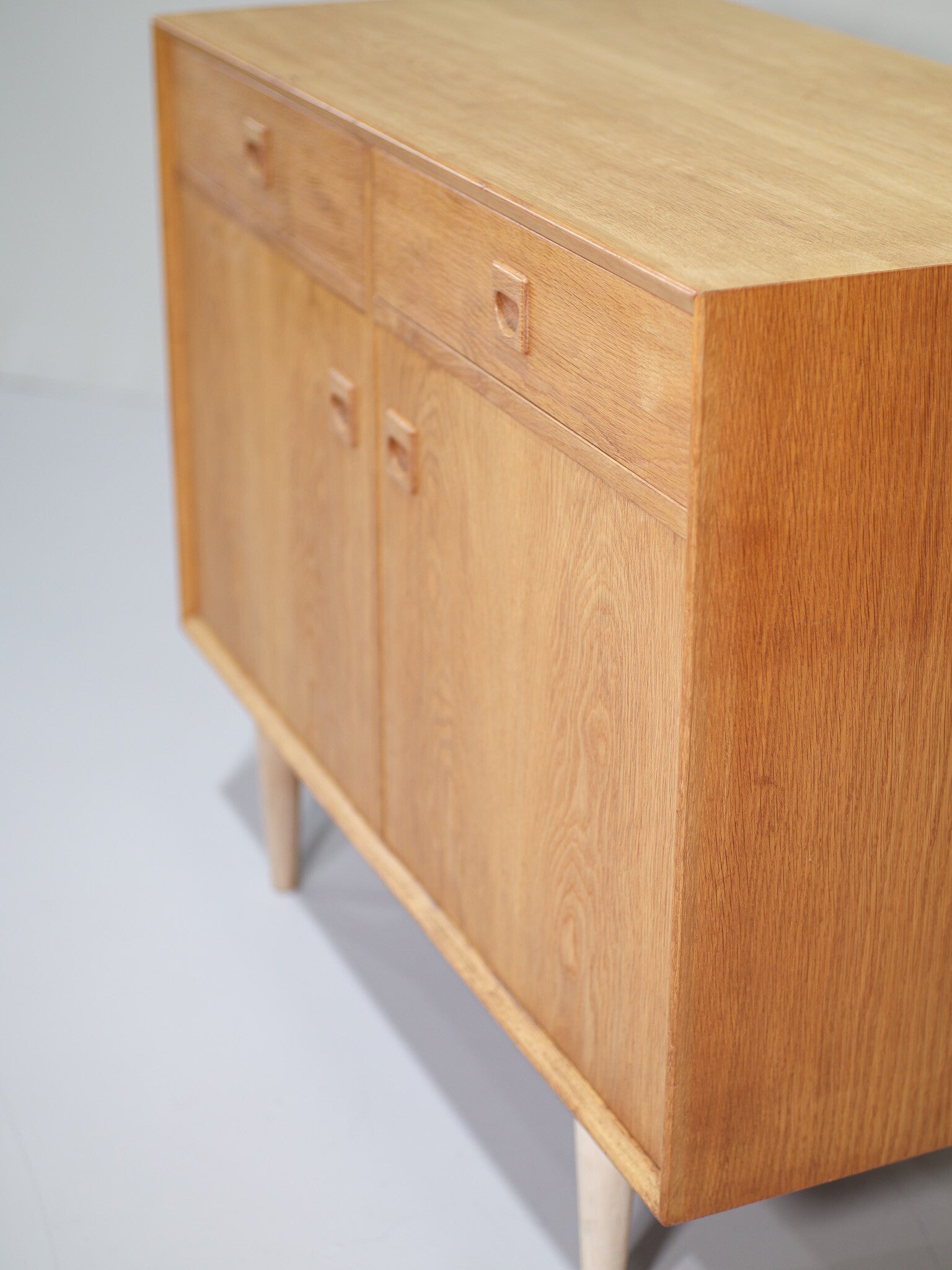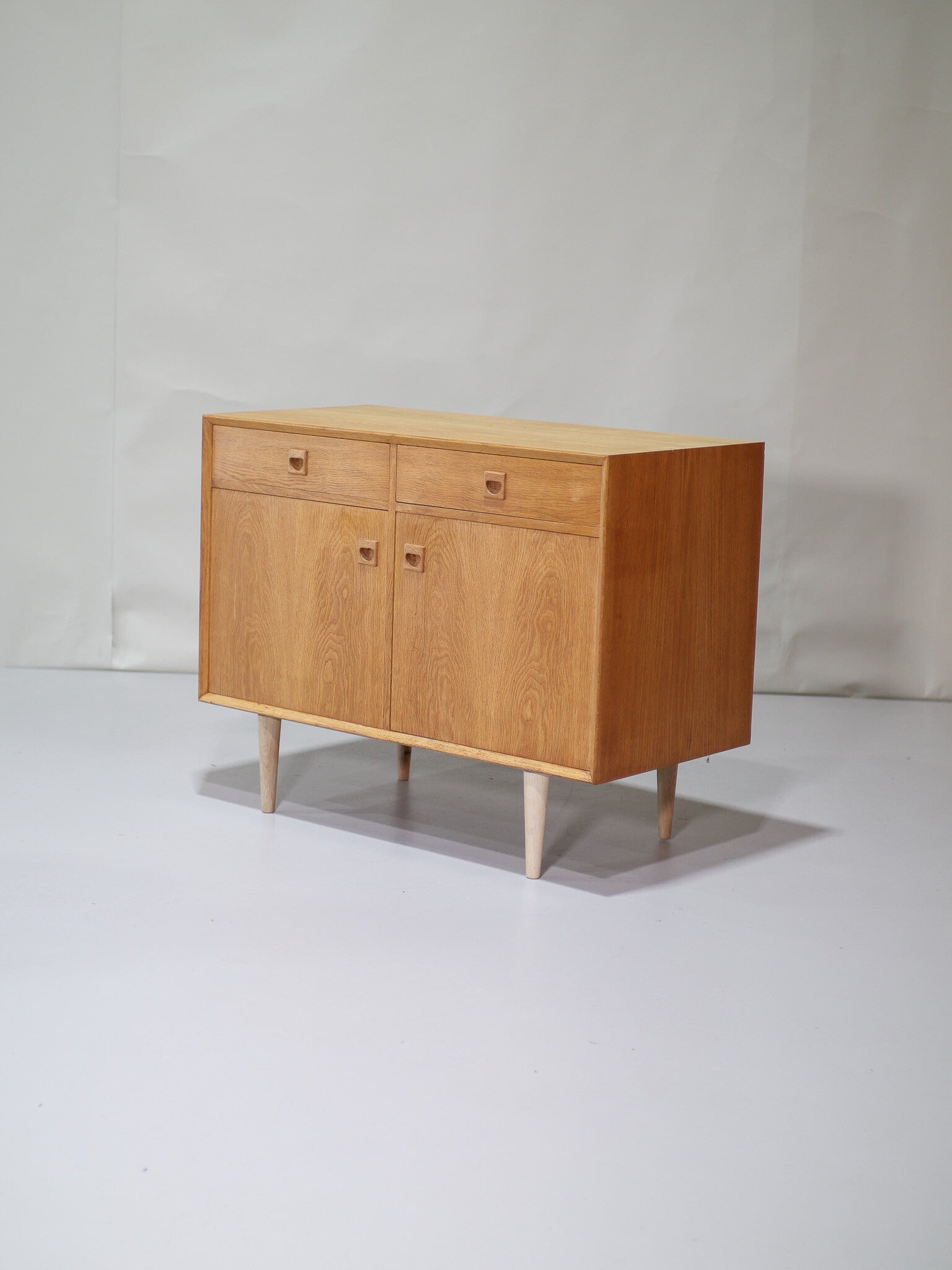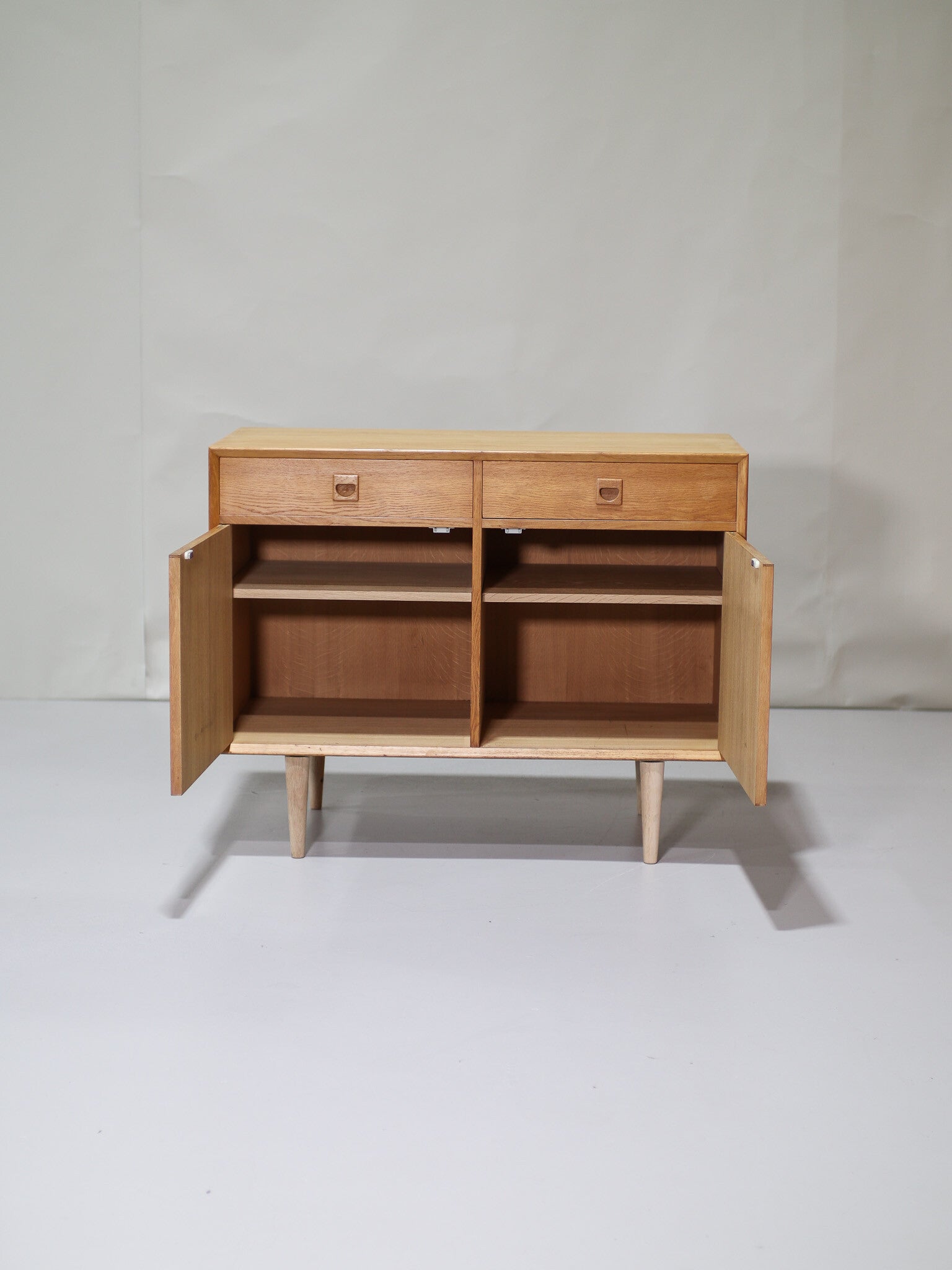 Prachtig dressoir ontworpen door E. Brouer in de jaren '60, Denemarken. Deze kast met twee deuren en twee lades is gemaakt van licht eikenhout. Achter de deuren zitten twee in hoogte verstelbare planken. De kast heeft leuke greepjes en is mooi afgewerkt met een schuine rand. Goed te gebruiken als o.a. platenkast of bouw hem om tot badkamermeubel!