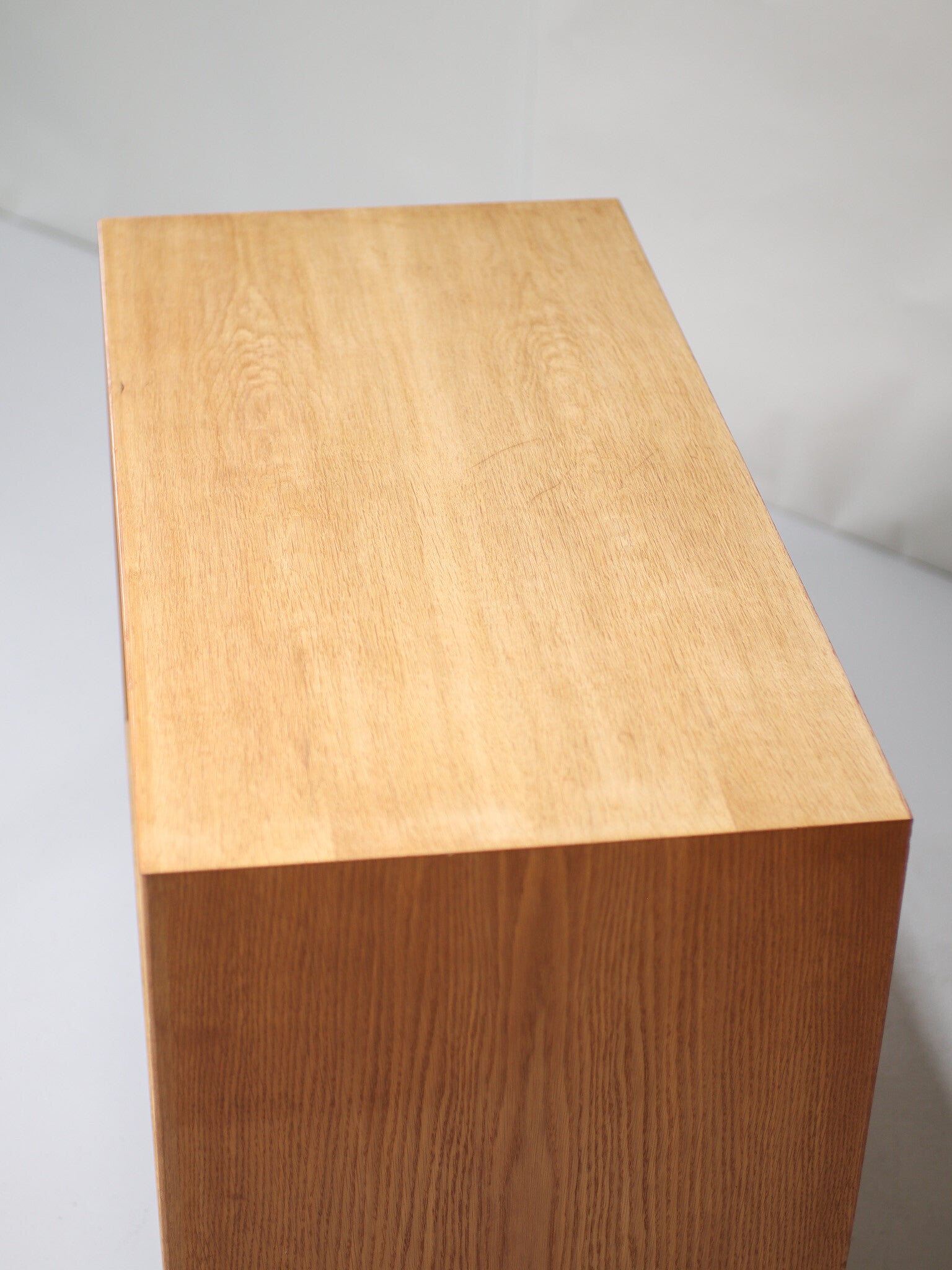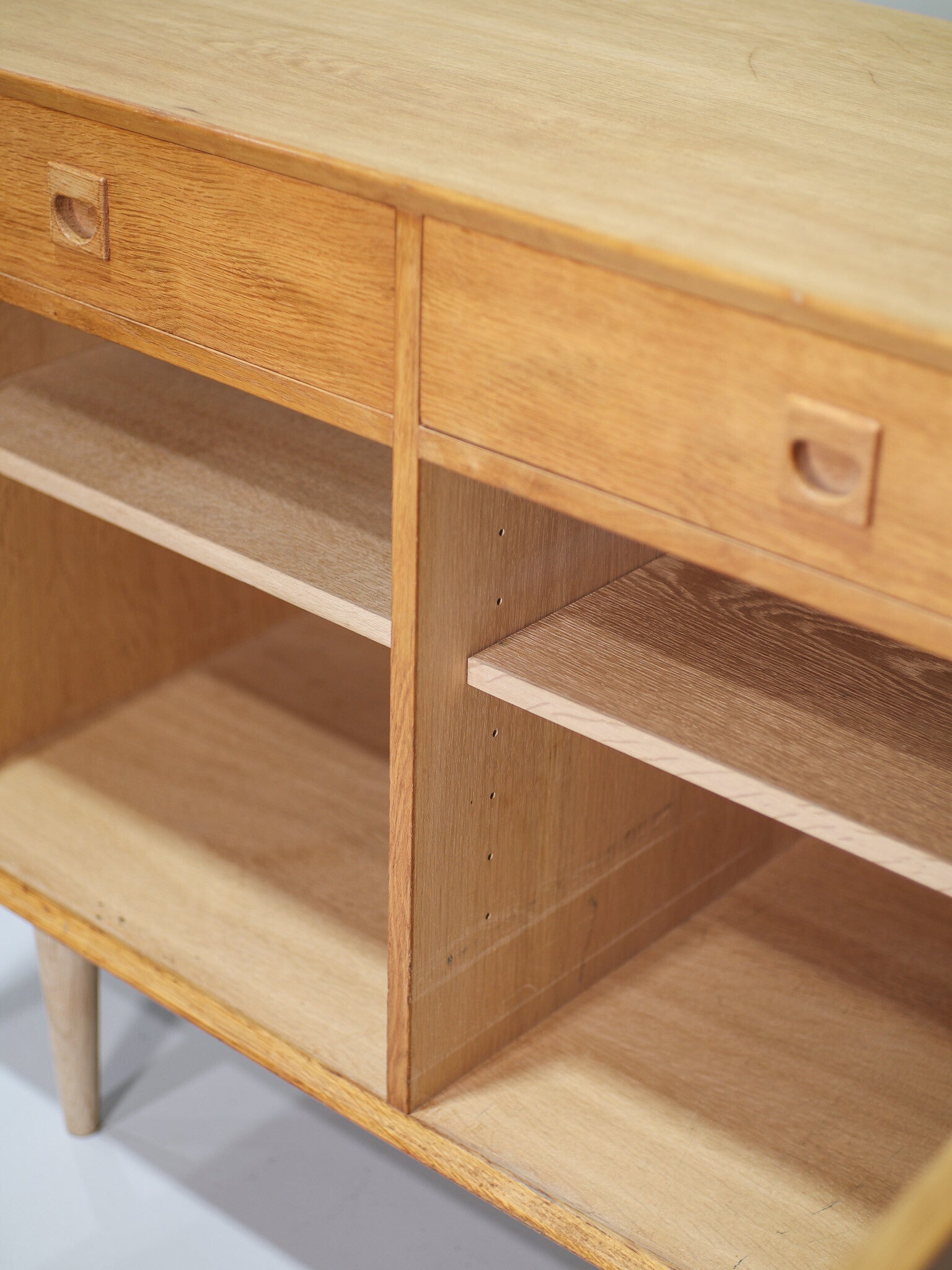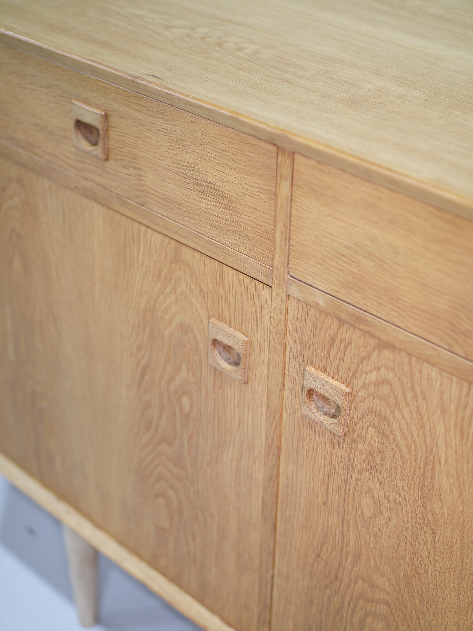 Prachtig dressoir ontworpen door E. Brouer in de jaren '60, Denemarken. Deze kast met twee deuren en twee lades is gemaakt van licht eikenhout. Achter de deuren zitten twee in hoogte verstelbare planken. De kast heeft leuke greepjes en is mooi afgewerkt met een schuine rand. Goed te gebruiken als o.a. platenkast of bouw hem om tot badkamermeubel!