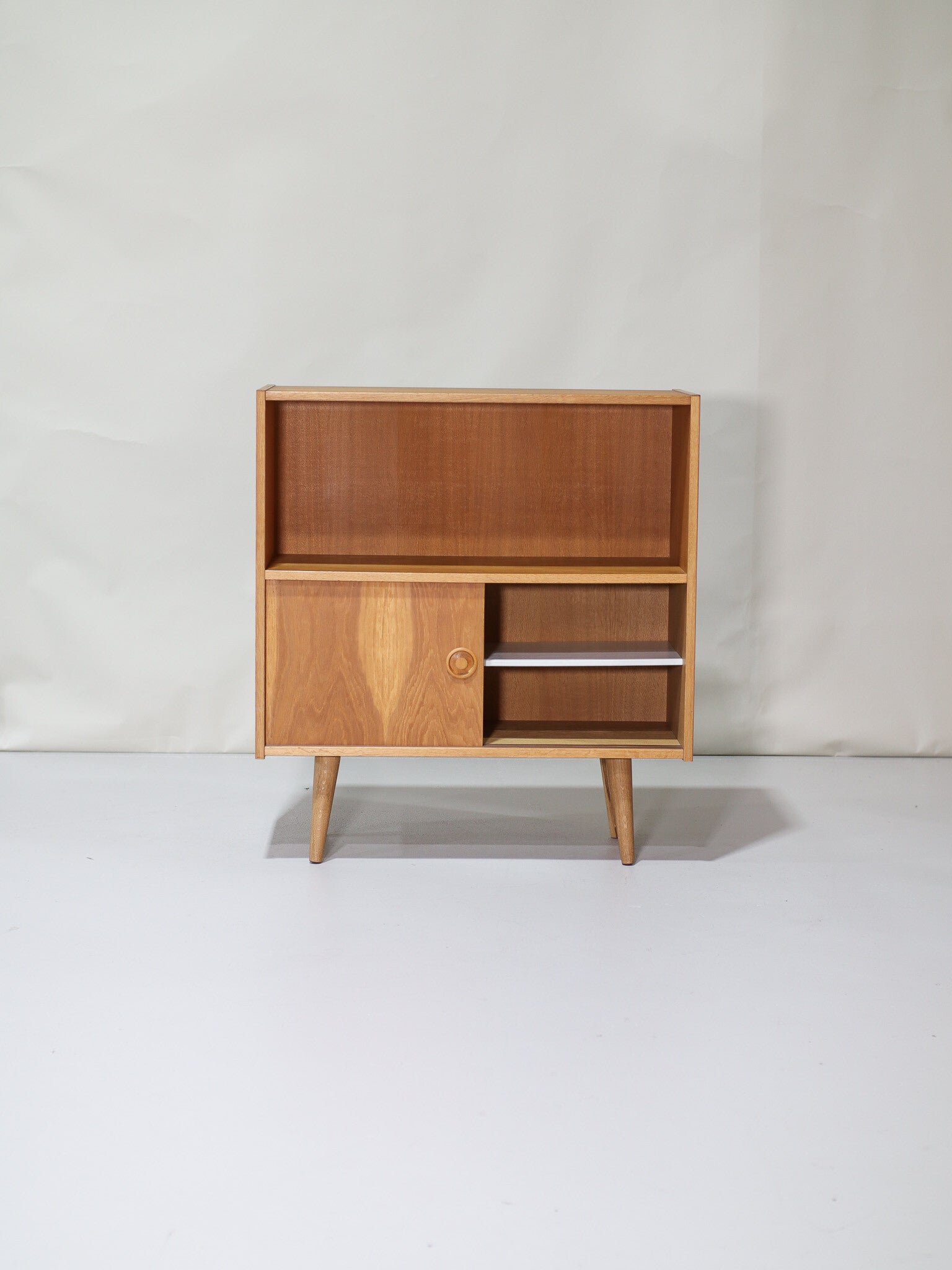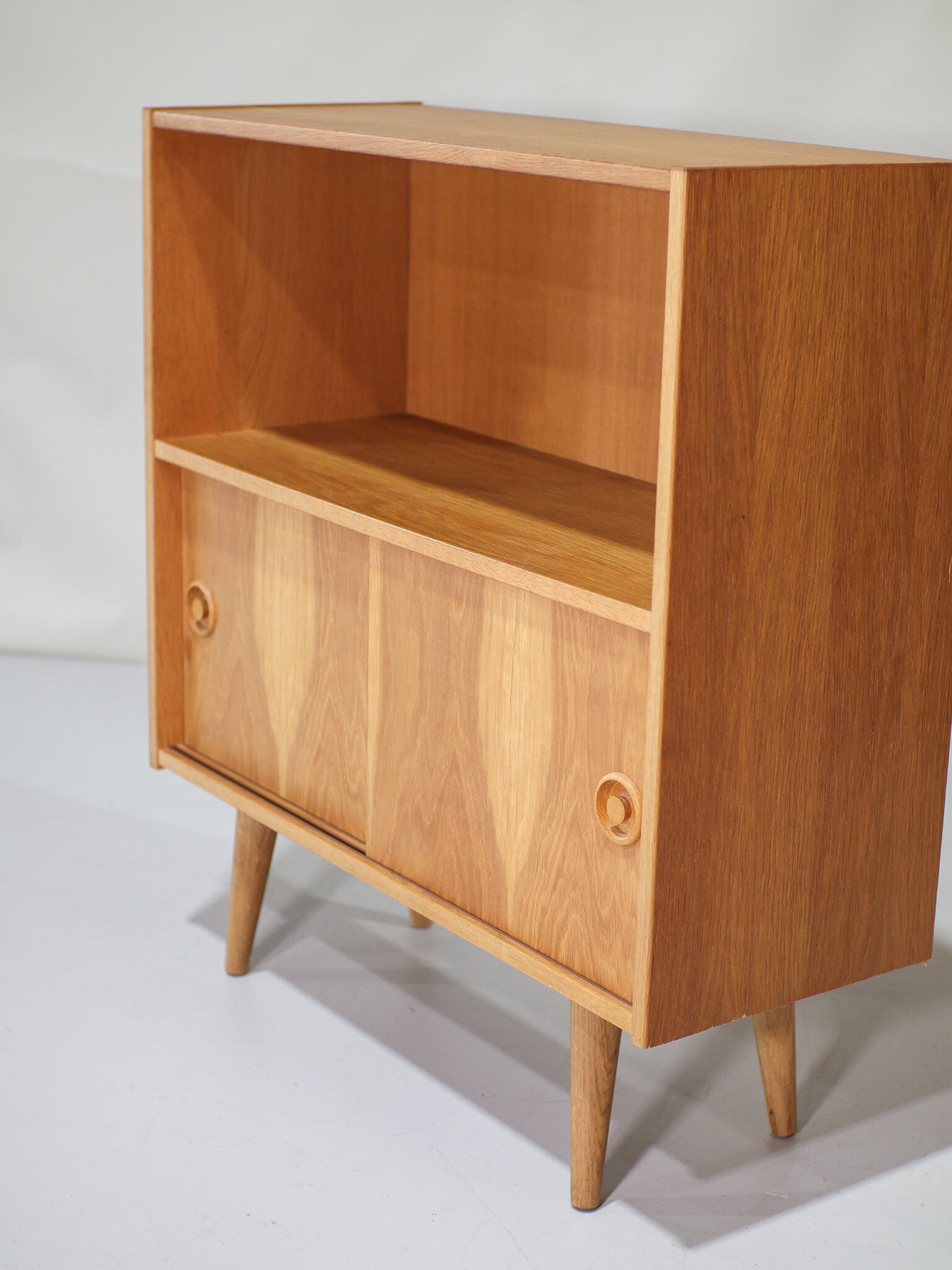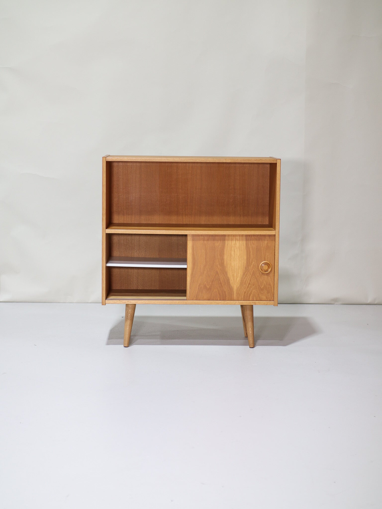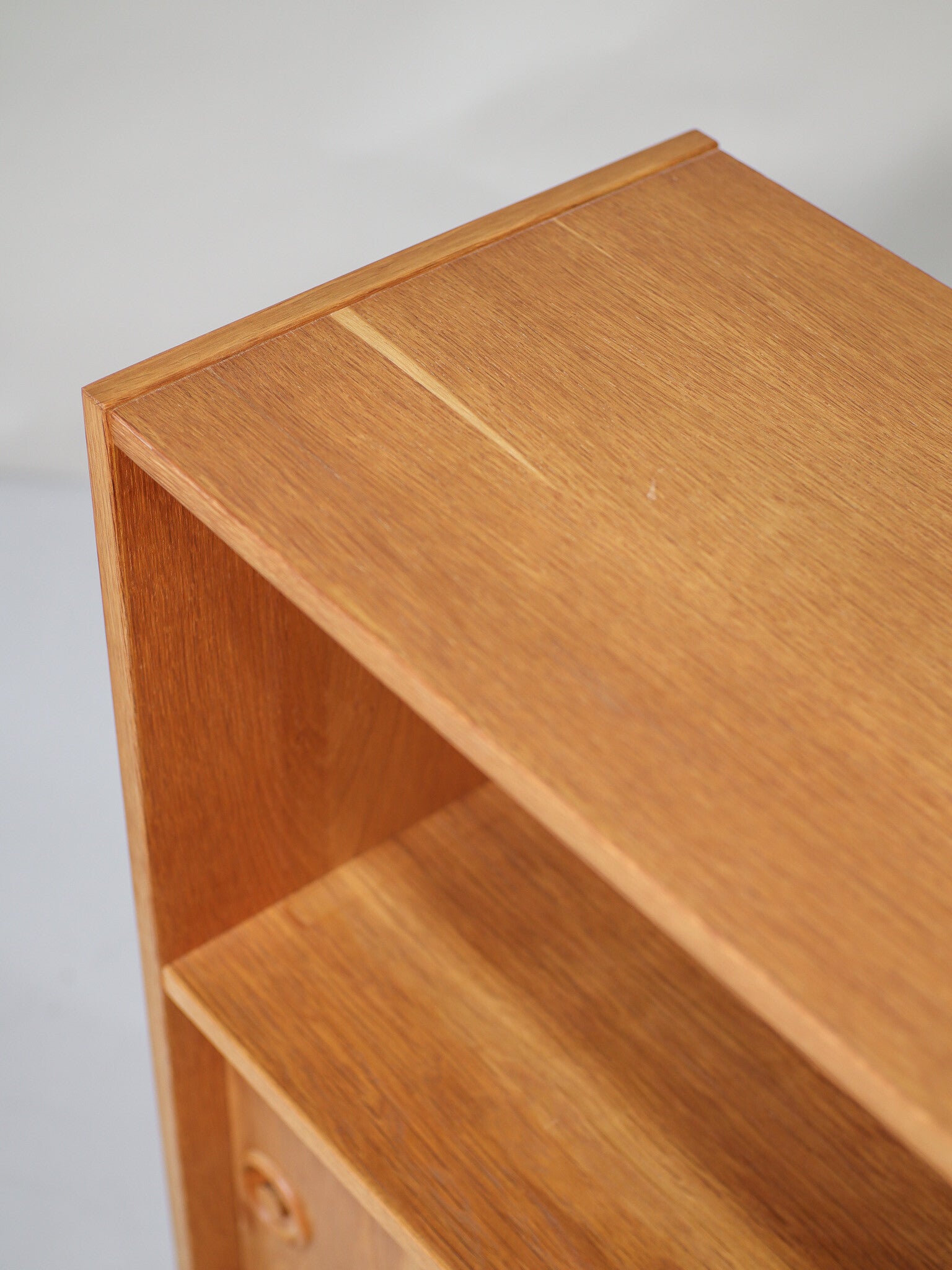 Mooi vintage boekenkastje uit Denemarken, jaren '60. Deze kast is gemaakt van eikenhout met bijzondere houttekening. De twee schuifdeuren hebben unieke ronde houten greepjes. Achter de deurtjes zit een witte legplank.