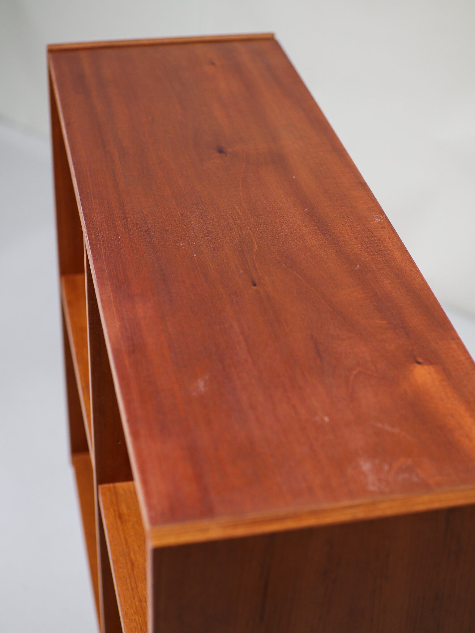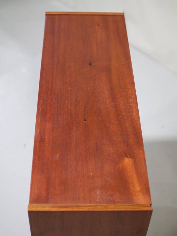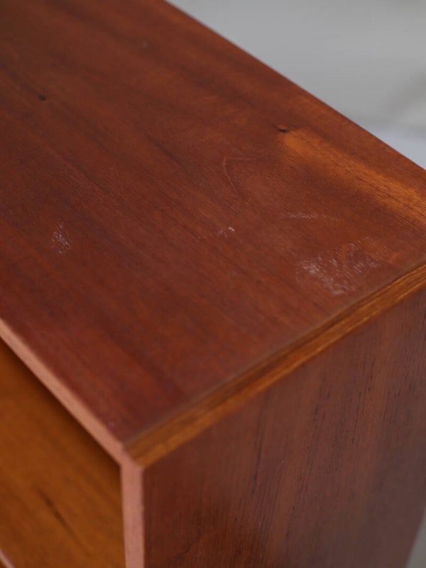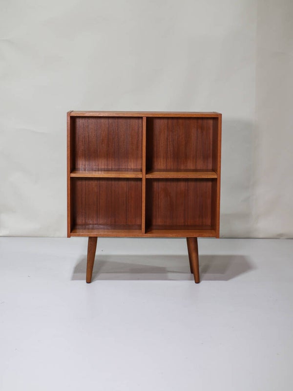 Mooi boekenkastje uit Denemarken, jaren '60. Deze vintage kast is gemaakt van teakhout en heeft twee in hoogte verstelbare planken. De kast staat op mooie hoge schuine poten.