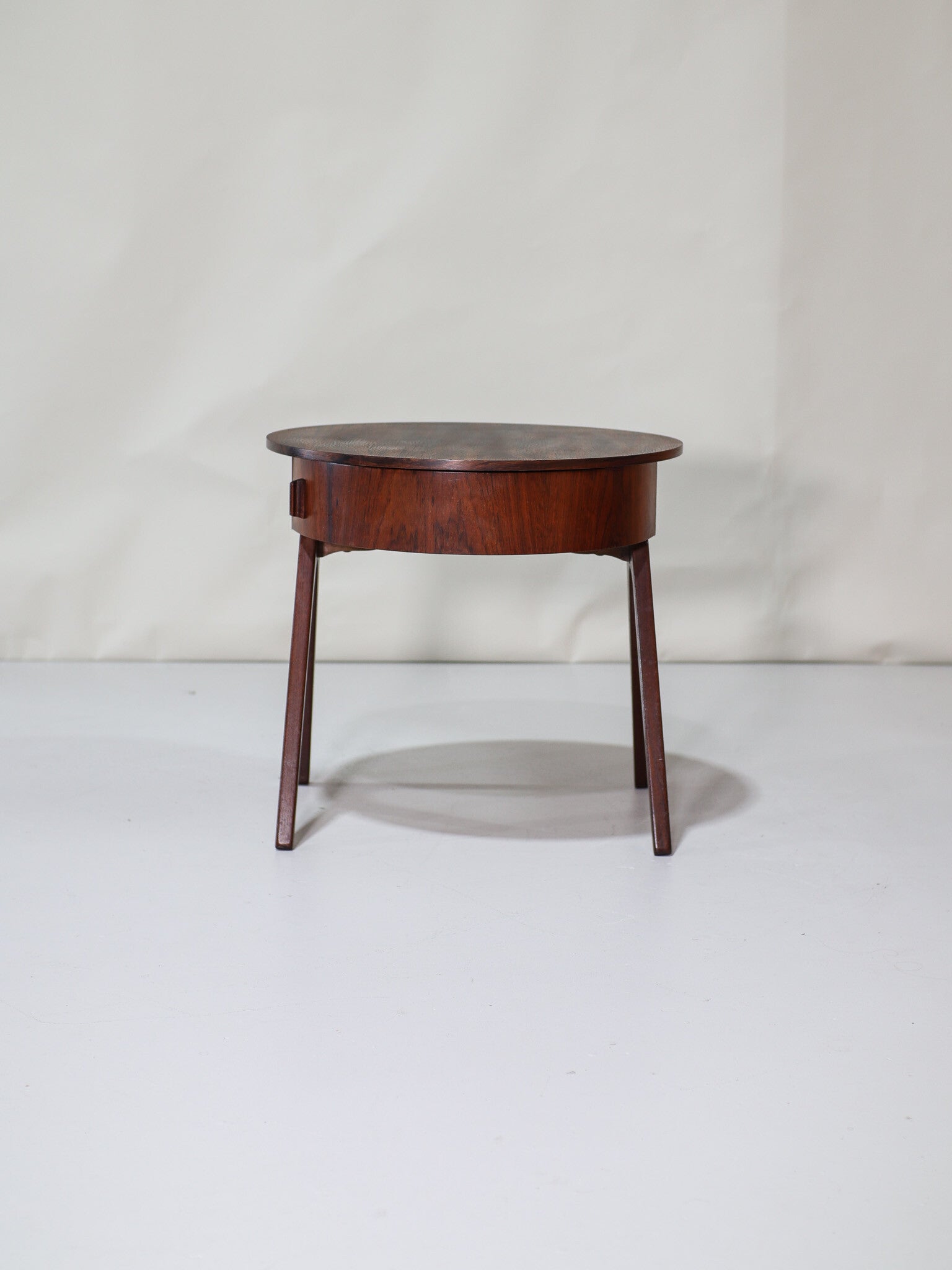 Prachtige ronde bijzettafel uit Denemarken, jaren '60. Deze tafel is gemaakt van bijzonder palissanderhout en heeft twee uitklapbare lades met mooie greepjes. Officieel is dit een naaitafeltje met vakjes voor naaigerei, maar uiteraard is het ook ideaal te gebruiken als bijzettafel of kleine salontafel met handige opbergruimte.