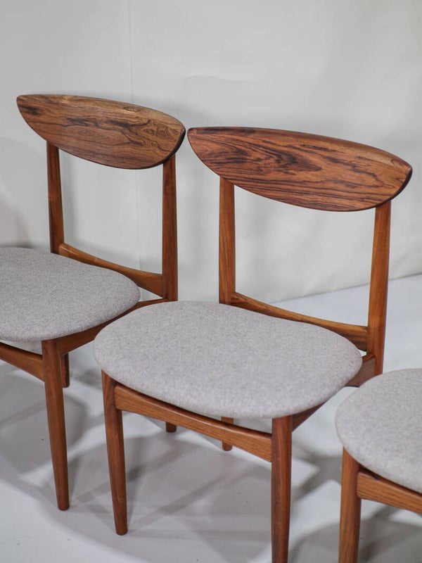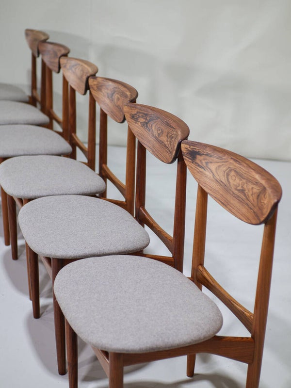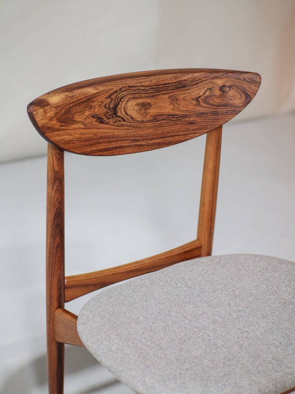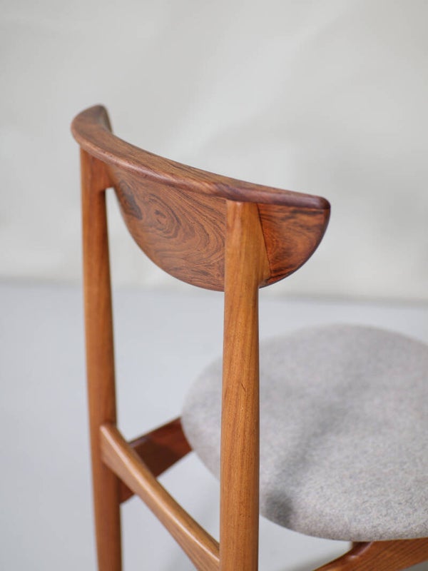 Een set van 6 eetkamerstoelen ontworpen door Kurt Østervig voor K.P. Møbler in Denemarken, jaren '60. De frames hebben een zeer stijlvolle vormgeving en zijn gemaakt van palissanderhout met een prachtige houttekening. De zittingen zijn opnieuw bekleed een lichtgrijze wollen vilt stof. Ware eyecatchers waar je maar naar kunt blijven kijken!