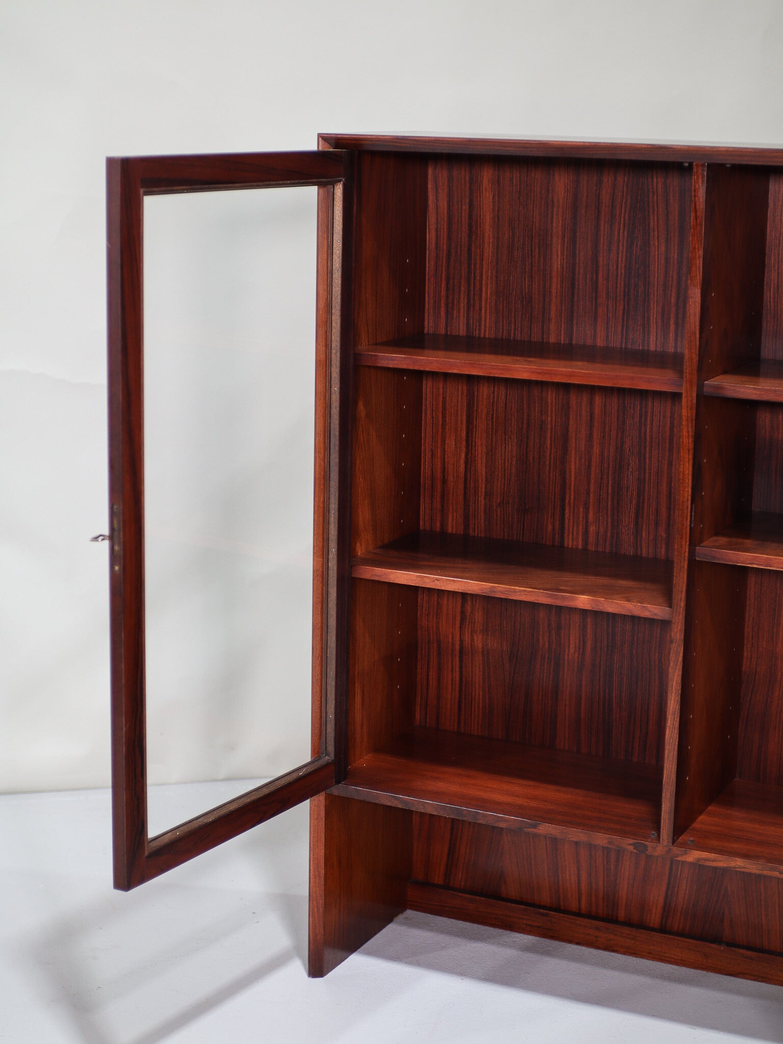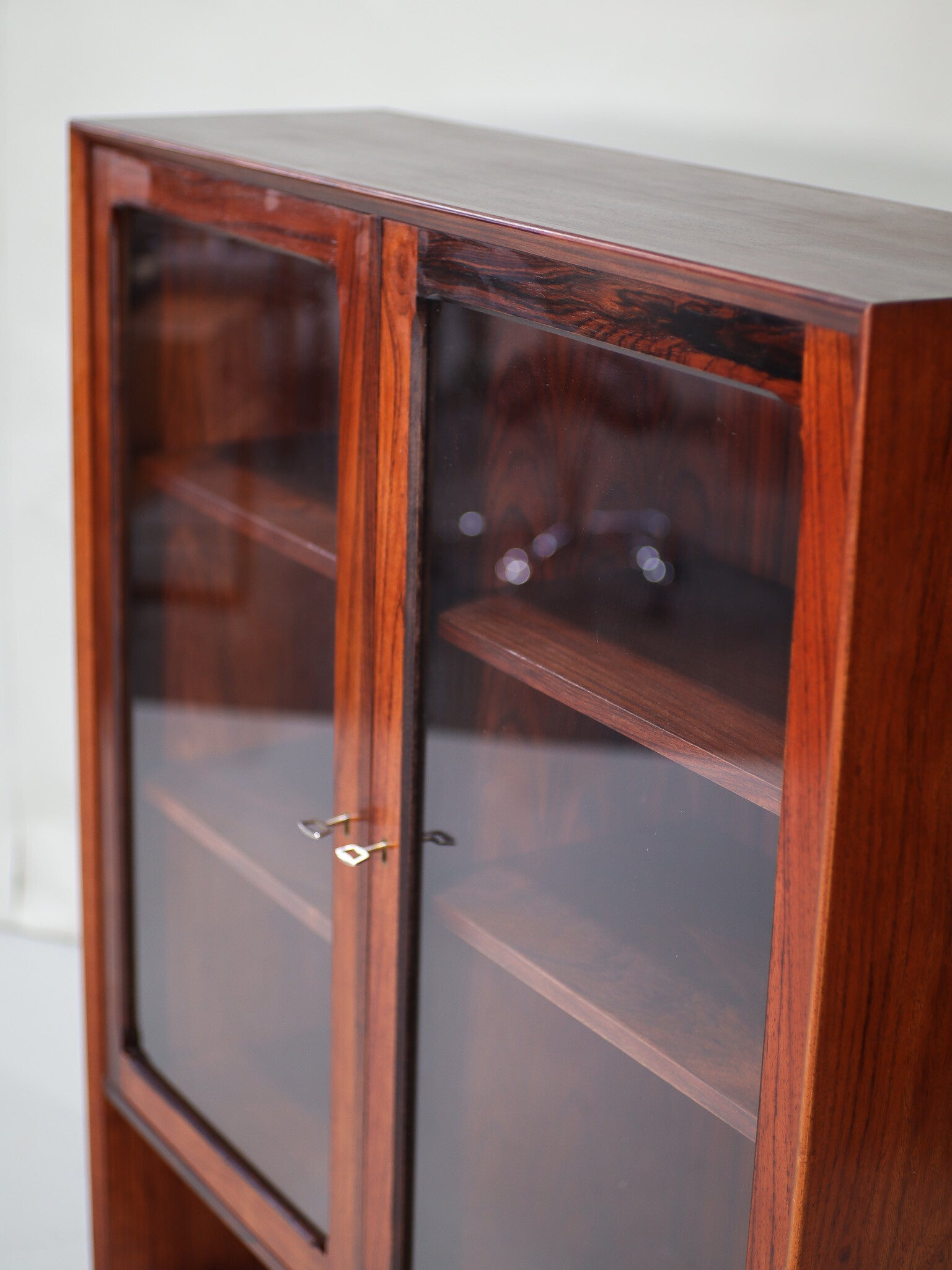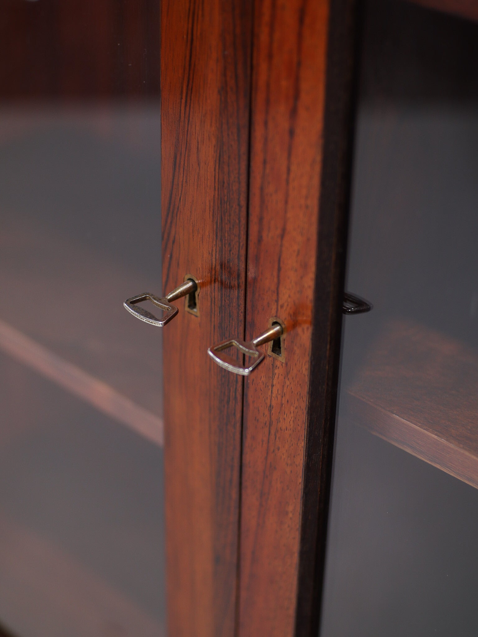 Prachtige vitrinekast ontworpen door E. Brouer voor Brouer Møbelfabrik in Denemarken, jaren '60. Deze kast is gemaakt van palissanderhout en heeft vier in hoogte verstelbare planken achter twee glazen deuren. Ideaal als buffetkast, boekenkast, drankkast etc.